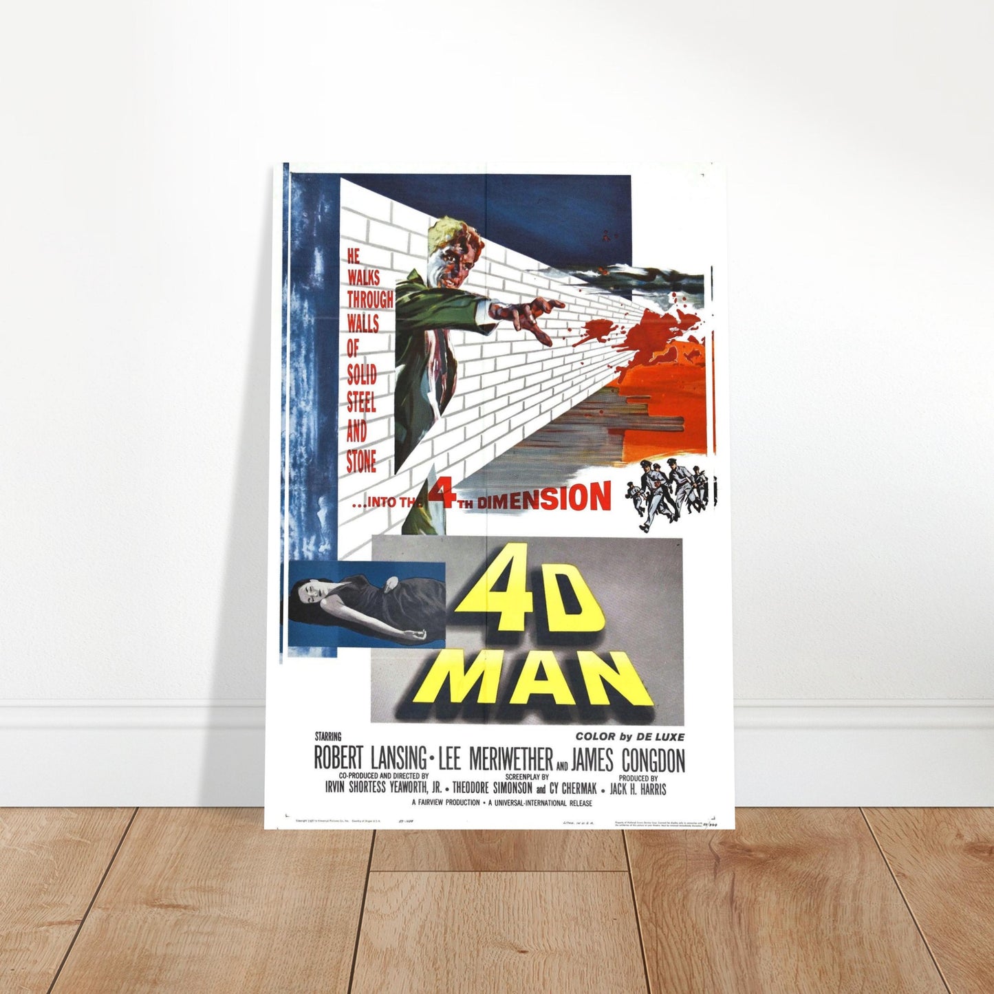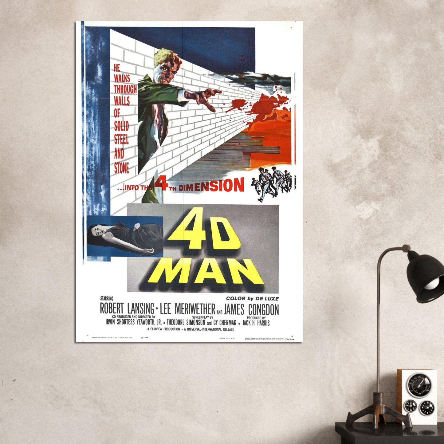 A striking retro science fiction movie poster featuring dramatic 1950s artwork. The design shows a surreal scene with a wall breaking effect and bold red and blue colors. Classic vintage typography and composition capture the essence of golden age sci-fi cinema aesthetics