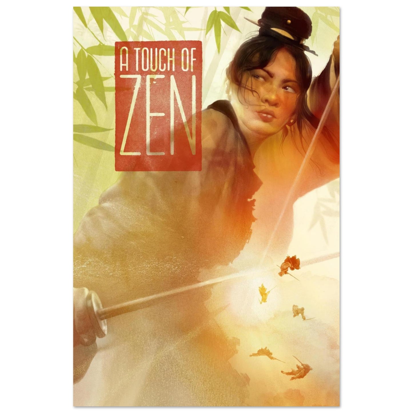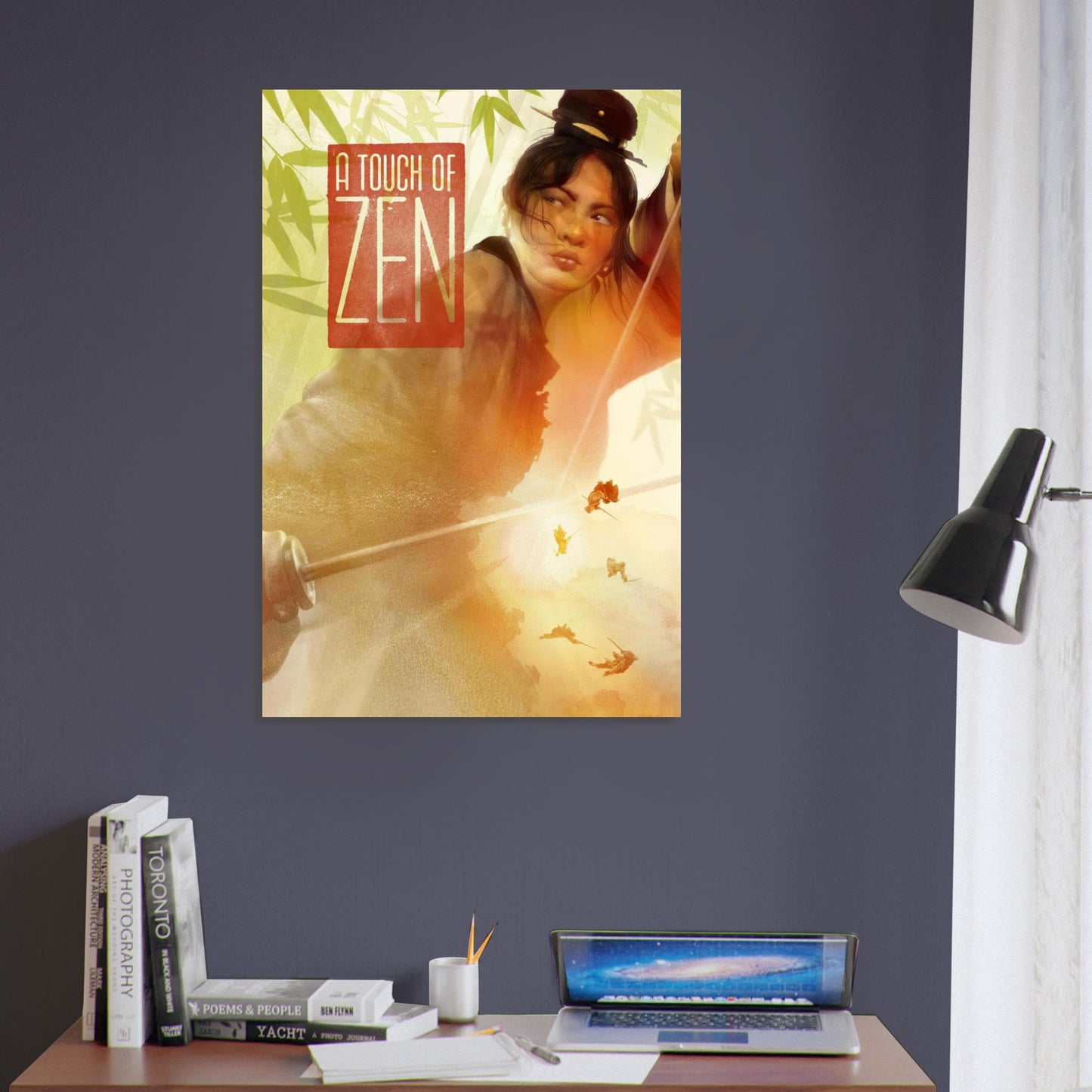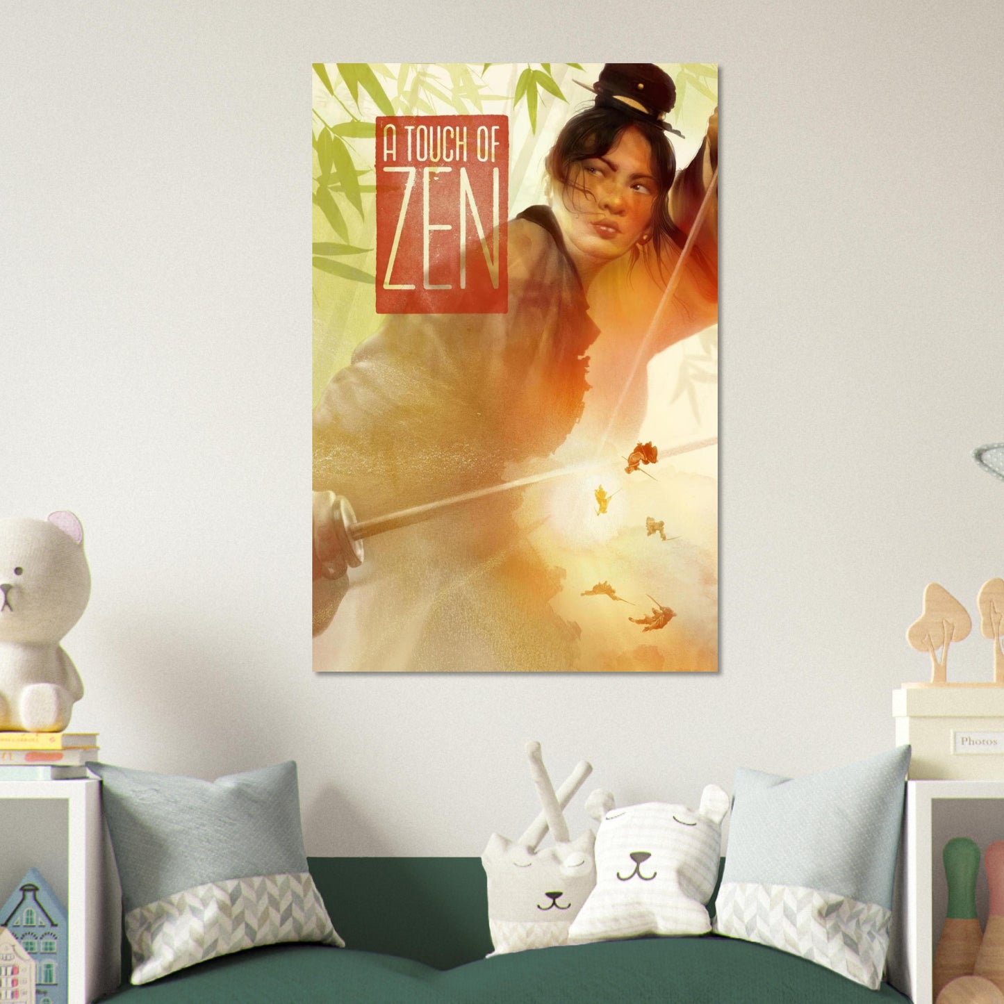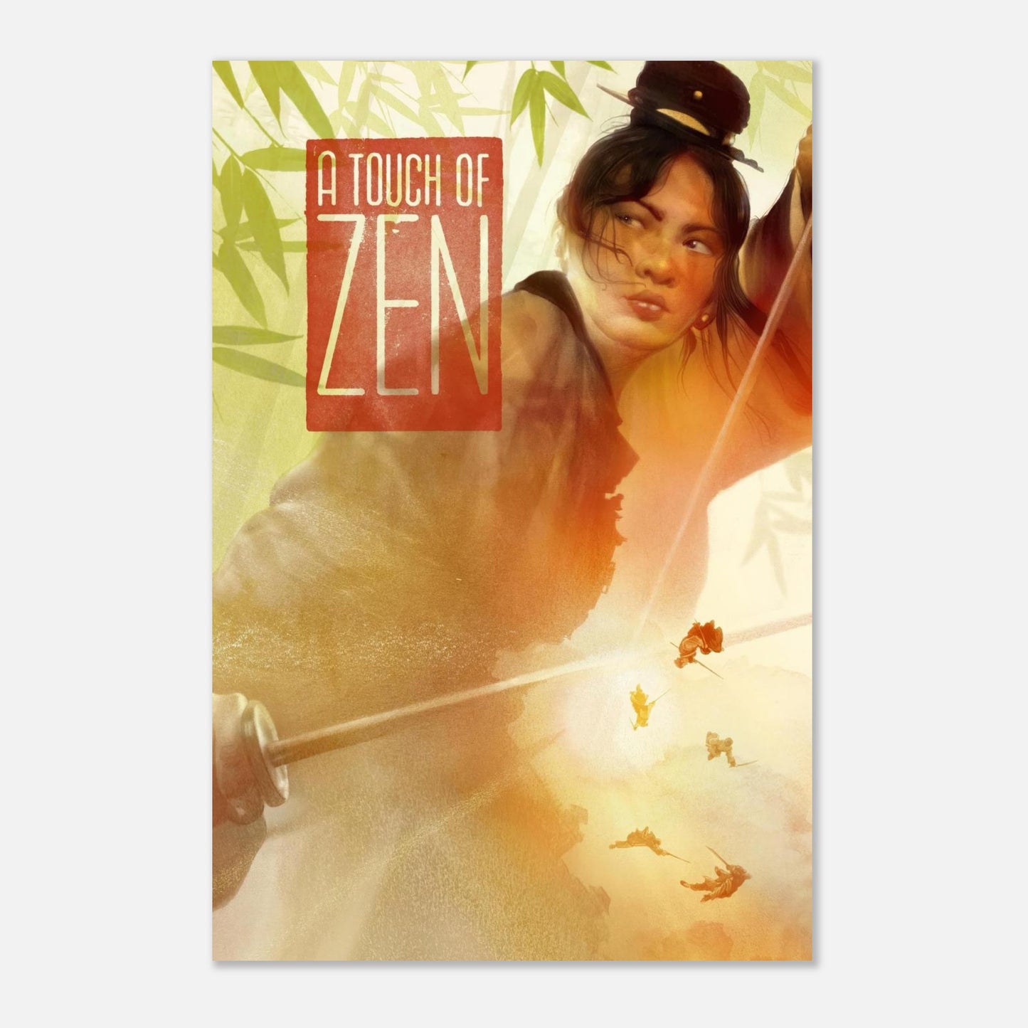 A serene and atmospheric Asian-inspired poster design featuring warm golden hues and delicate bamboo leaves. The composition merges traditional Eastern elements with a contemporary artistic style, creating a peaceful and meditative ambiance. The soft lighting and ethereal quality evoke a sense of tranquility and spiritual connection