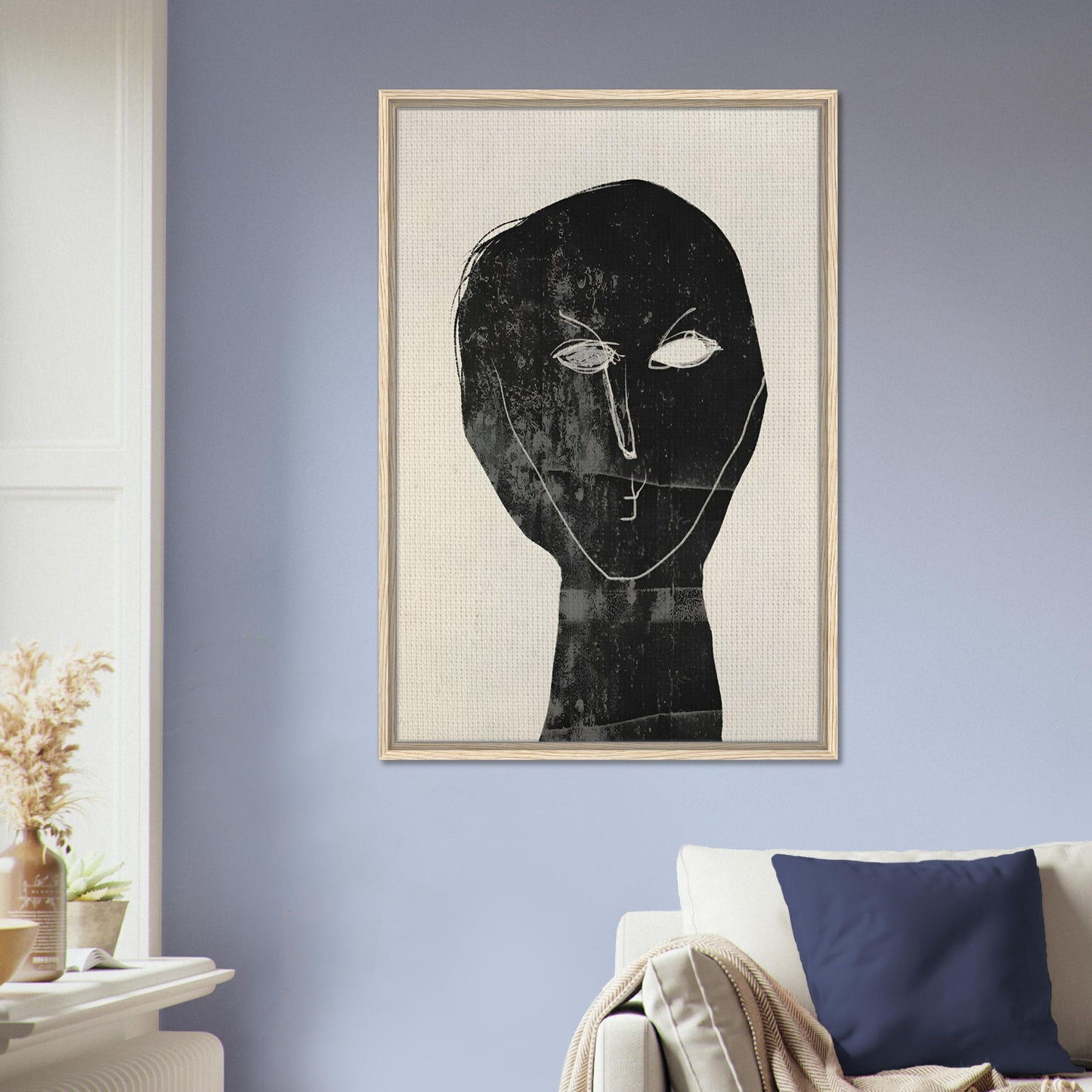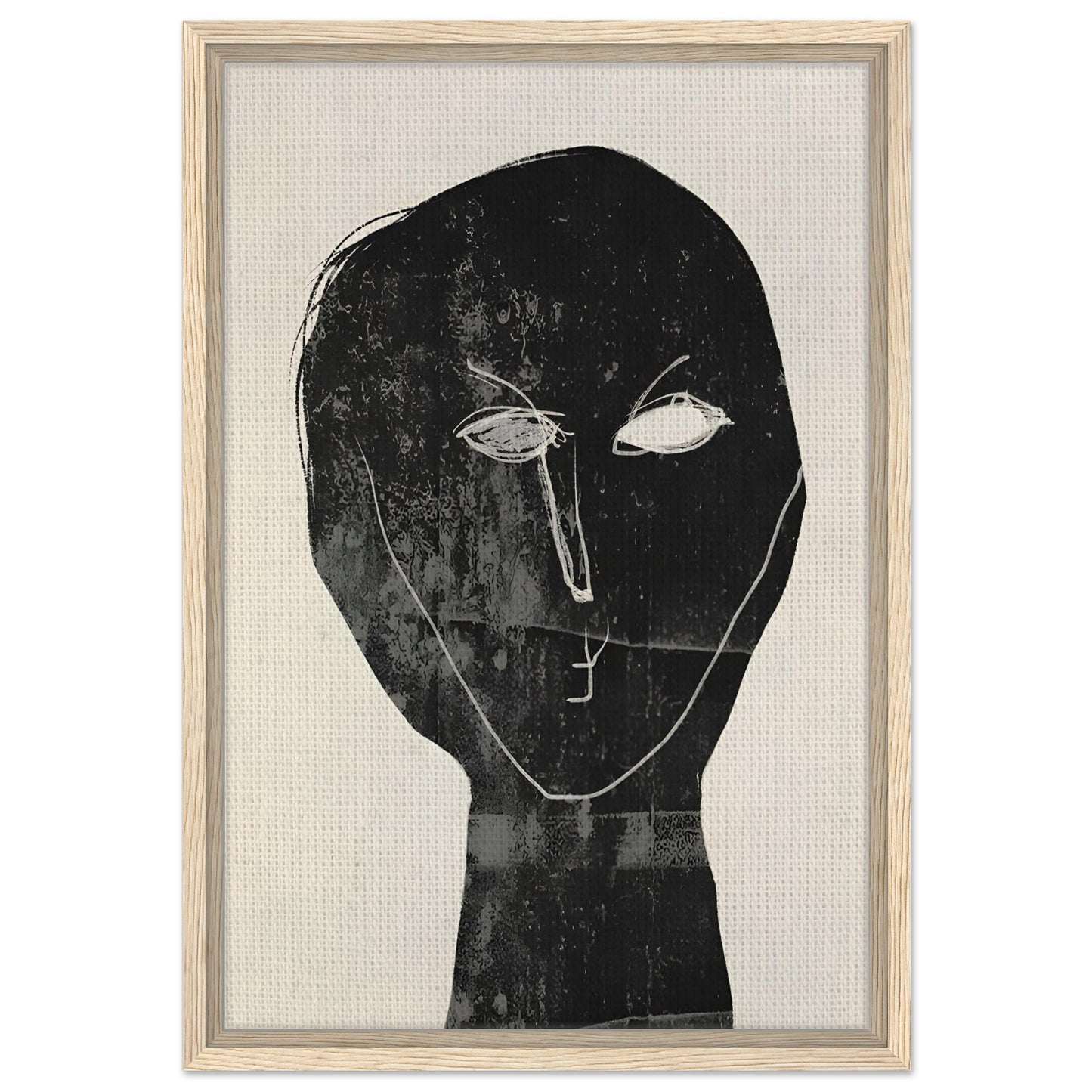 Striking monochromatic abstract portrait featuring bold, minimalist lines against a light background. The stark black face emerges through rough textural elements and simple geometric forms, creating a powerful modernist aesthetic with an enigmatic quality. Perfect for contemporary and modern interior spaces
