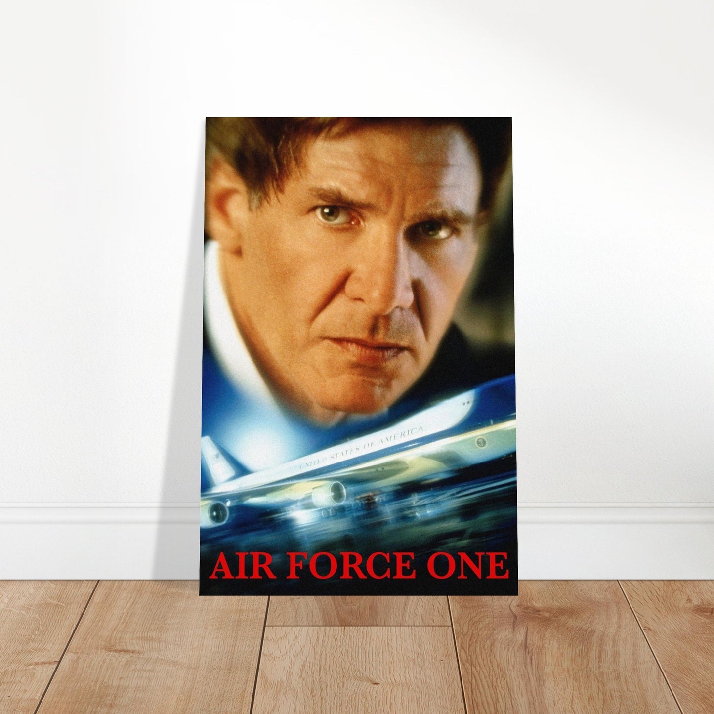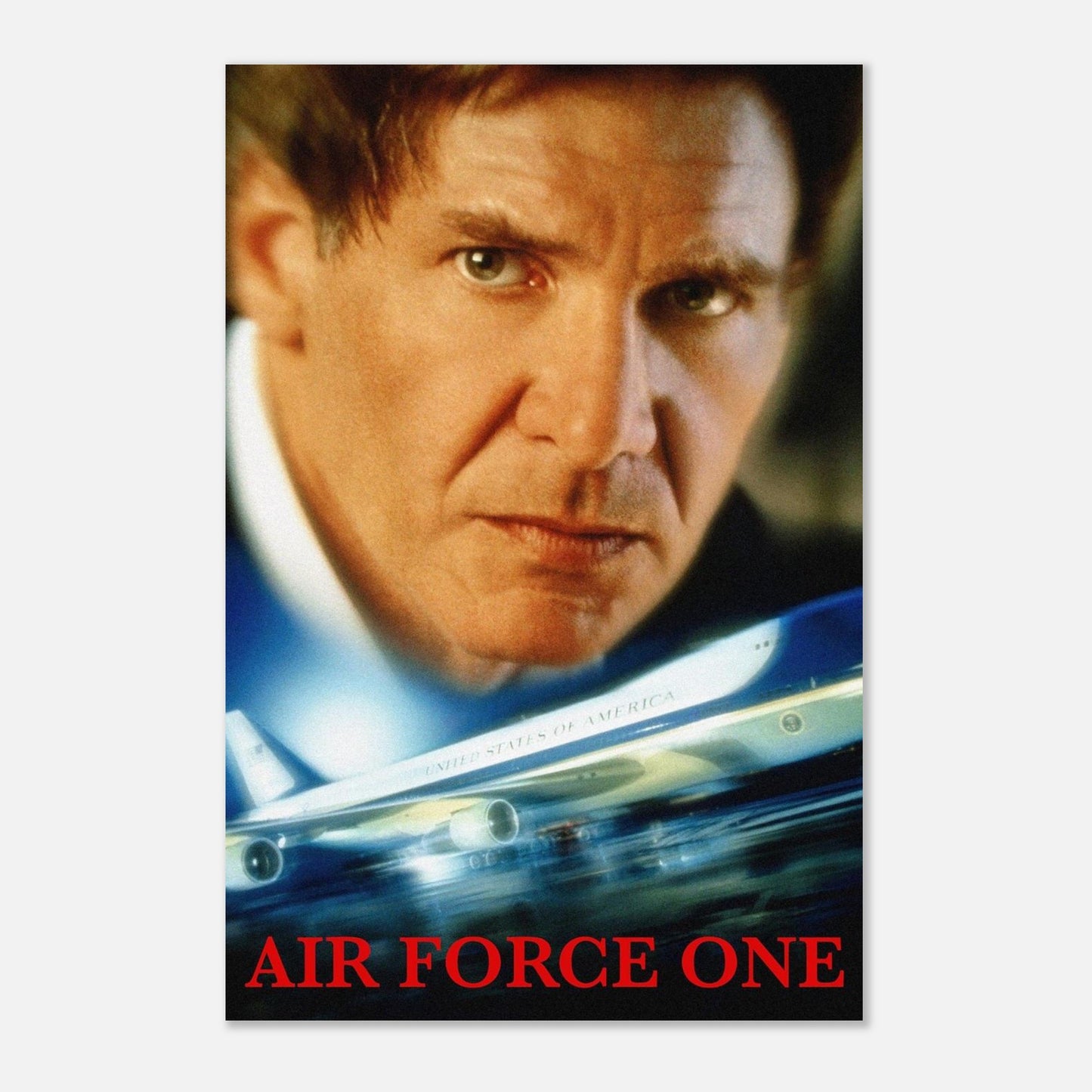Dramatic action movie poster design featuring an intense close-up shot juxtaposed with a sleek presidential aircraft soaring through stormy skies. Rich blue tones and dramatic lighting create a tense, suspenseful atmosphere perfect for this classic 90s political thriller