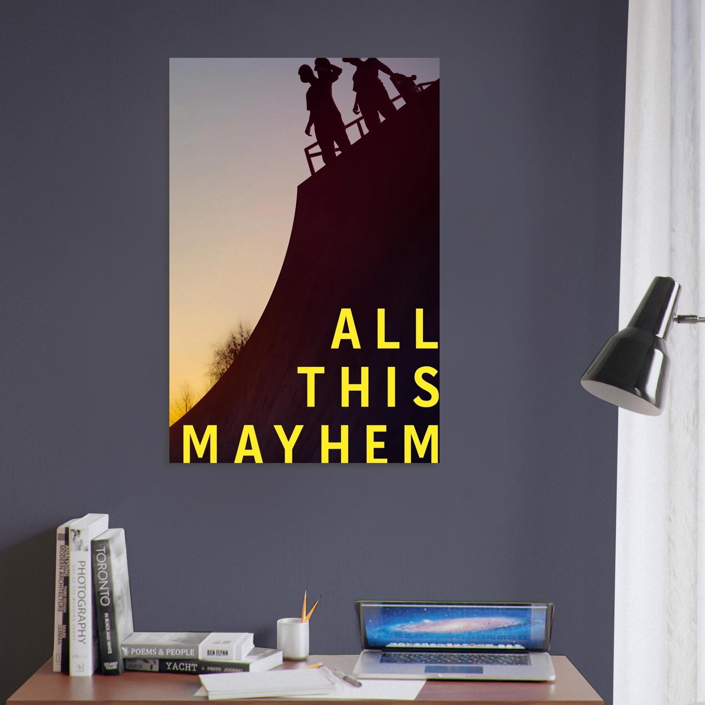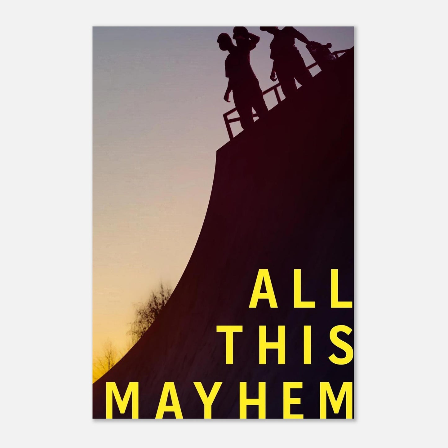 A dramatic silhouette design featuring skateboarders atop a steep ramp against a dusky sunset sky. Bold yellow text 'ALL THIS MAYHEM' creates stark contrast against the dark foreground. The composition captures the rebellious spirit and edgy atmosphere of skateboarding culture with its minimalist yet impactful aesthetic