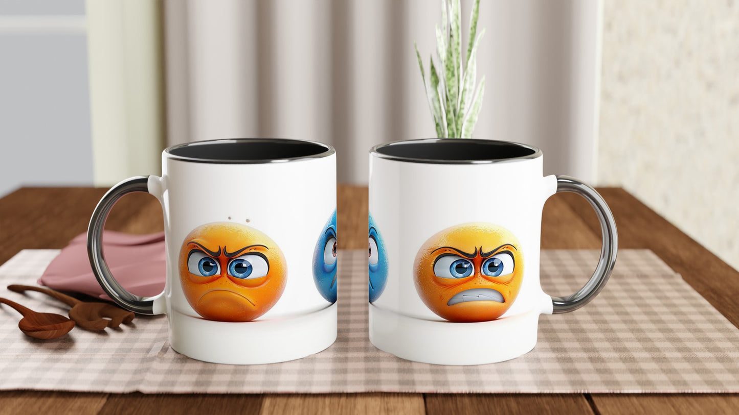 Vibrant emoticon design featuring three expressive angry faces in orange and blue. Each character shows a unique grumpy expression with exaggerated eyebrows and frowns, perfect for those Monday morning coffee moments. Bold colors and comic styling make this a playful addition to any mug collection. ,