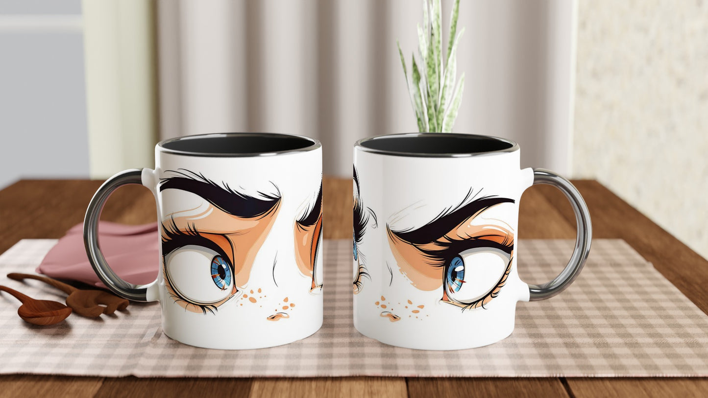 This beautiful ceramic mug is perfect for any event of the day. Your morning coffee, a hot chocolate, or any other hot beverage you enjoy. The mug is glossy white with a colored rim, inside, and handle. The prints come out beautifully and vividly on it. The print retains its quality and luster when used in both microwaves and the dishwasher.