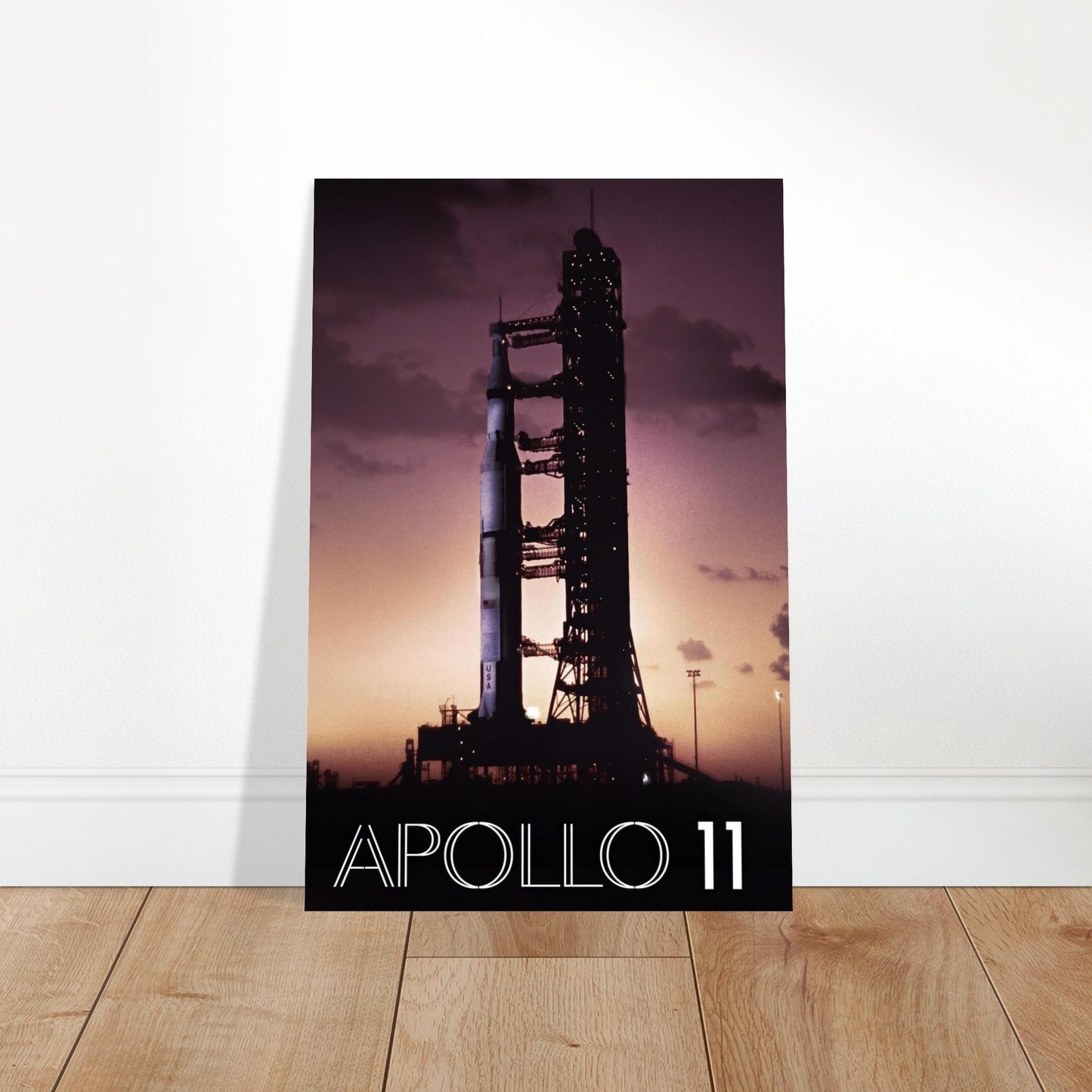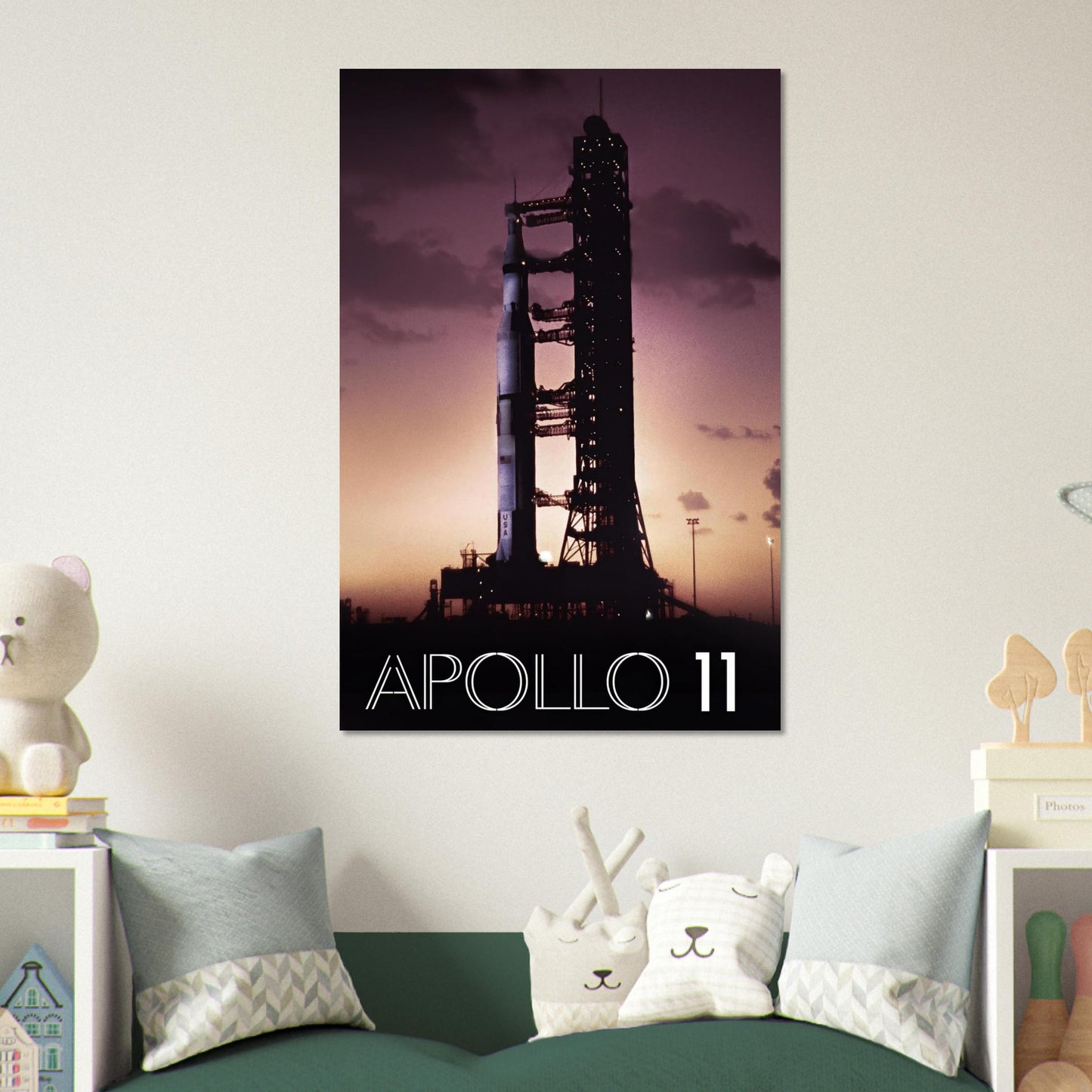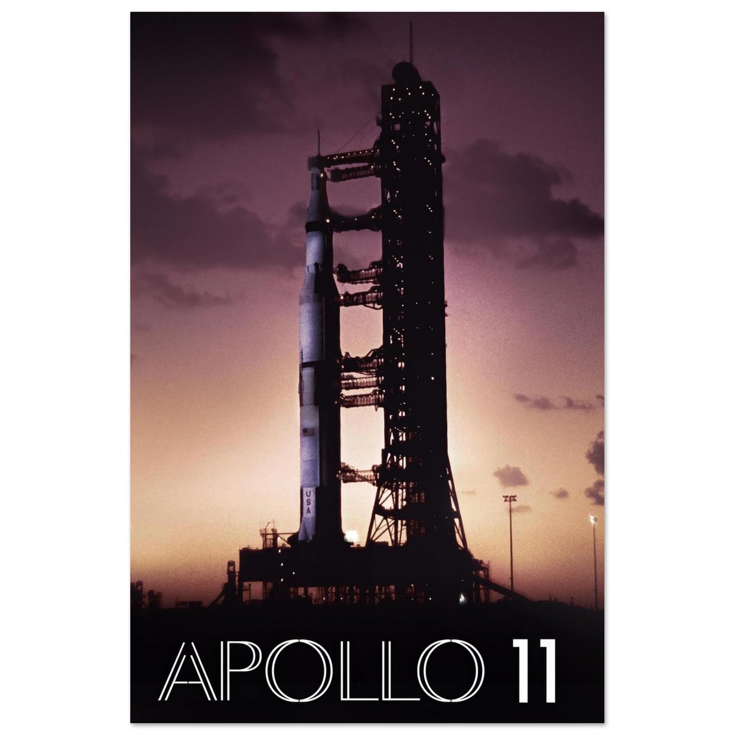 A dramatic silhouette of the Saturn V rocket on its launch pad against a mesmerizing purple and orange sunset sky. The iconic Apollo 11 text appears in sleek, futuristic typography. This atmospheric composition captures the historic moment before mankind's greatest space adventure