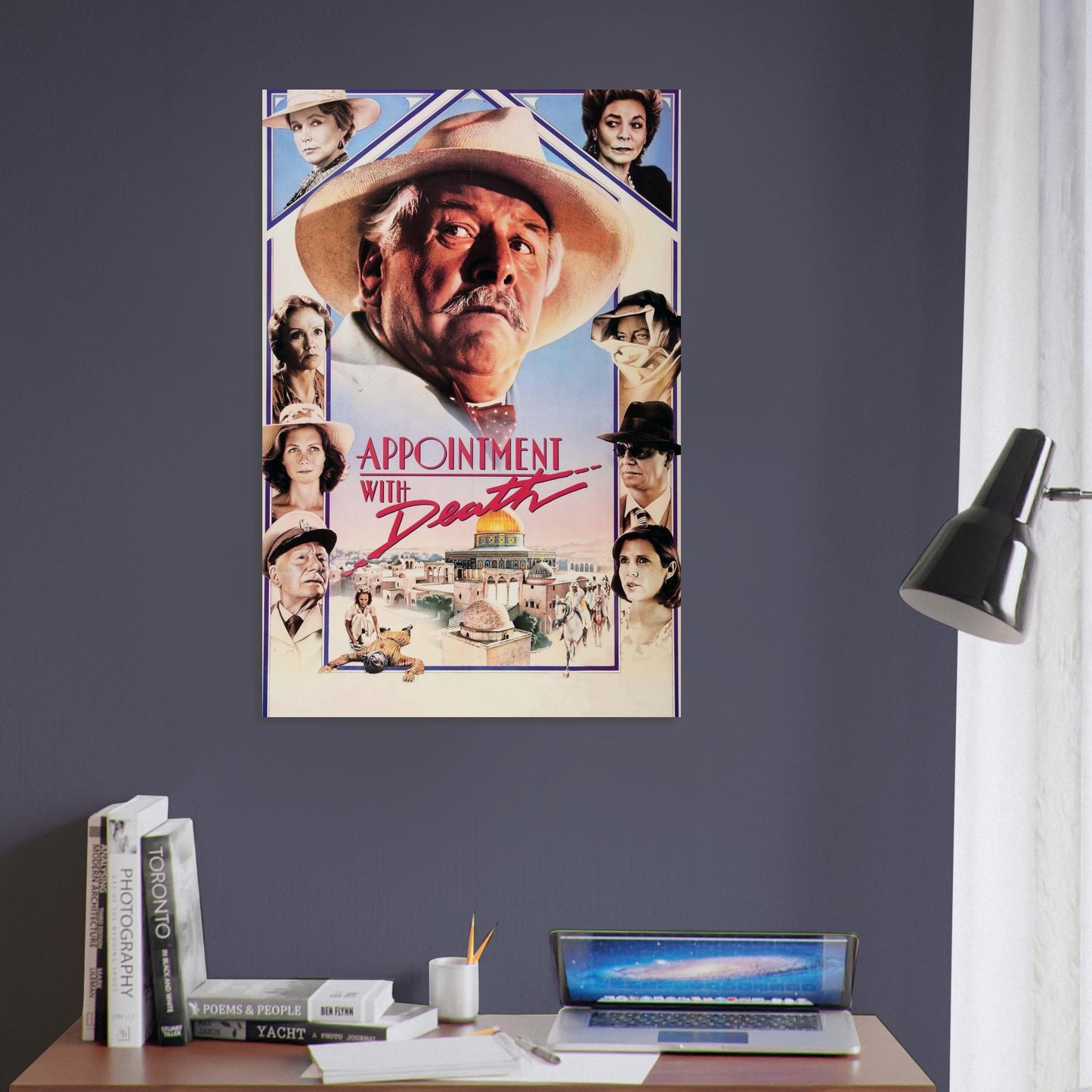 Dramatic vintage-style movie poster artwork featuring a striking composition with a central figure in a cowboy hat against a blue sky. Multiple character portraits arranged in triangular frames around the edges, with a desert landscape and Middle Eastern architecture below. Classic 1980s film poster design with bold red typography