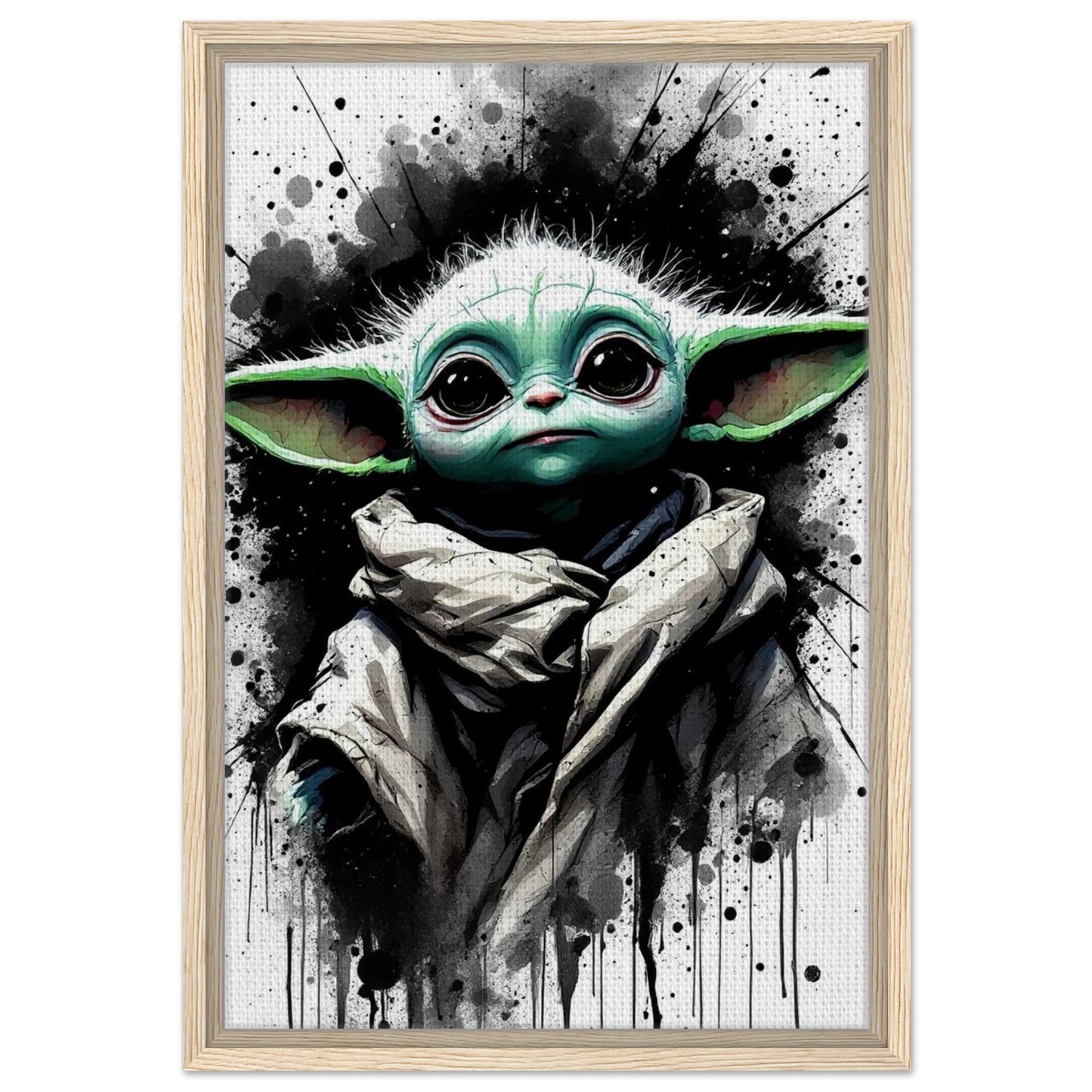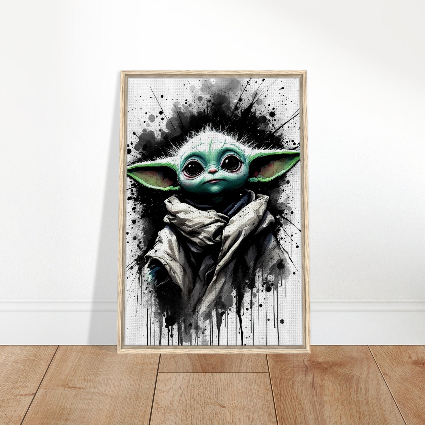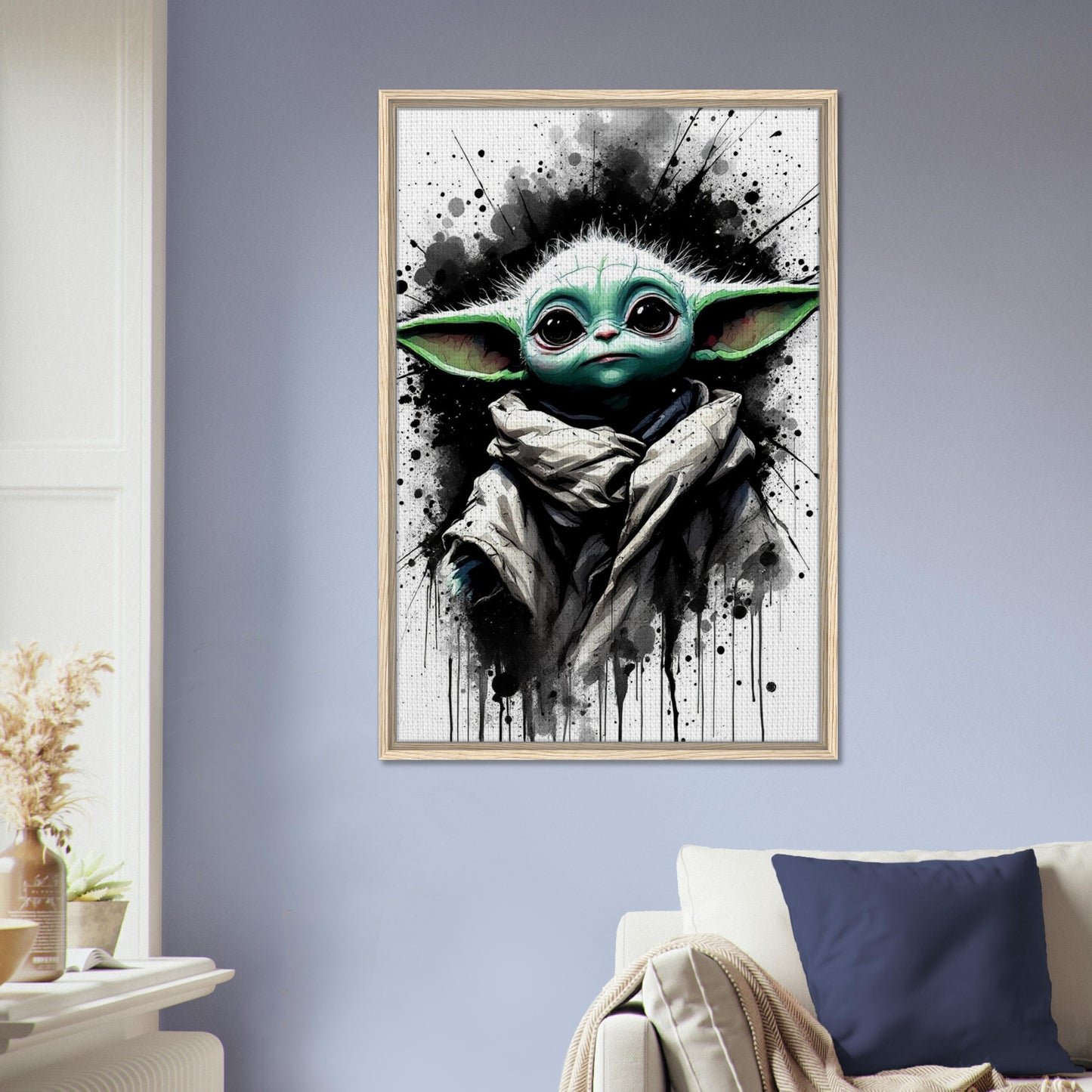 Striking watercolor-style portrait featuring a cute alien character against dramatic black ink splatter effects. The vibrant turquoise details and large expressive eyes pop against the monochromatic background. Bold dripping paint effects create an artistic, contemporary feel perfect for fans of pop culture art