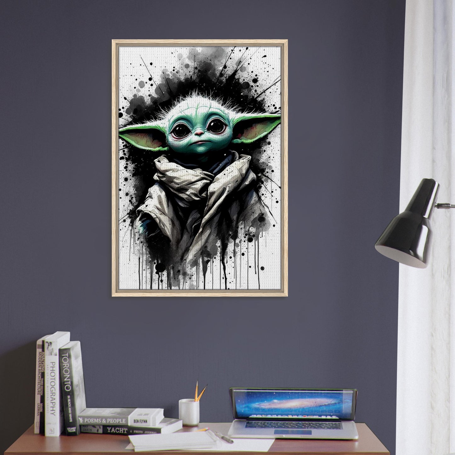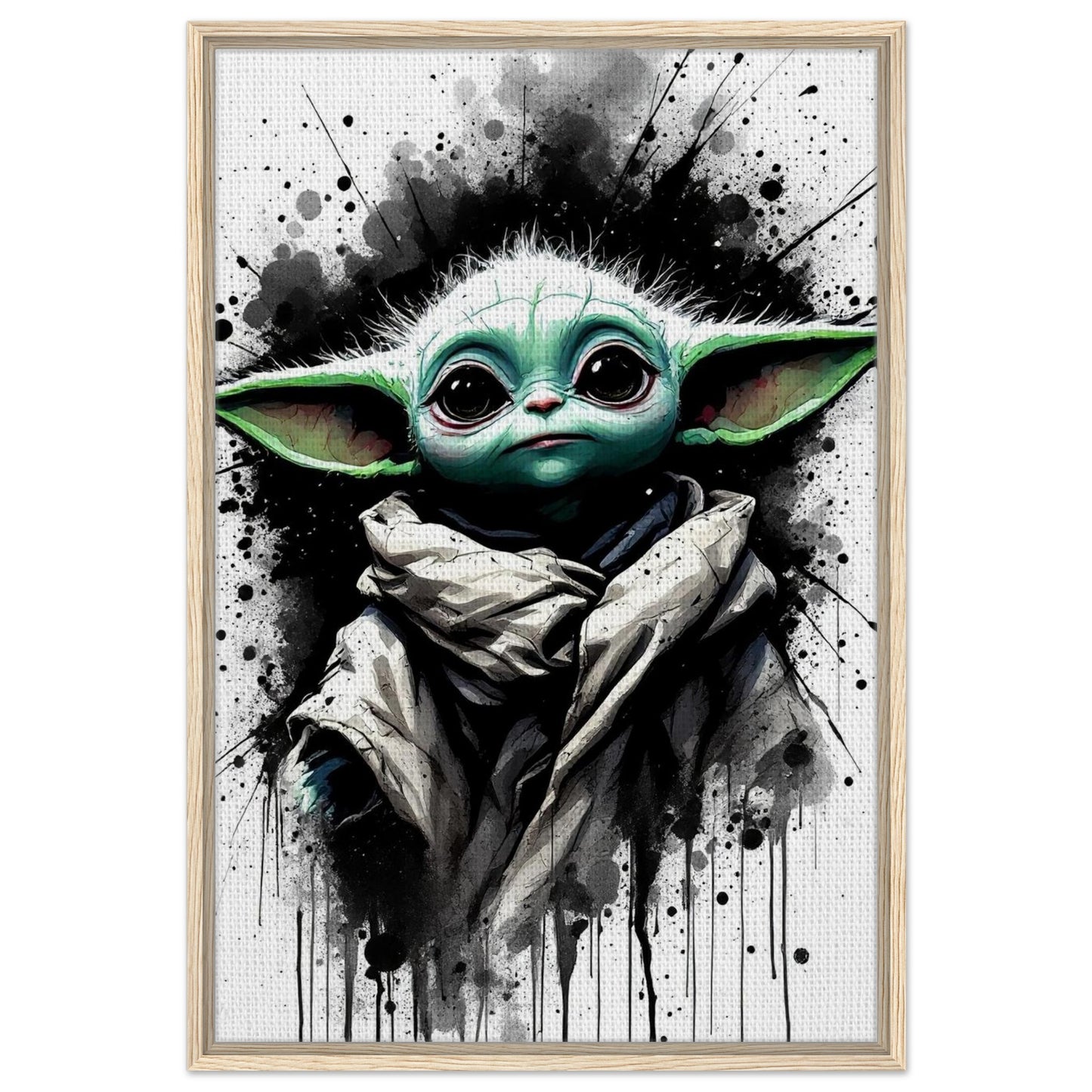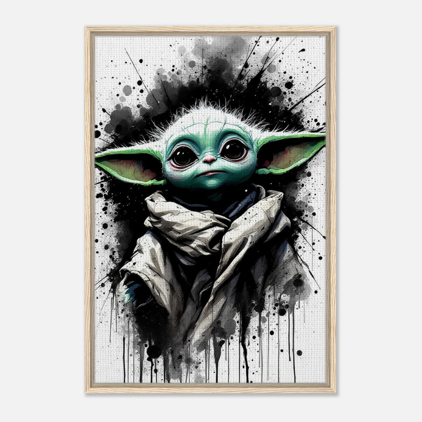 Striking watercolor-style portrait featuring a cute alien character against dramatic black ink splatter effects. The vibrant turquoise details and large expressive eyes pop against the monochromatic background. Bold dripping paint effects create an artistic, contemporary feel perfect for fans of pop culture art