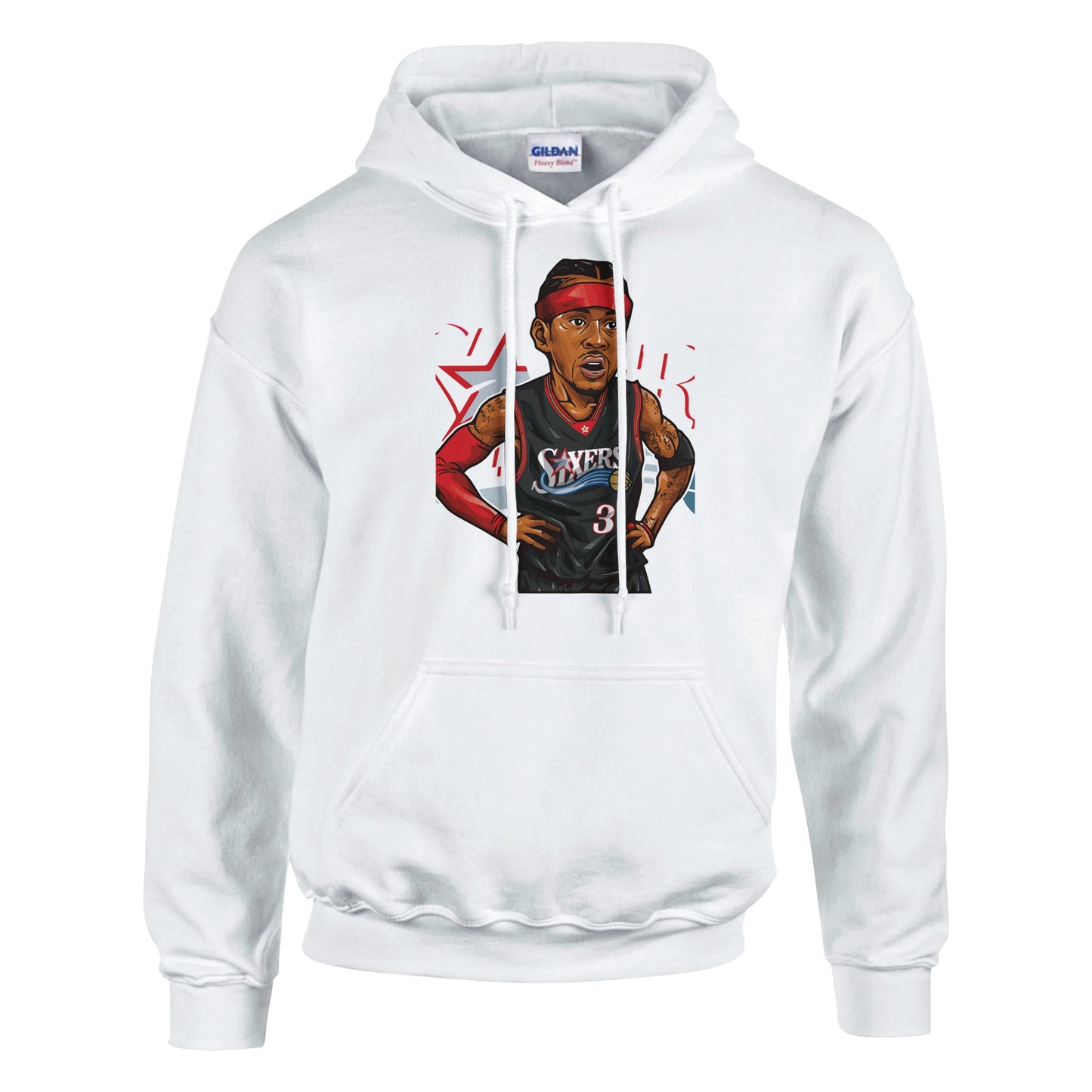 Stylized cartoon illustration featuring a basketball player in a classic Philadelphia uniform. Dynamic design showcases the player's signature headband and number 3 jersey in black and red colors. Perfect for fans of retro basketball art and sports memorabilia collectors