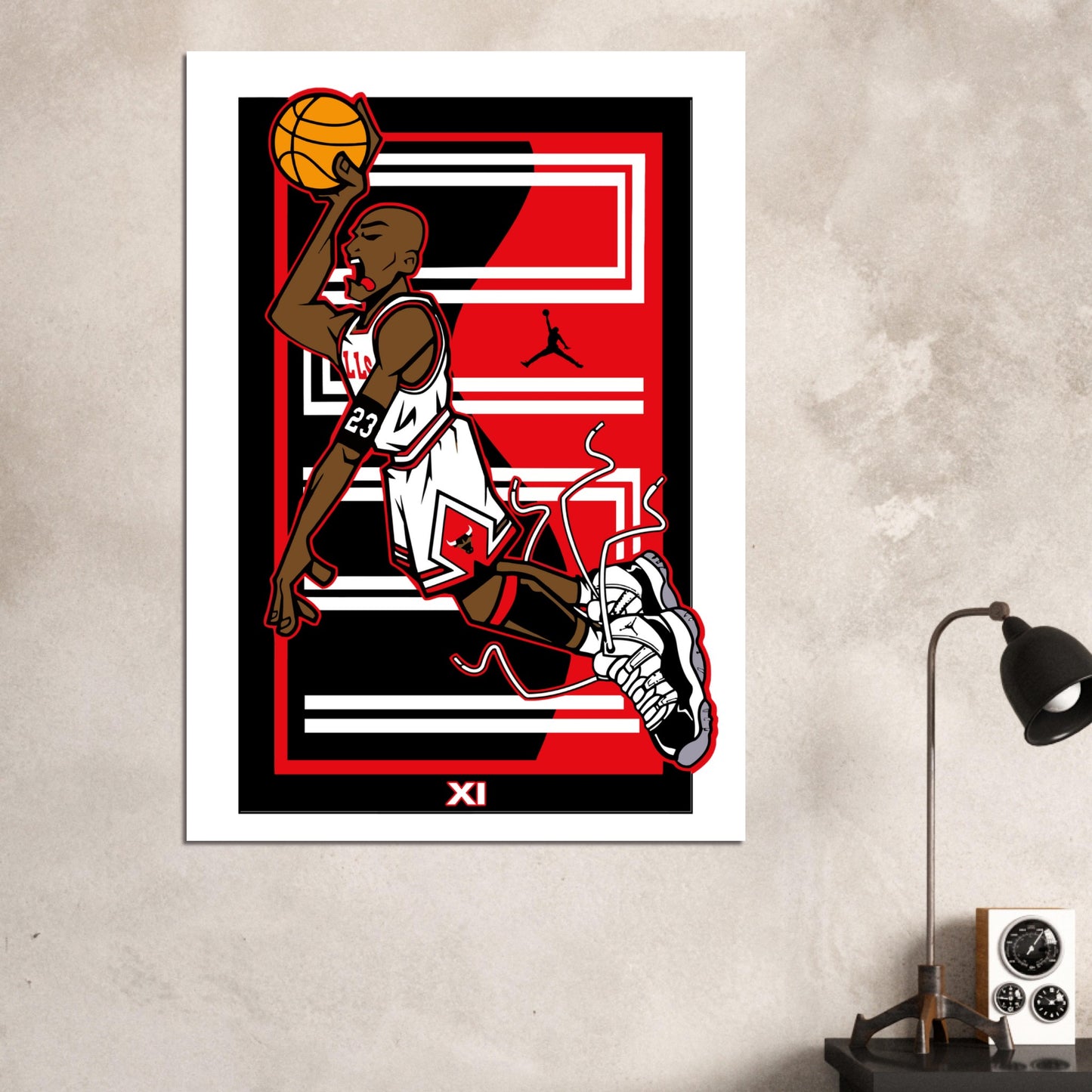 Dynamic basketball illustration featuring a powerful jump shot moment against a bold red and black geometric background. Iconic athletic pose captured in a stylized art design with classic white and red colorway. Perfect blend of sports action and artistic composition that celebrates basketball excellence
