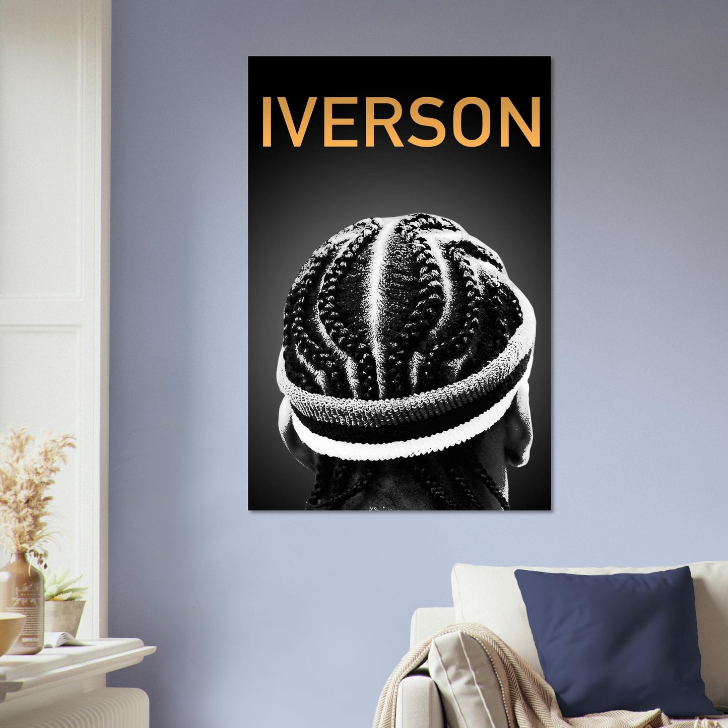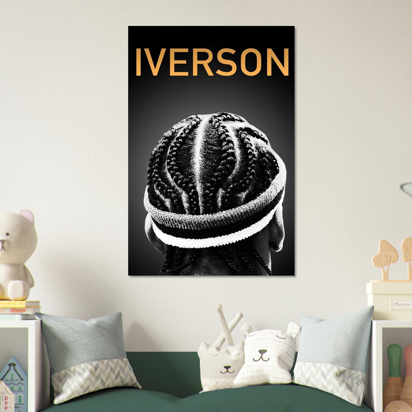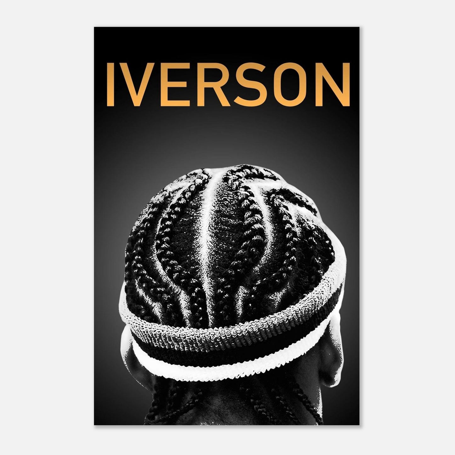 A striking black and white minimalist sports poster featuring an iconic hairstyle against a dark background, with bold golden text. The stark contrast and dramatic lighting create a powerful artistic statement that captures the essence of basketball culture and style. Perfect for sports enthusiasts and modern decor collectors
