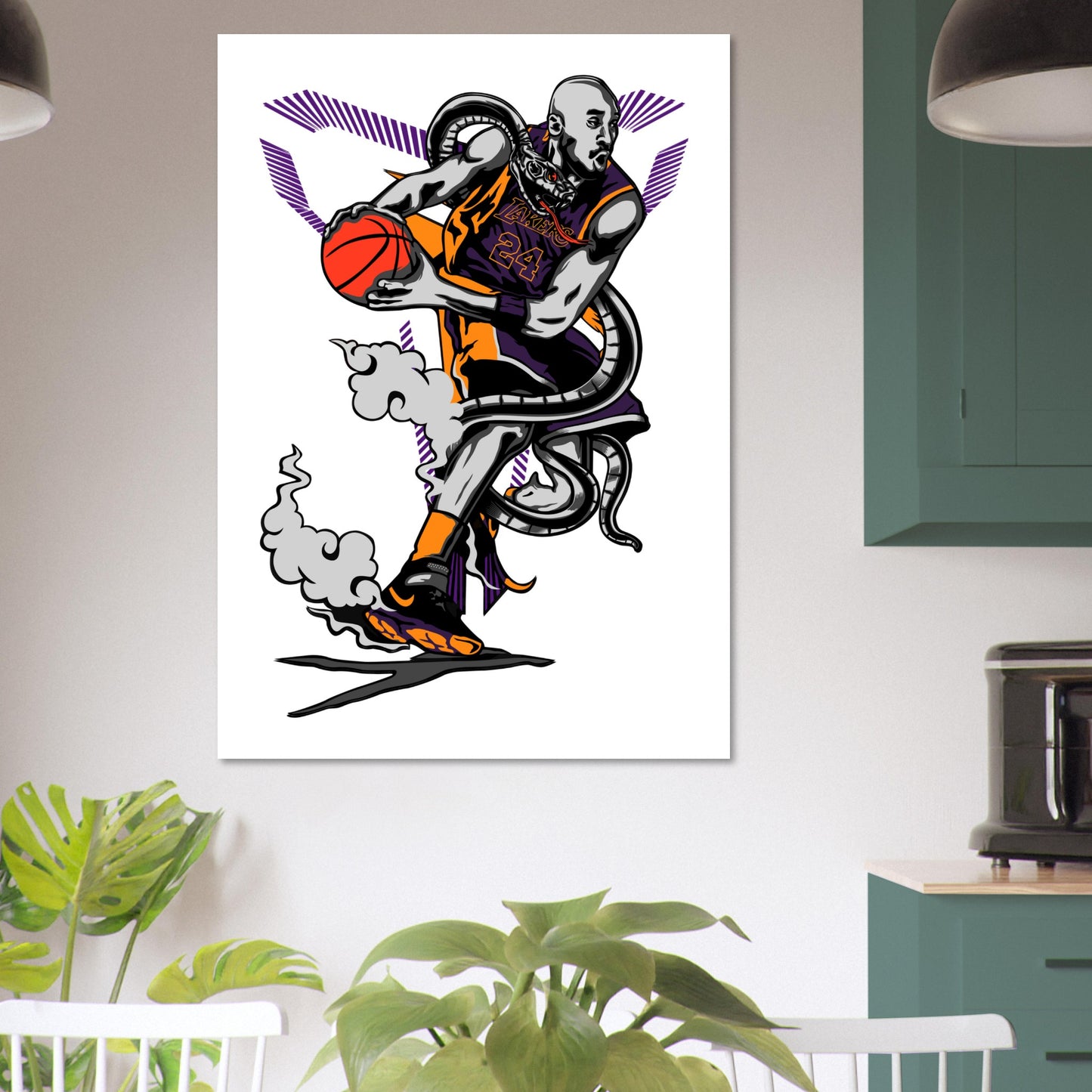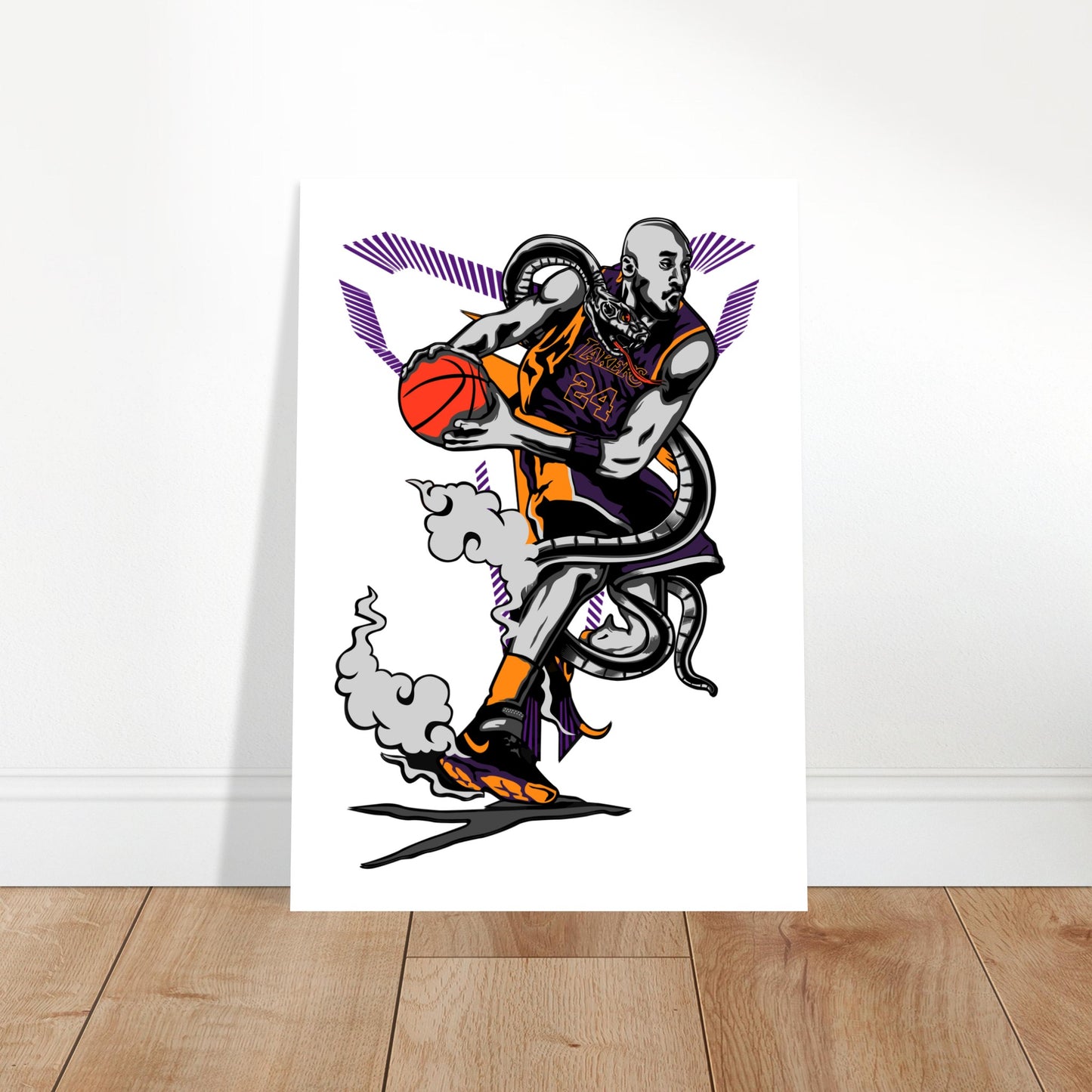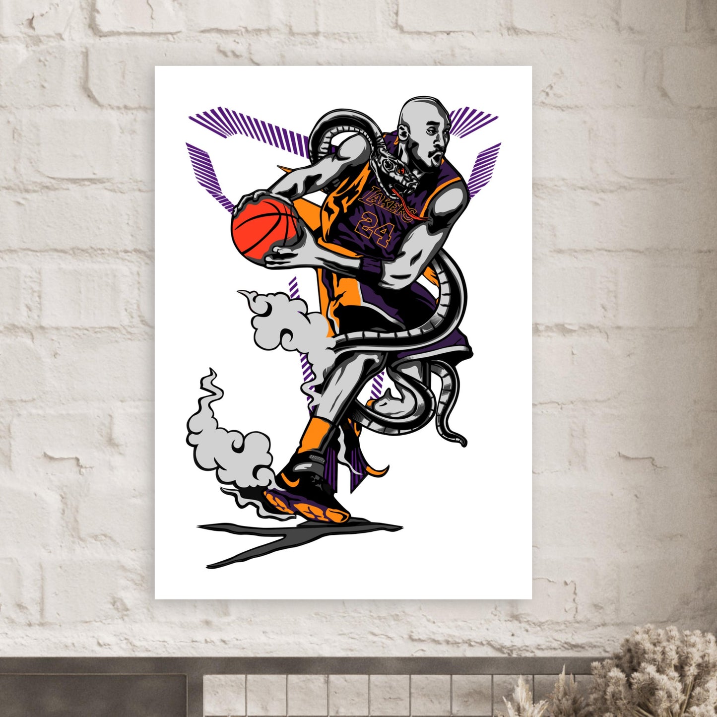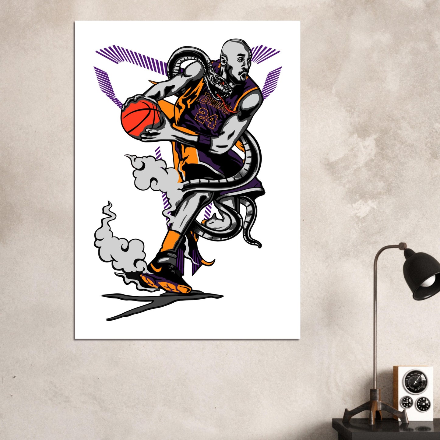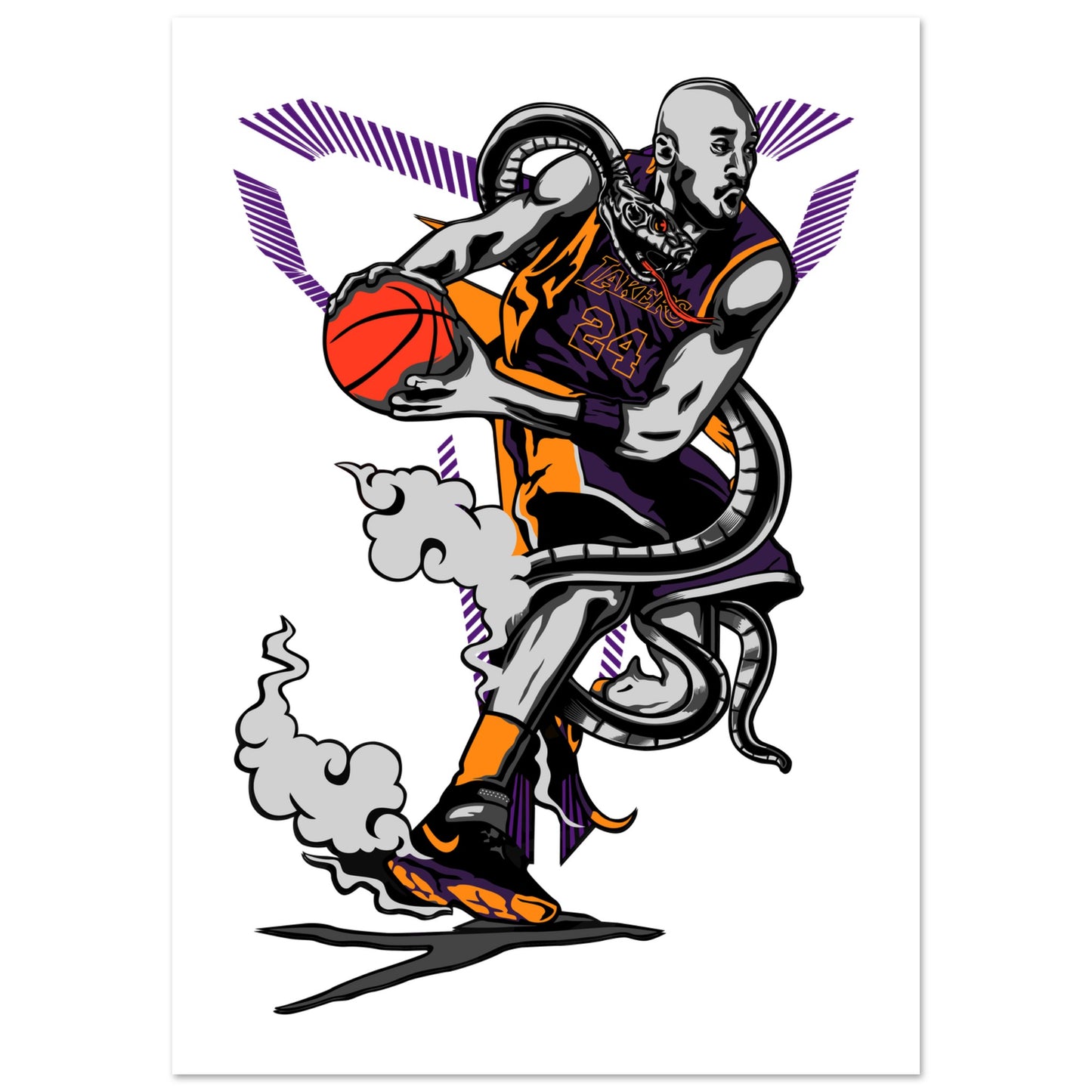 Dynamic street art-style illustration featuring a basketball player in orange and purple jersey dribbling through stylized smoke effects. Bold graphic design with urban flair combines comic book aesthetics with street culture elements. Purple diagonal lines and serpentine motifs create energetic movement against a clean white background