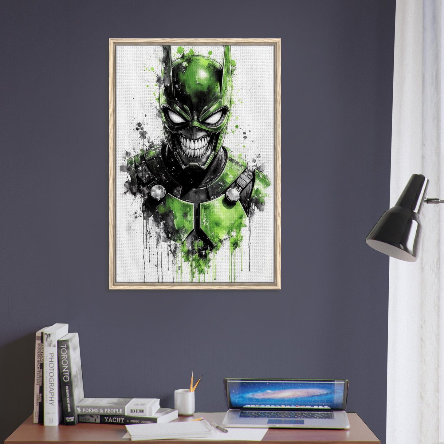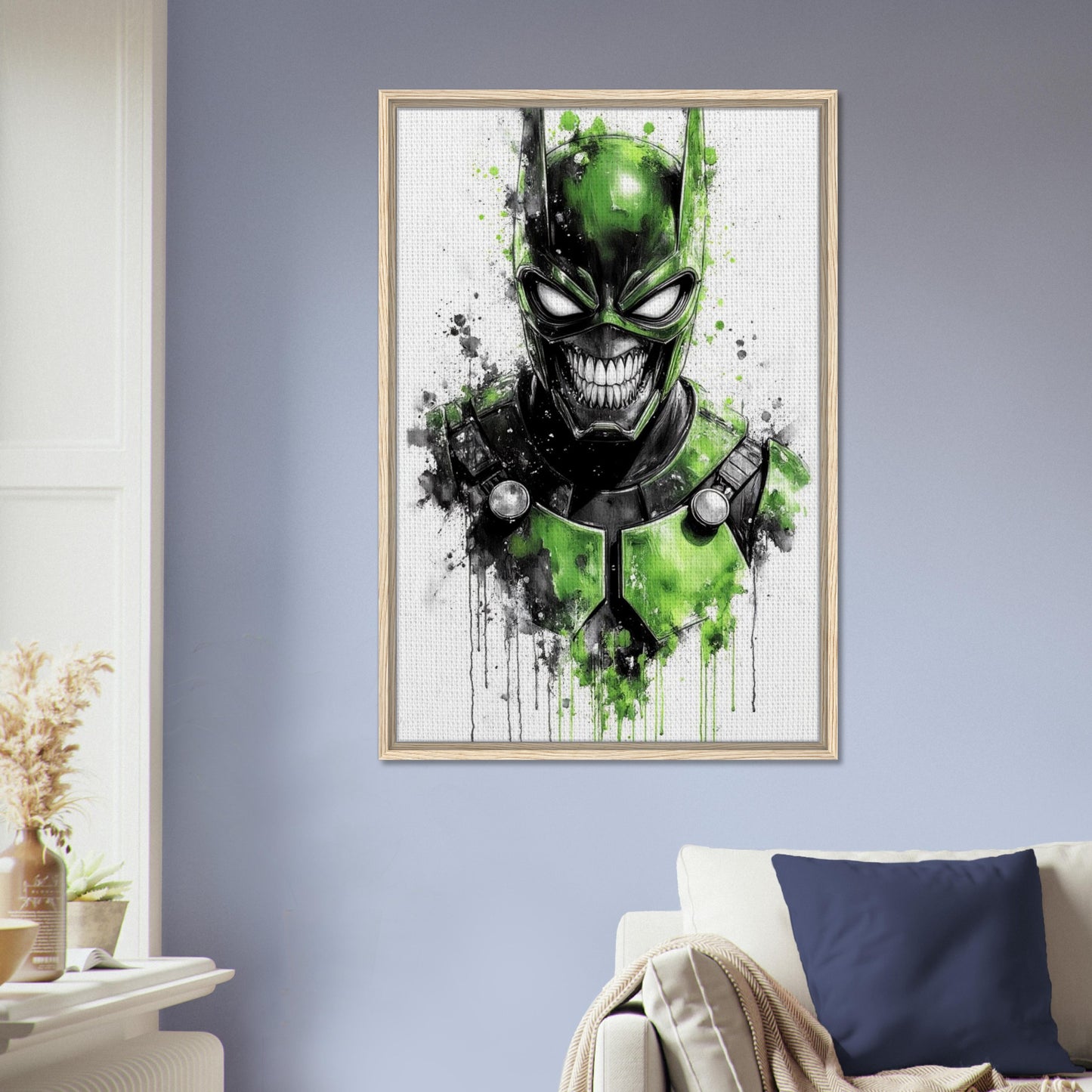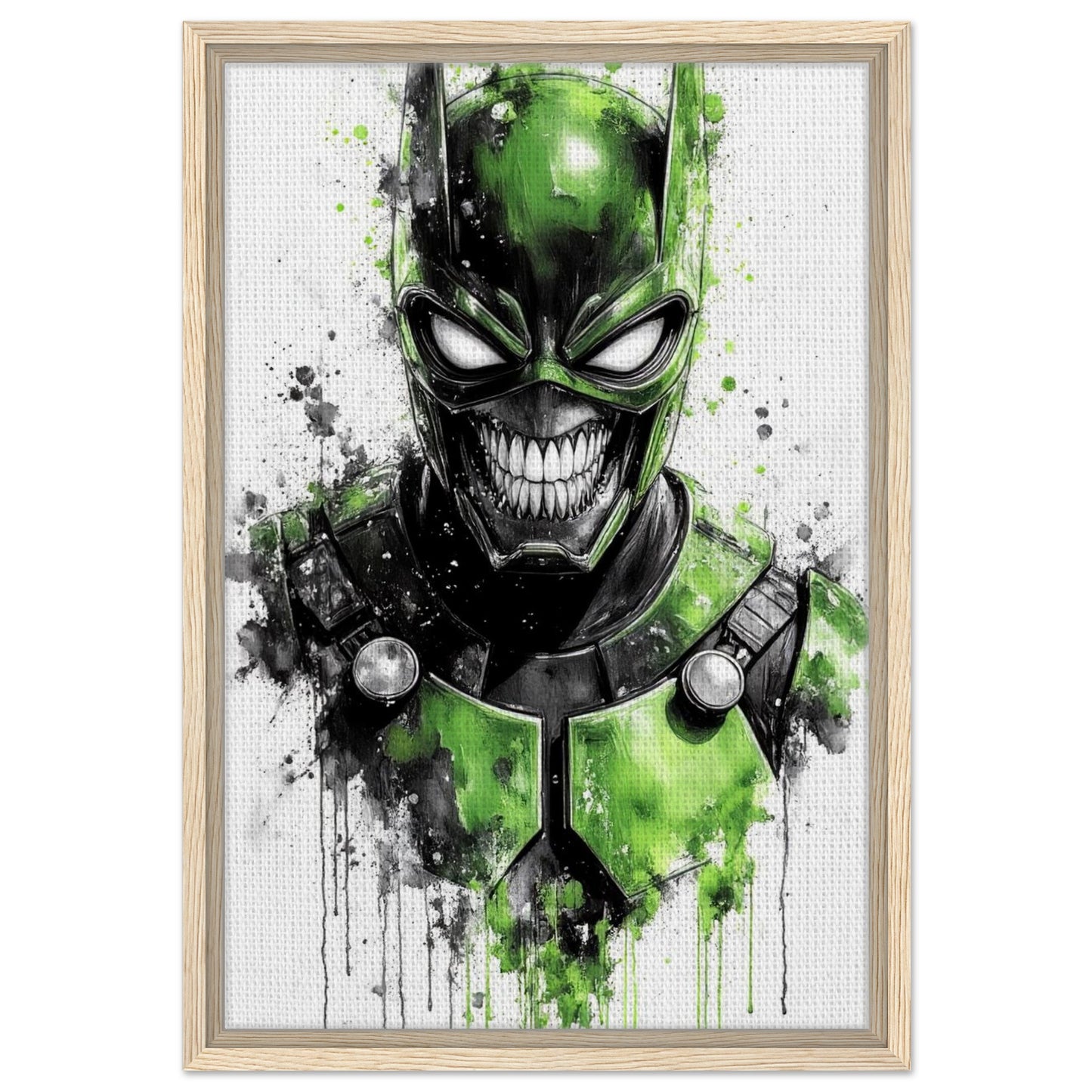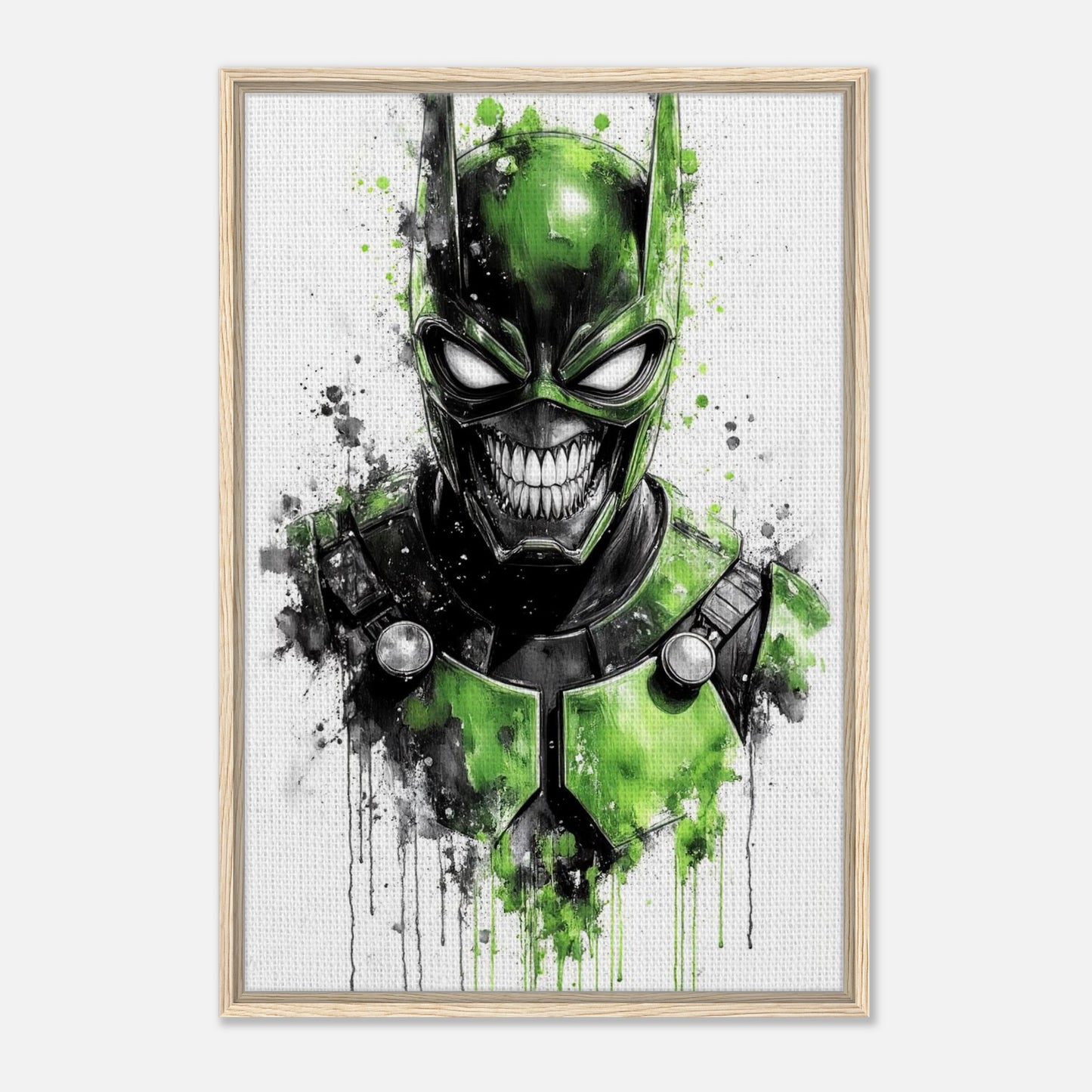 A haunting watercolor-style portrait of a sinister Batman variant rendered in striking green and black tones. Features a menacing grin and distinctive pointed cowl ears, with dramatic paint splatter effects creating an eerie, atmospheric mood. The artwork combines dark comic aesthetics with abstract watercolor techniques