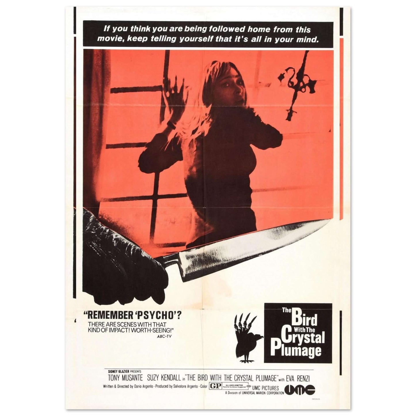 Striking vintage horror movie poster artwork rendered in dramatic red and black tones. Features a suspenseful silhouette composition with stark shadows and a menacing knife element. Classic giallo thriller aesthetic with bold graphic design elements creating an atmosphere of psychological tension and fear