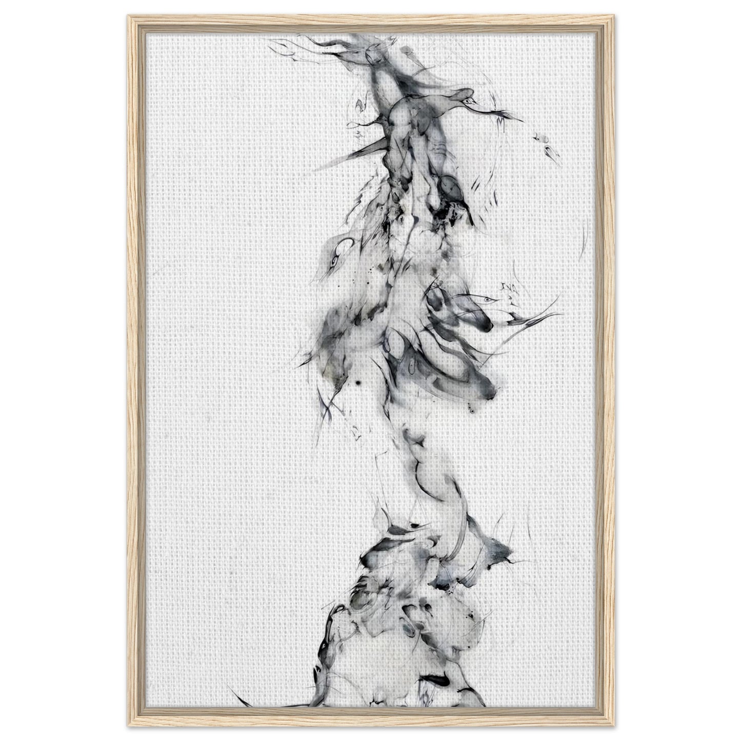 Ethereal black and white abstract artwork capturing the mesmerizing flow of smoke. Dramatic wisps and swirls create an elegant, fluid composition against a stark white background. The monochromatic palette and organic movement evoke a sense of mystery and grace, perfect for modern and minimalist interior spaces