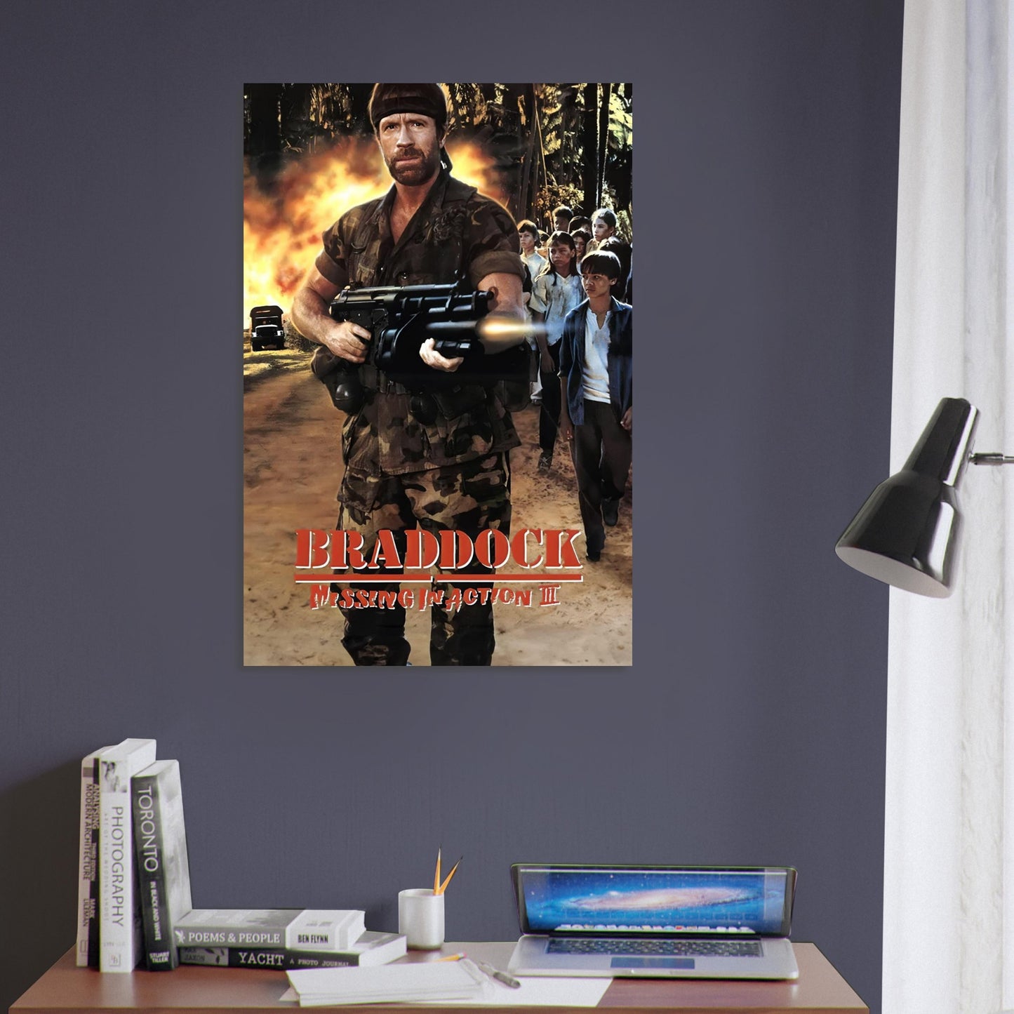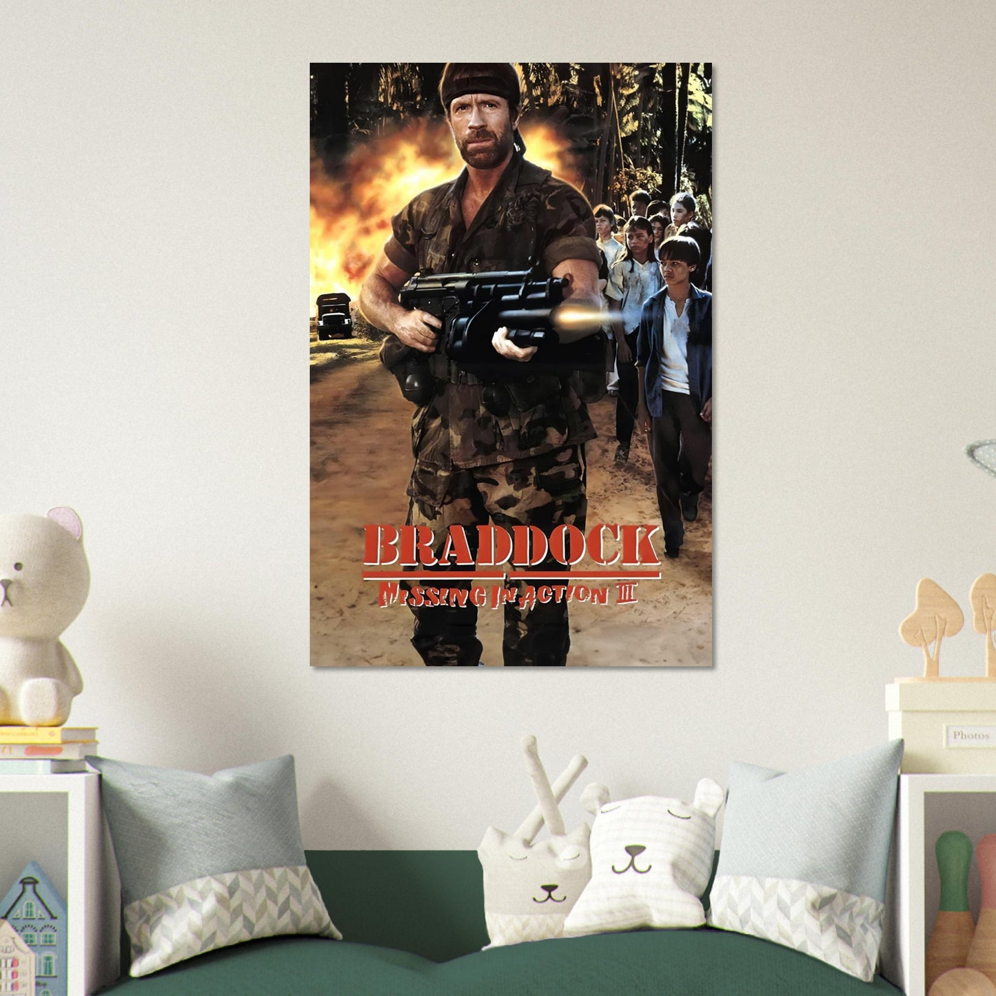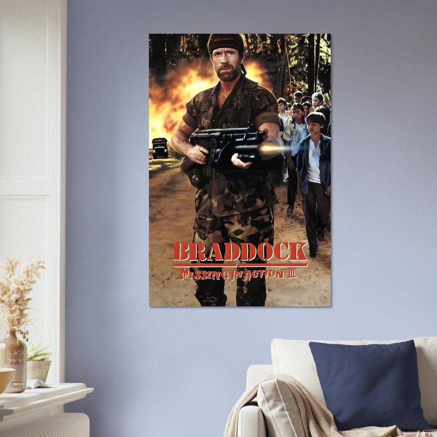 A dynamic action-packed vintage movie poster featuring a dramatic combat scene in jungle terrain. Set against fiery explosions and dense foliage, the artwork captures intense military action with bold typography and classic 80s action film aesthetics. Rich oranges and deep forest greens create a compelling atmospheric effect