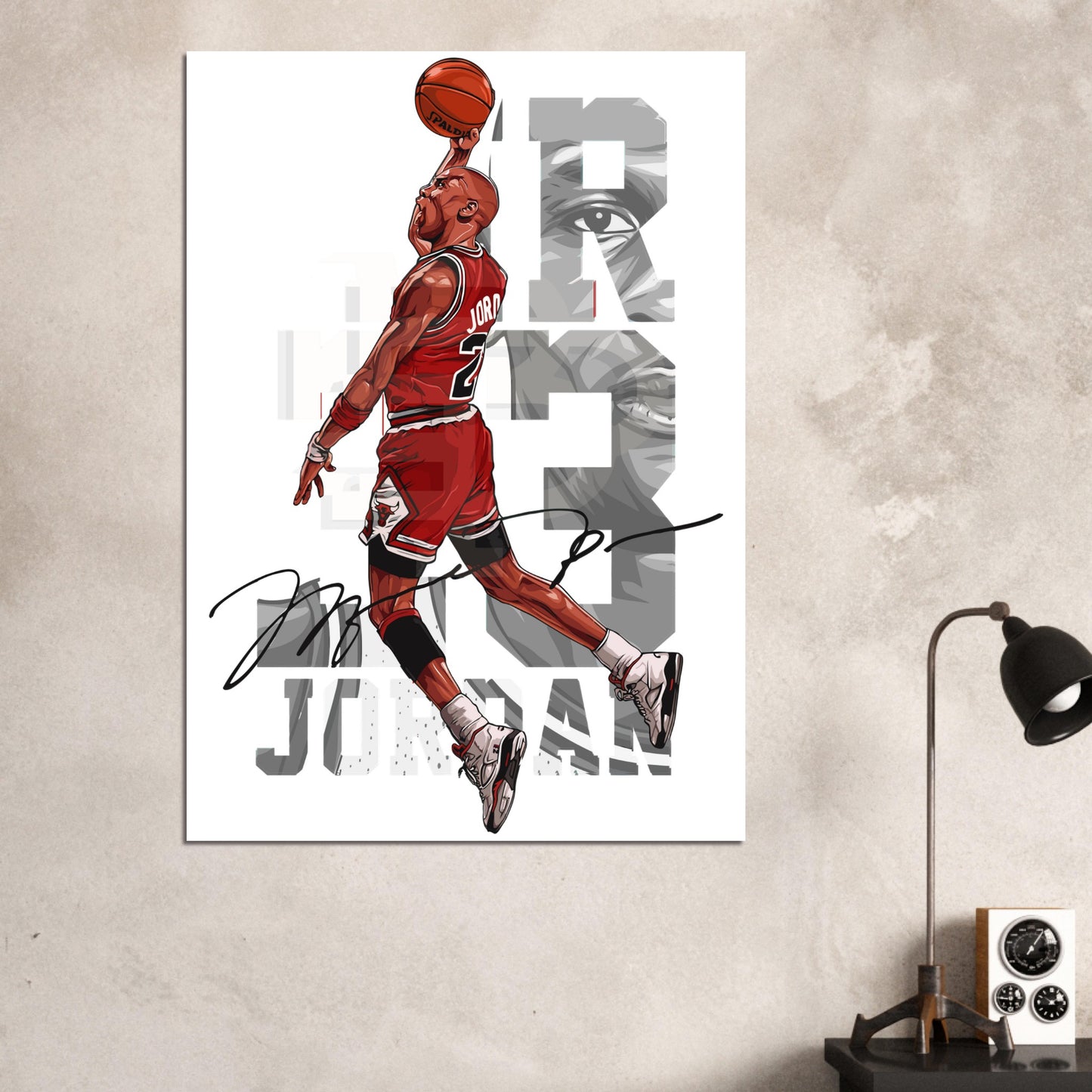 Dynamic illustration capturing an iconic basketball moment in a striking red and white color scheme. Features a powerful silhouette design with artistic typography integration. Perfect for basketball enthusiasts and sports art collectors, this piece combines retro style with modern artistic flair