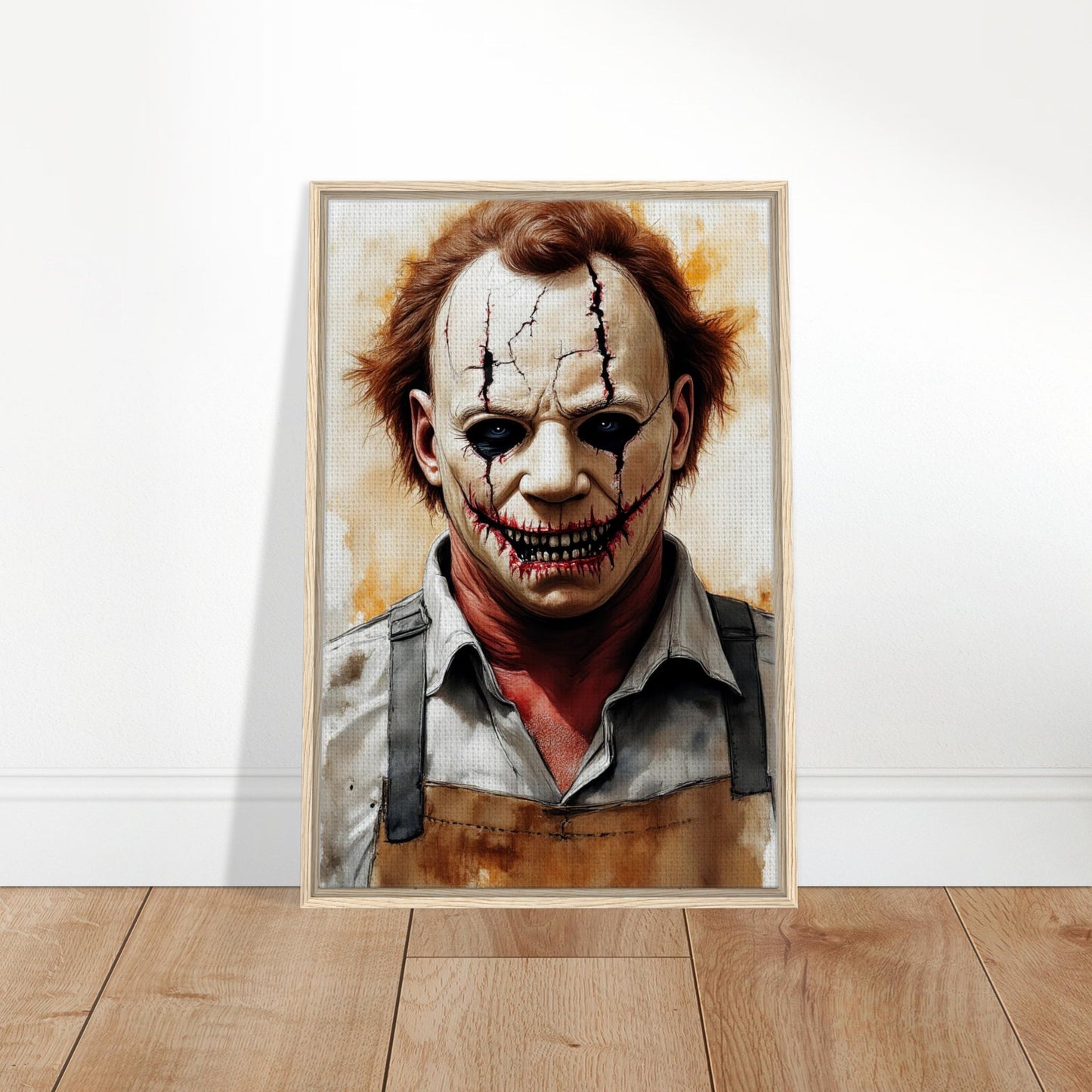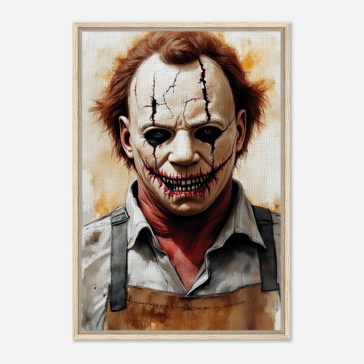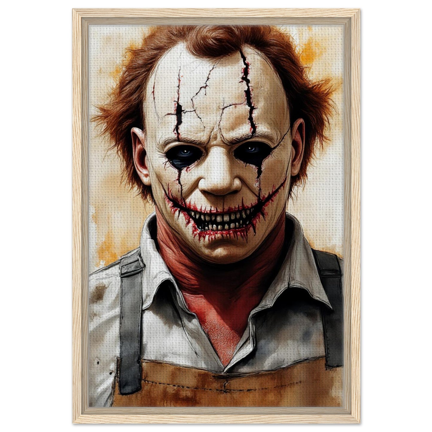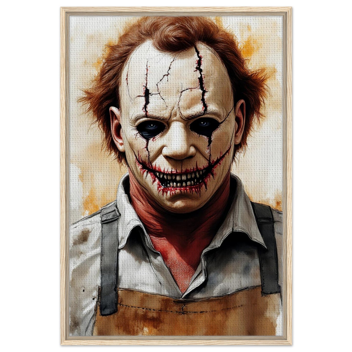 A haunting watercolor portrait featuring a sinister clown with cracked white face paint and dark, menacing details. The artwork combines warm sepia tones with stark whites and blacks, creating an unsettling atmosphere. Dark tears stream from hollow eyes, while a grotesque stitched smile reveals sharp teeth, perfect for horror enthusiasts and gothic decor