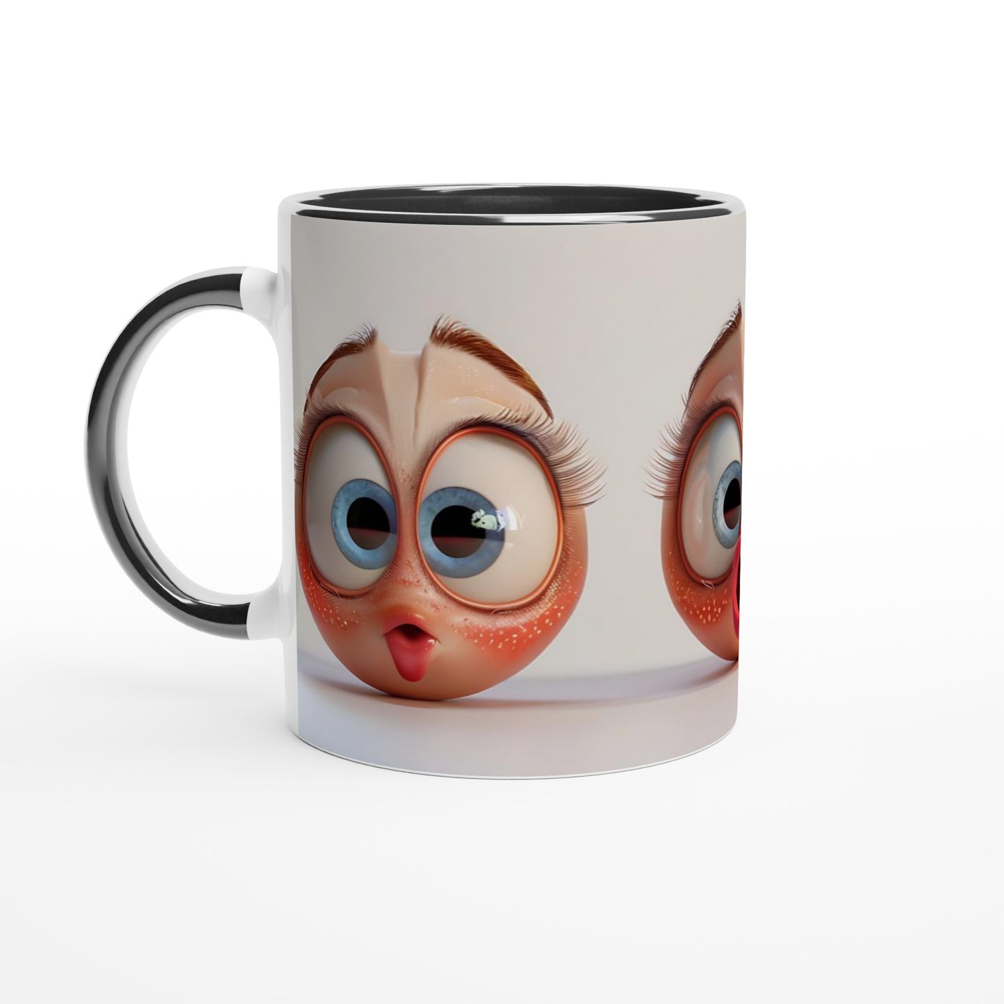 This beautiful ceramic mug is perfect for any event of the day. Your morning coffee, a hot chocolate, or any other hot beverage you enjoy. The mug is glossy white with a colored rim, inside, and handle. The prints come out beautifully and vividly on it. The print retains its quality and luster when used in both microwaves and the dishwasher.