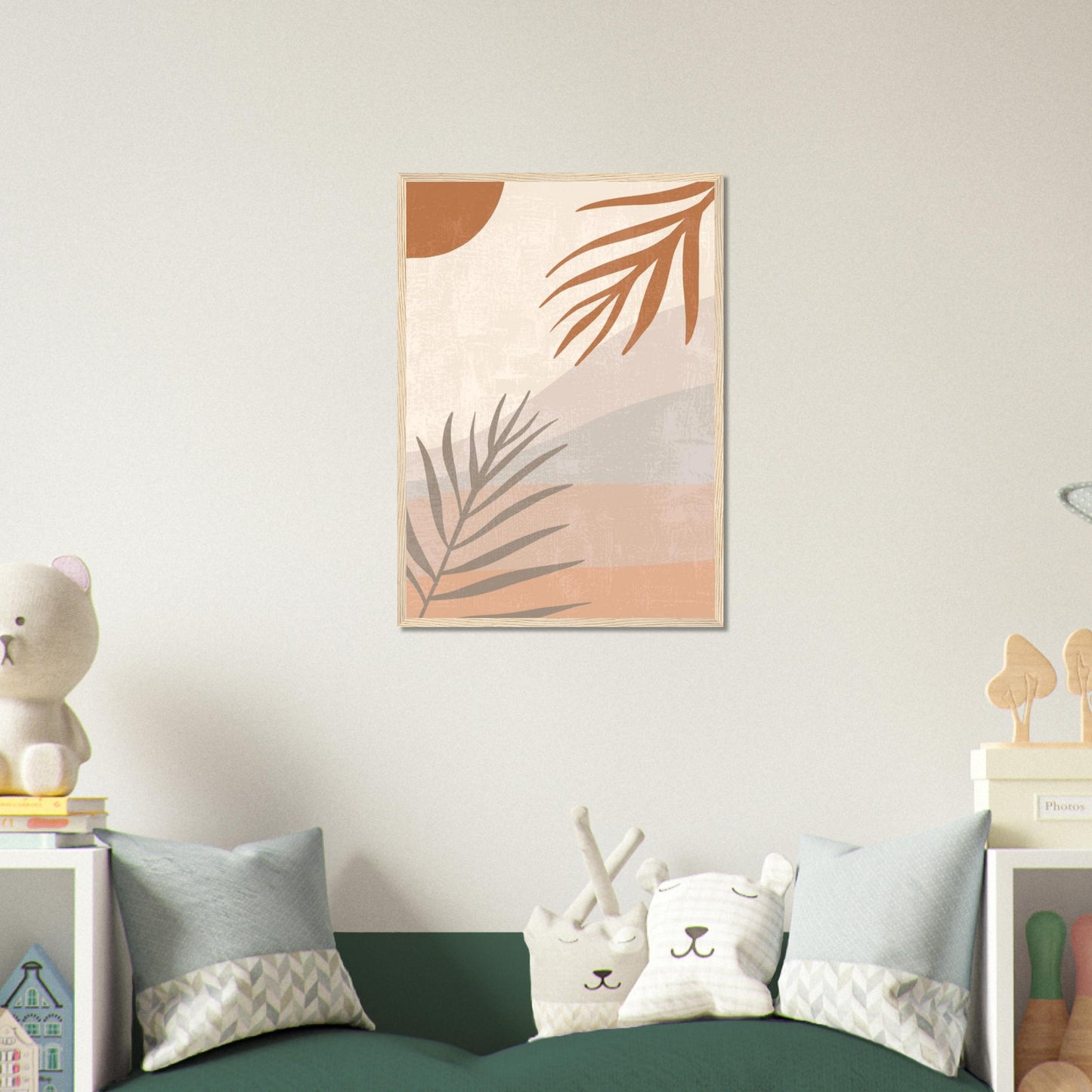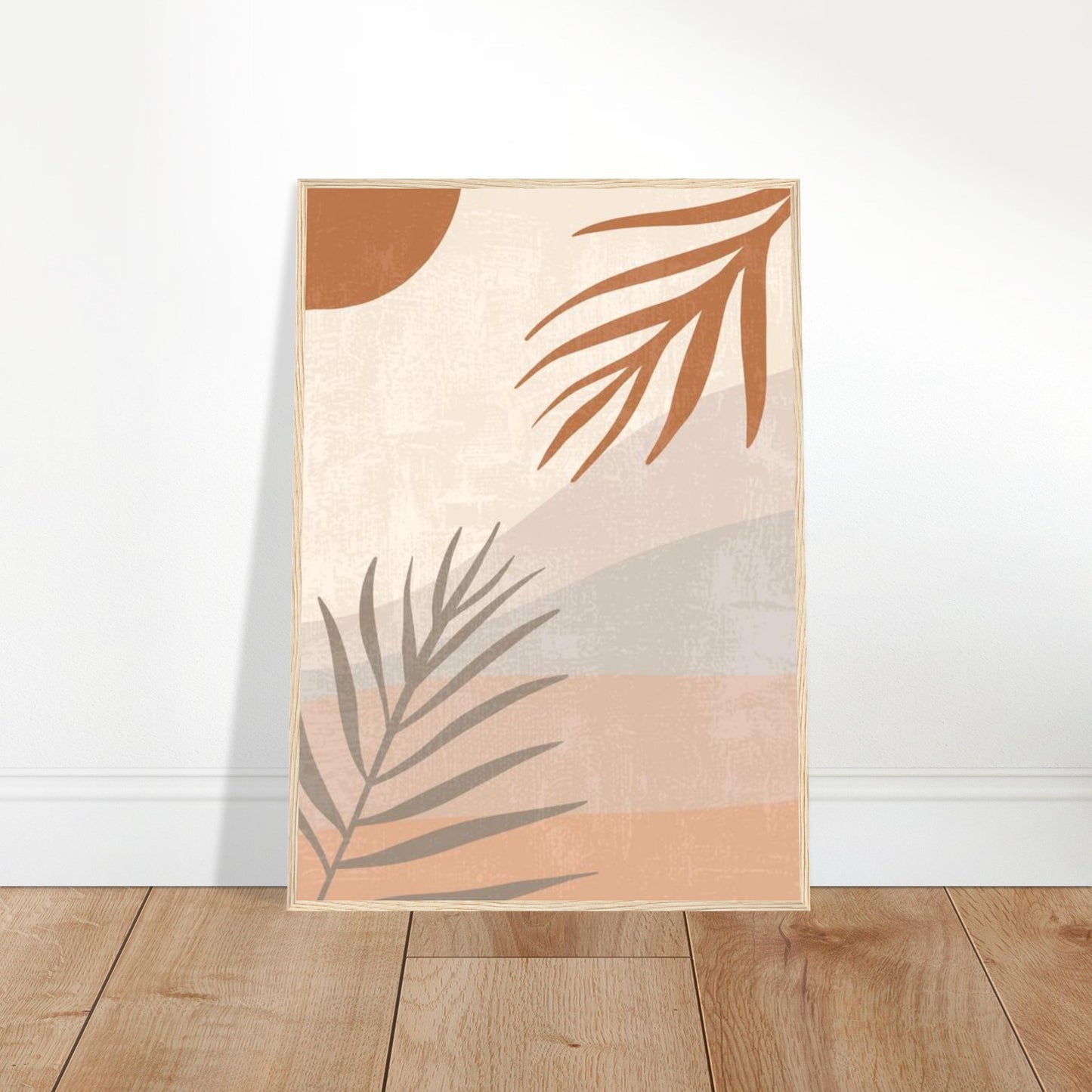 A serene minimalist landscape featuring palm fronds in earthy terracotta tones against a cream background. Abstract desert hills create gentle waves across the composition, while a bold rust-colored sun adds dramatic focus. Perfect for modern boho interiors with its warm, organic aesthetic