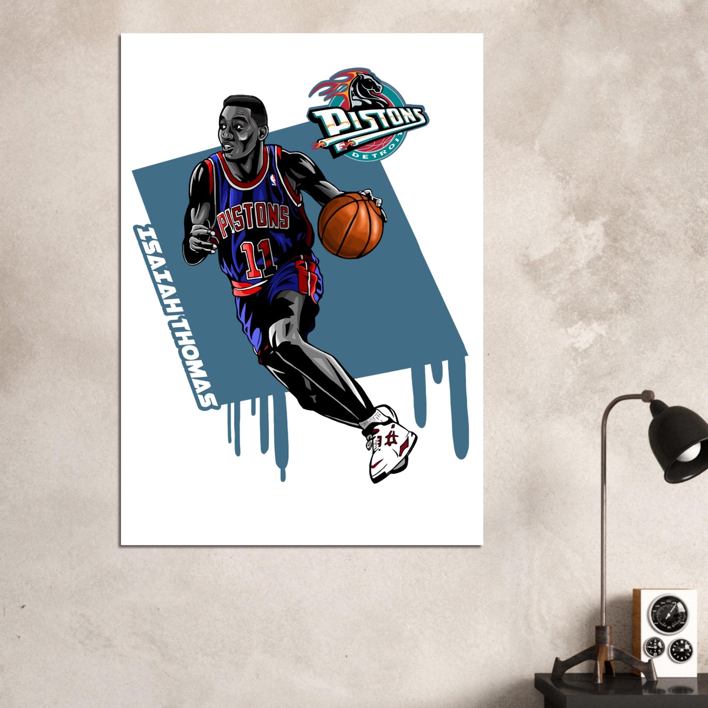 Dynamic illustration featuring a Detroit Pistons player in classic team colors of blue and red. Set against a stylized teal background with drip effects, this artwork captures the energy and motion of basketball action. The bold graphic style combines vintage team aesthetics with modern artistic flair, perfect for any sports fan's wall