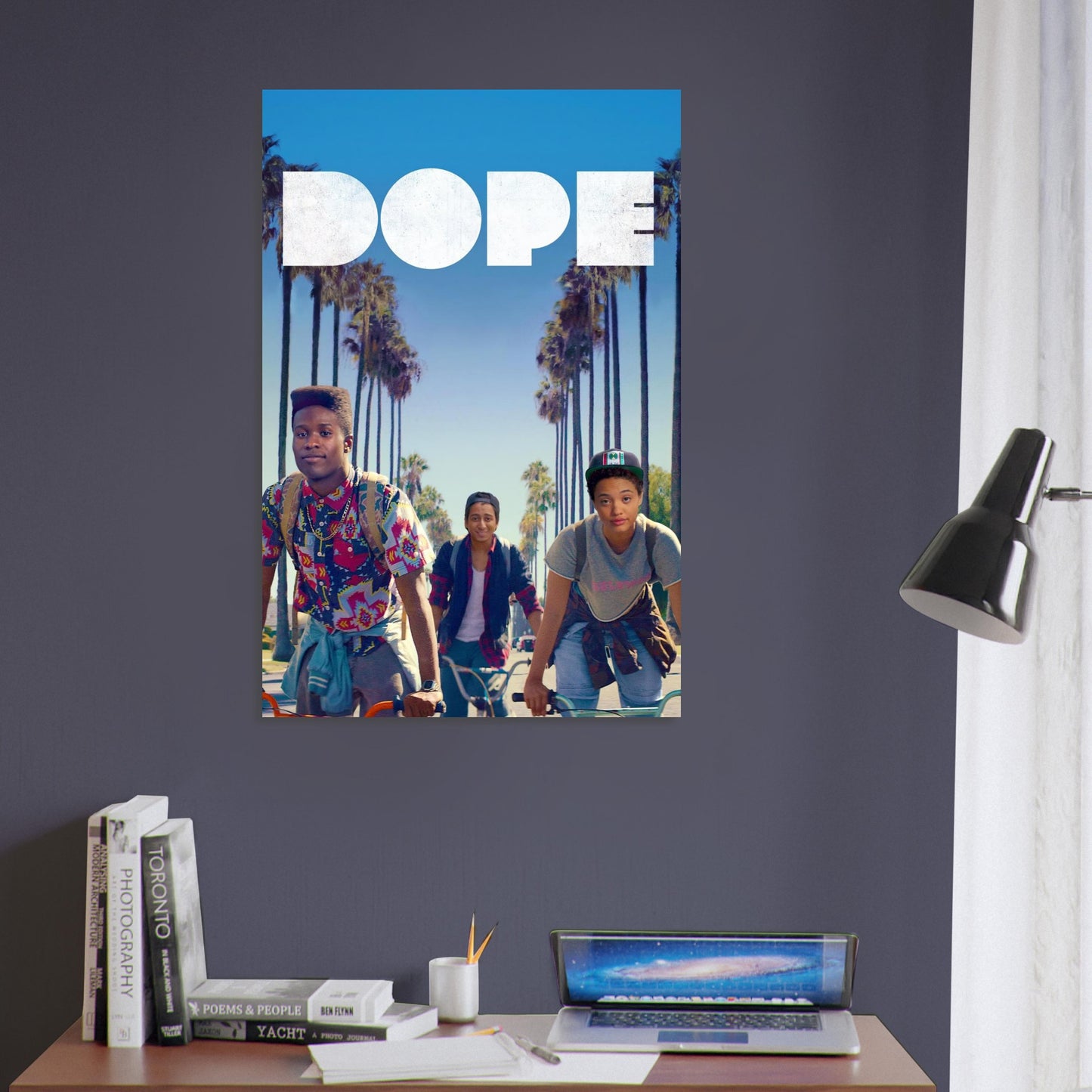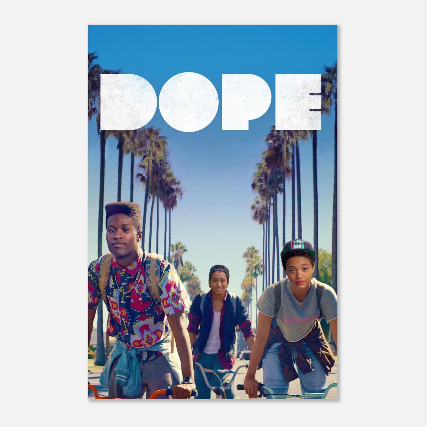 Vibrant urban artwork capturing the essence of Los Angeles with towering palm trees against a bright blue sky. Features bold, modern typography with 'DOPE' text in white against the tropical backdrop. Perfect for fans of contemporary urban culture and California aesthetics
