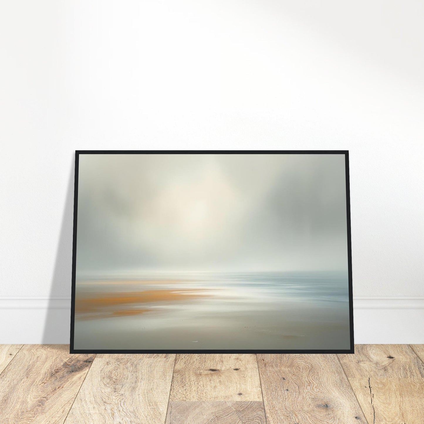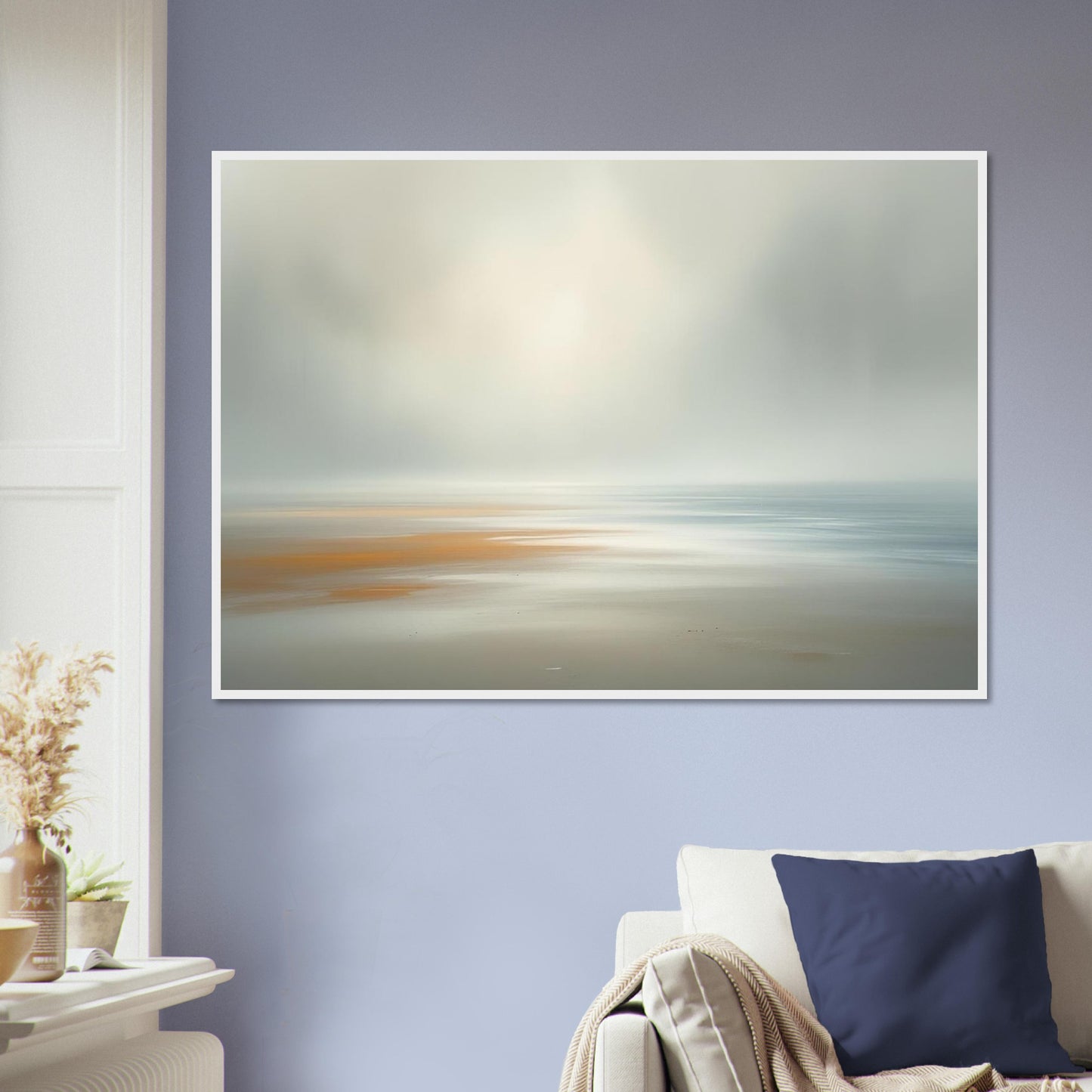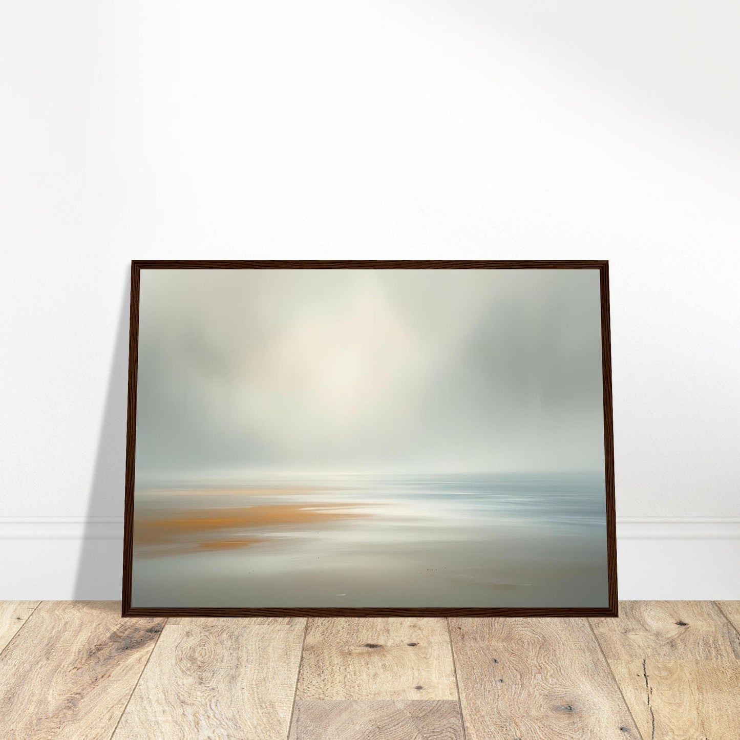 A dreamy, minimalist seascape in soft pastel tones. This atmospheric abstract piece captures the serene meeting of sea and sky, with gentle copper and sand hues blending into misty blue-greys. The ethereal, blurred effect creates a sense of peaceful movement and coastal tranquility