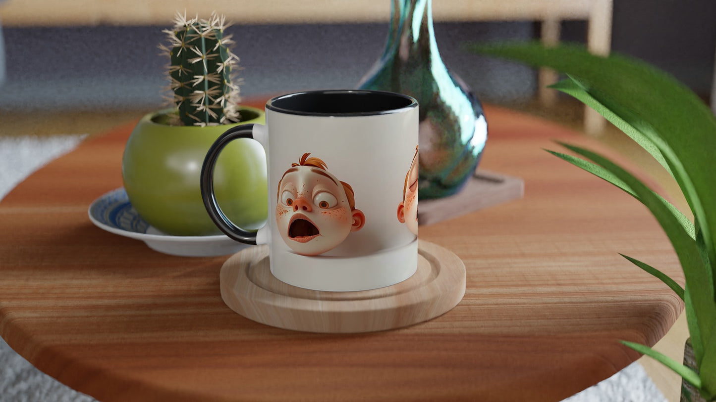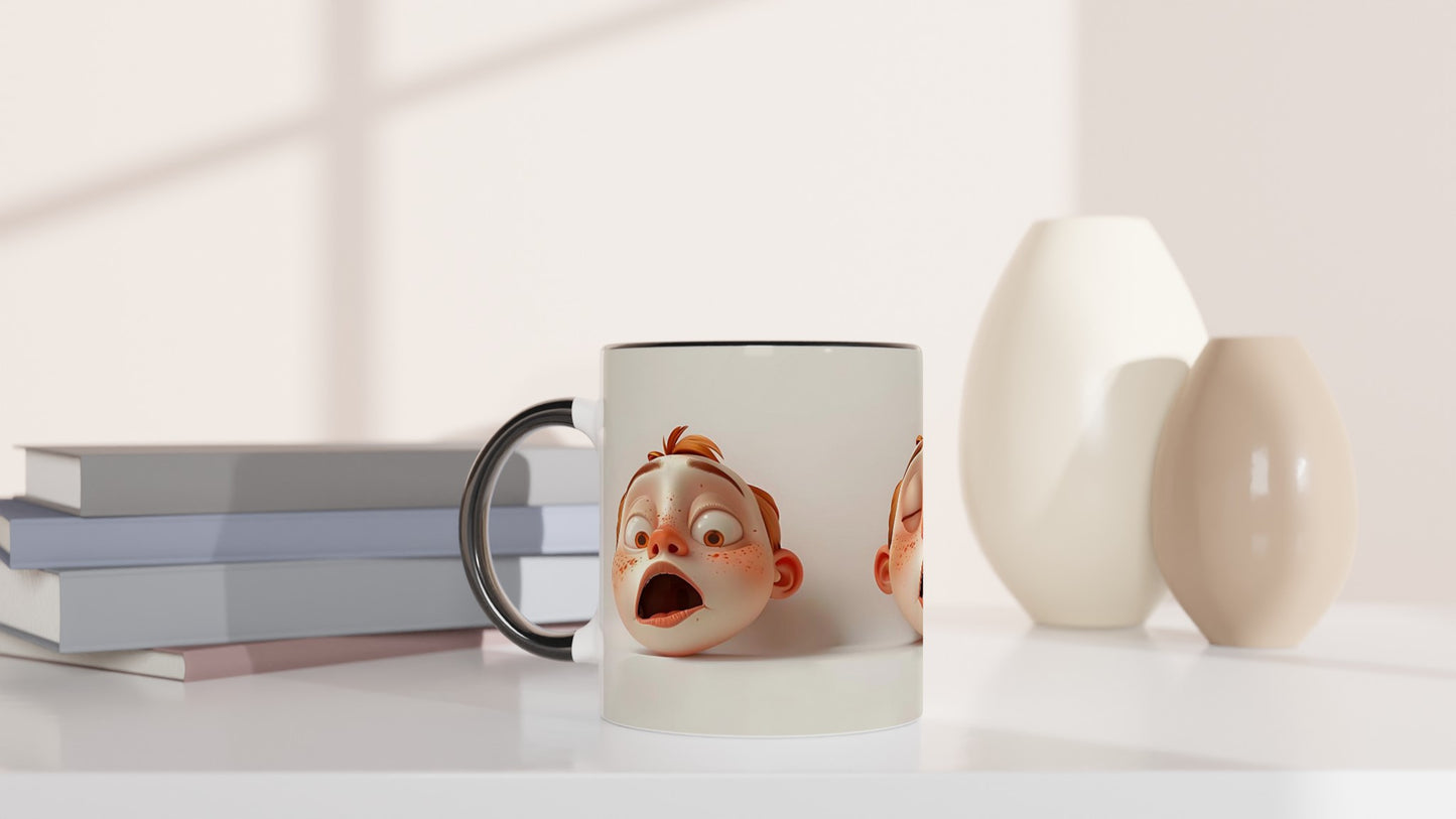 This beautiful ceramic mug is perfect for any event of the day. Your morning coffee, a hot chocolate, or any other hot beverage you enjoy. The mug is glossy white with a colored rim, inside, and handle. The prints come out beautifully and vividly on it. The print retains its quality and luster when used in both microwaves and the dishwasher.
