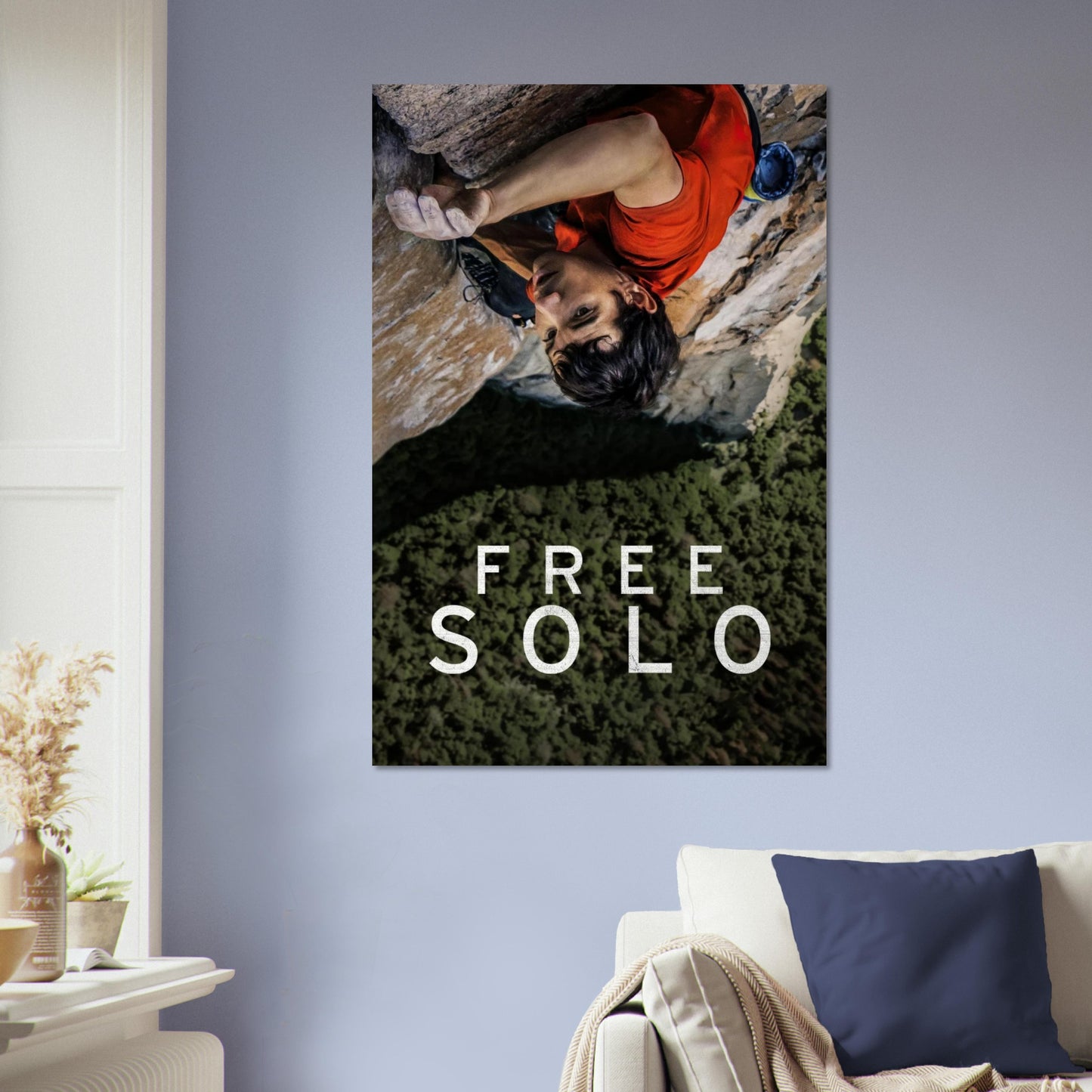 A dramatic climbing poster featuring an intense moment of free solo climbing against a sheer rock face. The climber in vibrant orange contrasts beautifully with the rugged cliff backdrop, captured from a dizzying perspective. Bold white text 'FREE SOLO' adds striking typography to this powerful adventure sports composition. ,