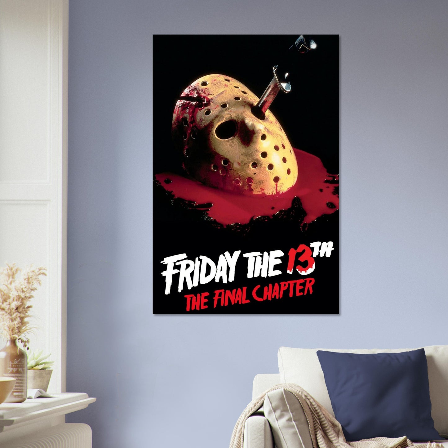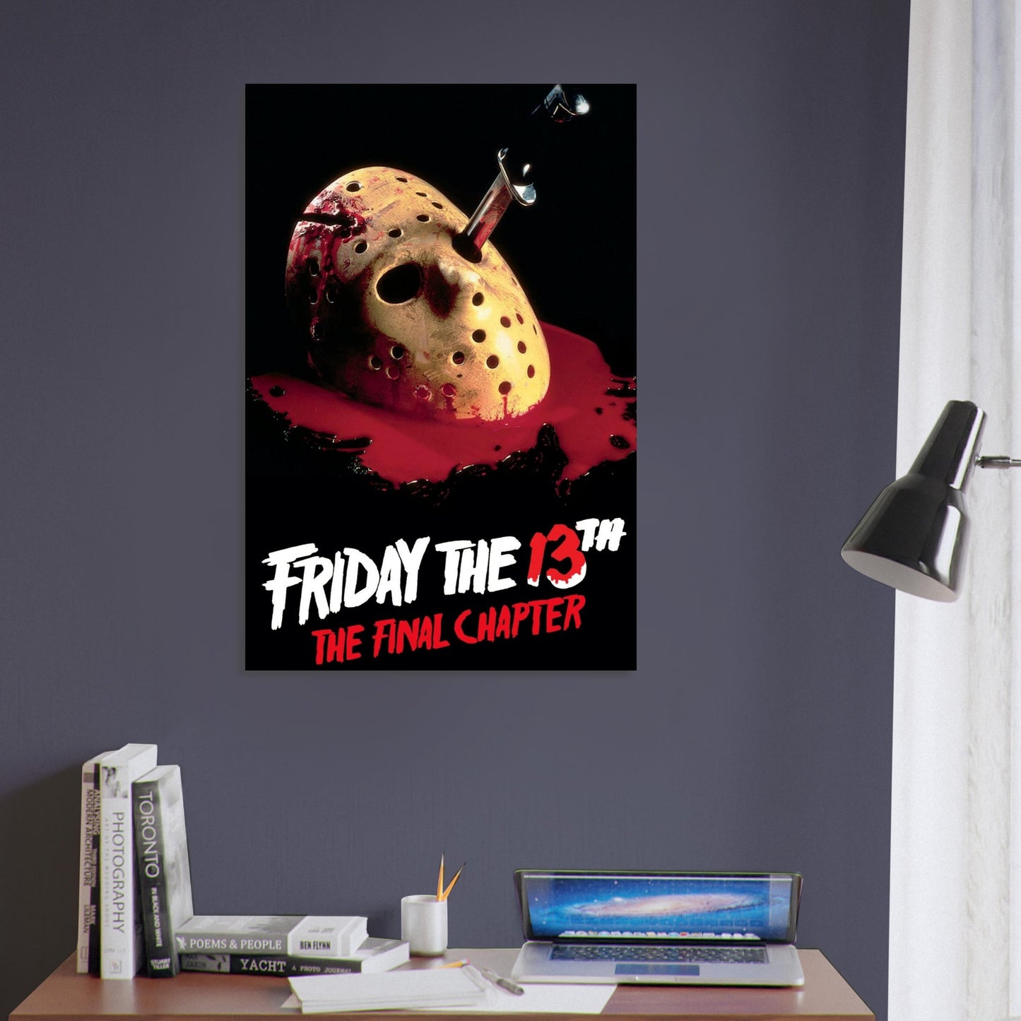 Iconic horror movie poster featuring the haunting hockey mask from Friday the 13th: The Final Chapter. Dramatic composition with blood splatter and a knife against dark background creates an intense, atmospheric piece perfect for horror film enthusiasts and collectors of classic slasher movie art