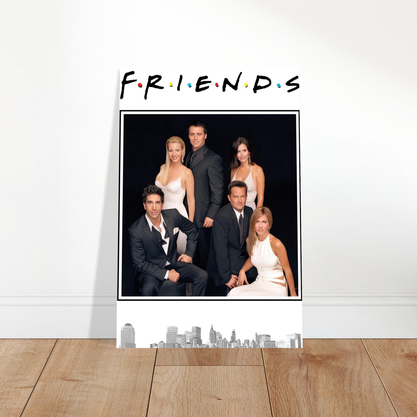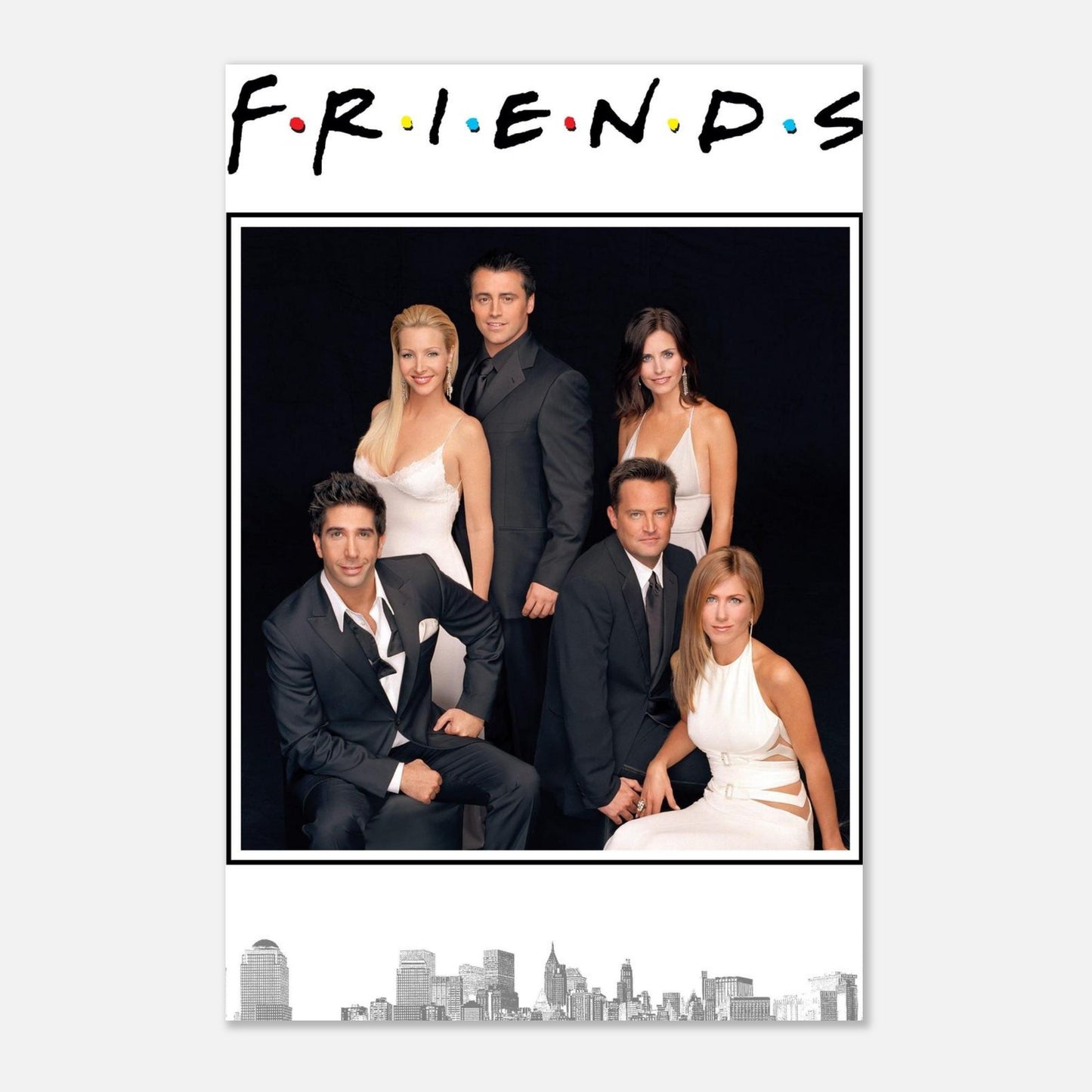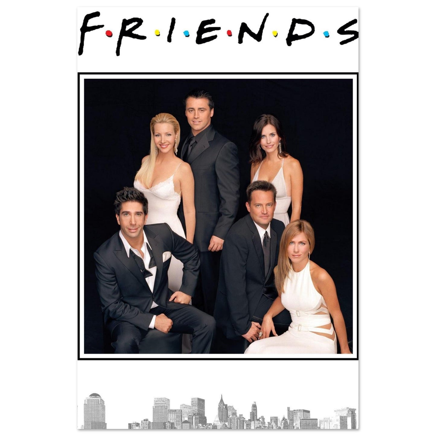 Iconic group photo featuring the beloved cast in elegant black and white formal attire, set against a stark black background. The distinctive Friends logo appears above, with the New York City skyline silhouette below creating a perfect balance of classic TV nostalgia and sophisticated design