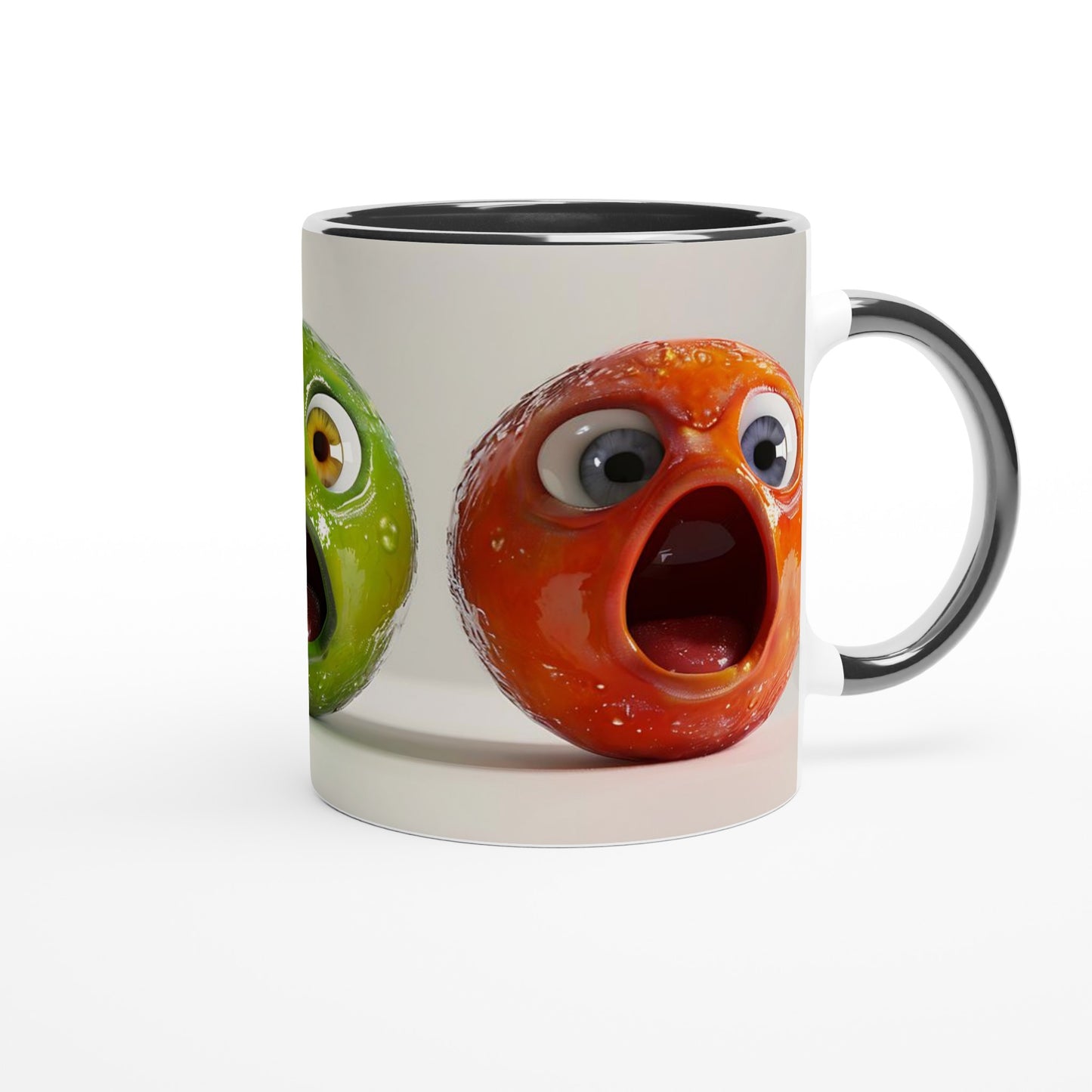 Quirky and vibrant ceramic mug featuring three expressive citrus fruits with exaggerated shocked expressions. Bright yellow, green, and orange faces with wide-open mouths and googly eyes create a playful and humorous design that's sure to spark joy with every sip. Perfect for adding a zesty splash of fun to your morning routine