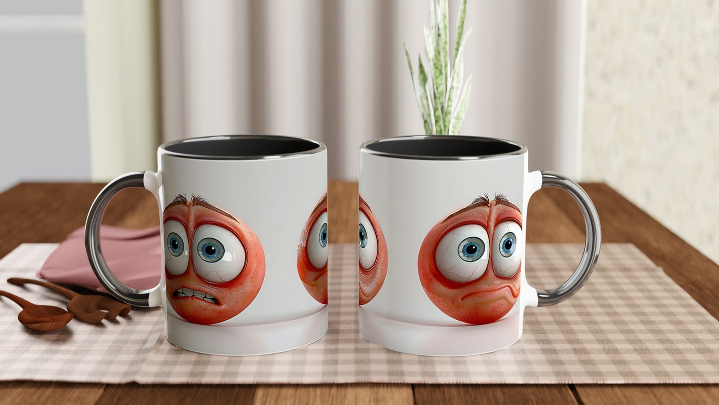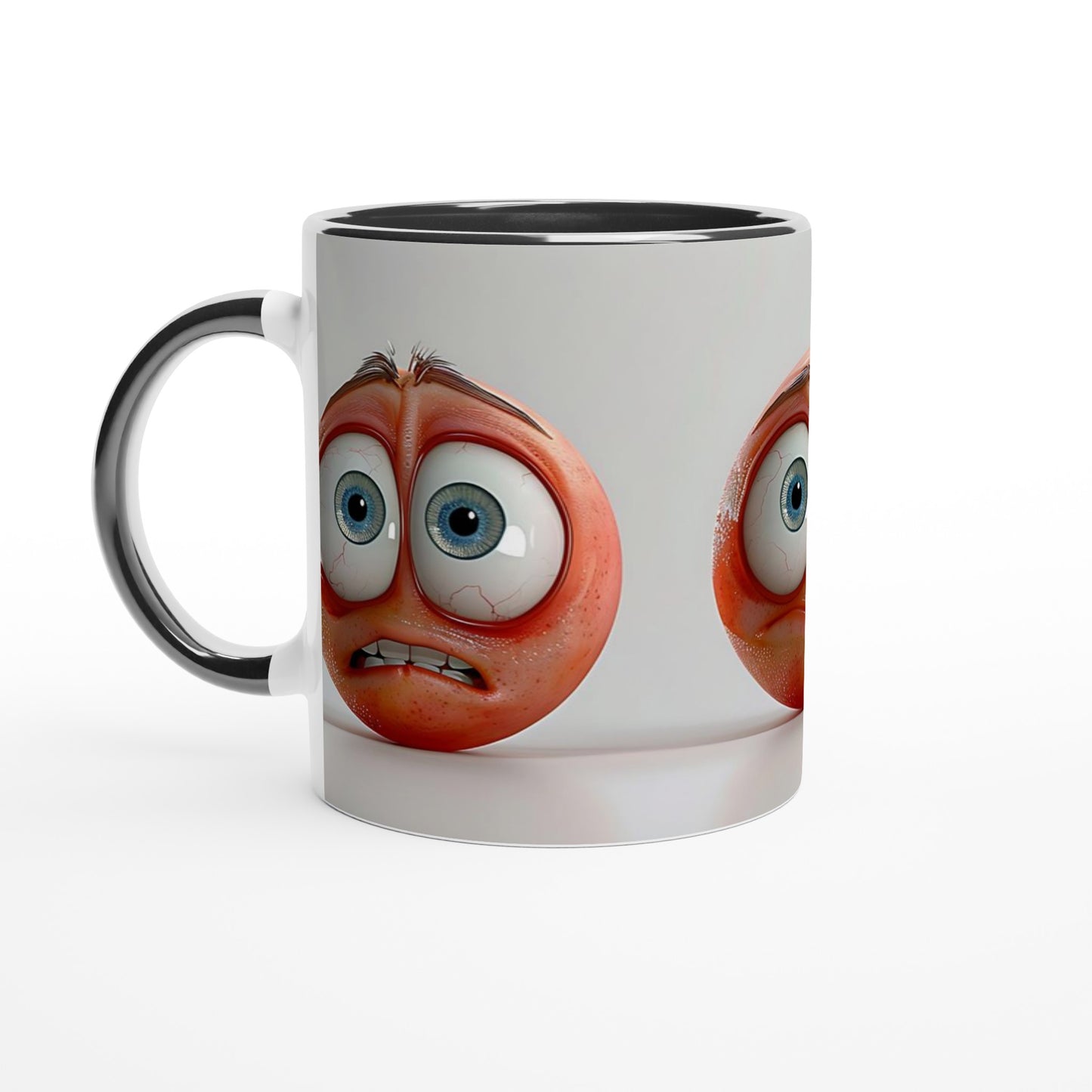 Quirky and expressive cartoon-style faces showcase a range of comical emotions on this fun mug design. Features three round peach-colored characters with exaggerated blue eyes and distinct expressions - worried, uncertain, and sad. Perfect for anyone who loves emotive designs with a touch of humor. ,
