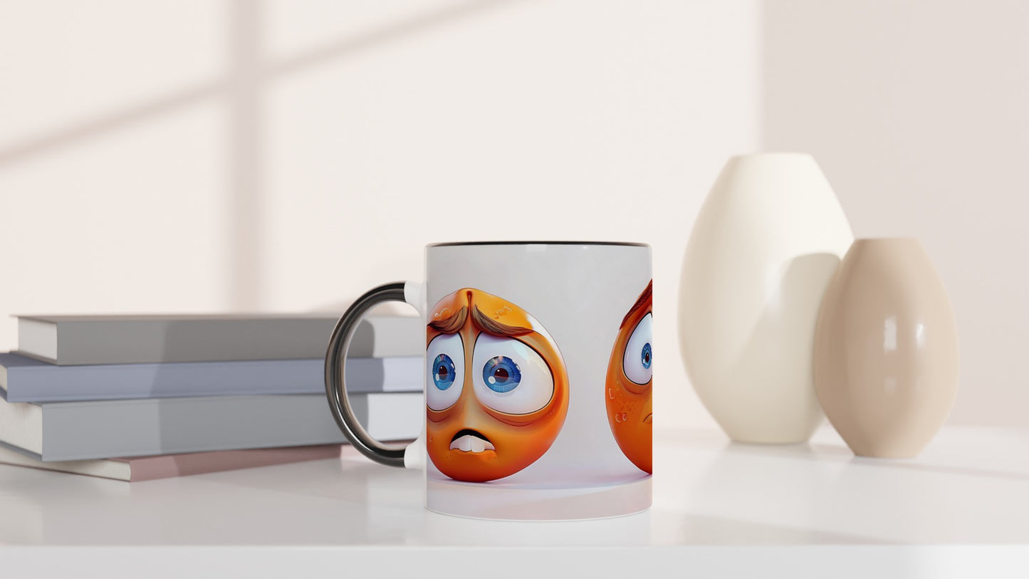 Featuring three vibrant orange emojis displaying different emotions - worry, concern, and anger. Each character has exaggerated blue eyes and distinct facial expressions, creating a humorous and relatable design. Perfect for adding a playful touch to your daily coffee or tea routine