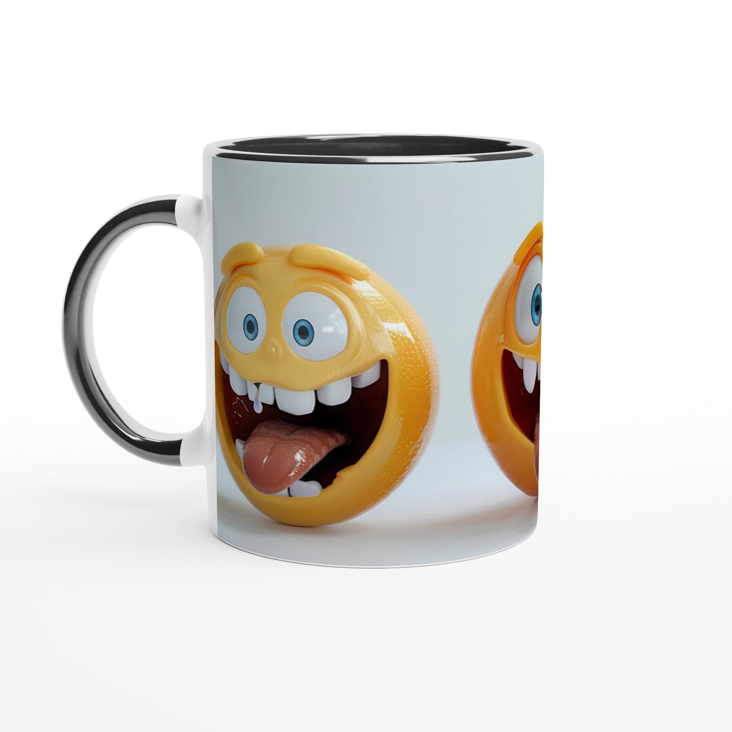 Playful cartoon emoji faces in vibrant yellow and blue bring personality to this fun mug design. Features exaggerated expressions with big eyes, goofy smiles, and silly tongues. Perfect for anyone who loves whimsical, character-based designs and wants to add some humor to their daily coffee or tea routine. ,