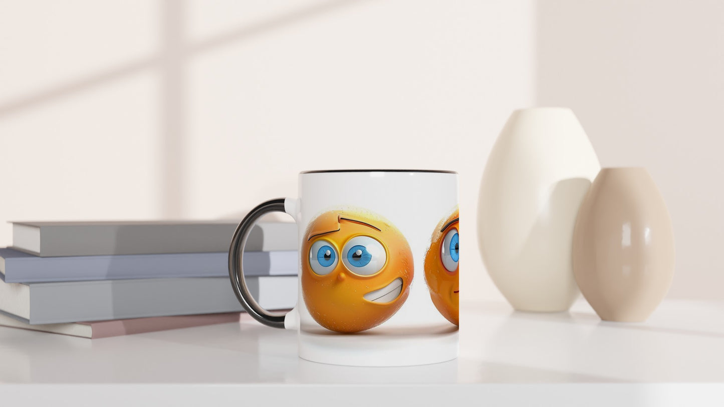 This beautiful ceramic mug is perfect for any event of the day. Your morning coffee, a hot chocolate, or any other hot beverage you enjoy. The mug is glossy white with a colored rim, inside, and handle. The prints come out beautifully and vividly on it. The print retains its quality and luster when used in both microwaves and the dishwasher.