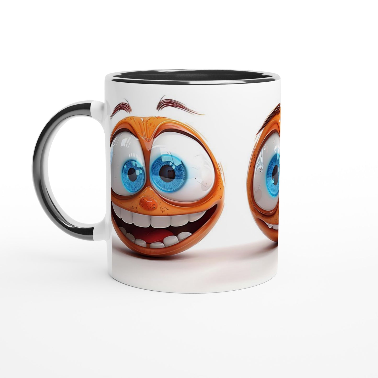 Whimsical orange character faces with vibrant blue eyes and playful expressions adorn this mug. Features three different emotional expressions with goofy smiles and exaggerated cartoon-style features. The bright orange color and expressive designs add a fun, lighthearted touch to your morning coffee routine
