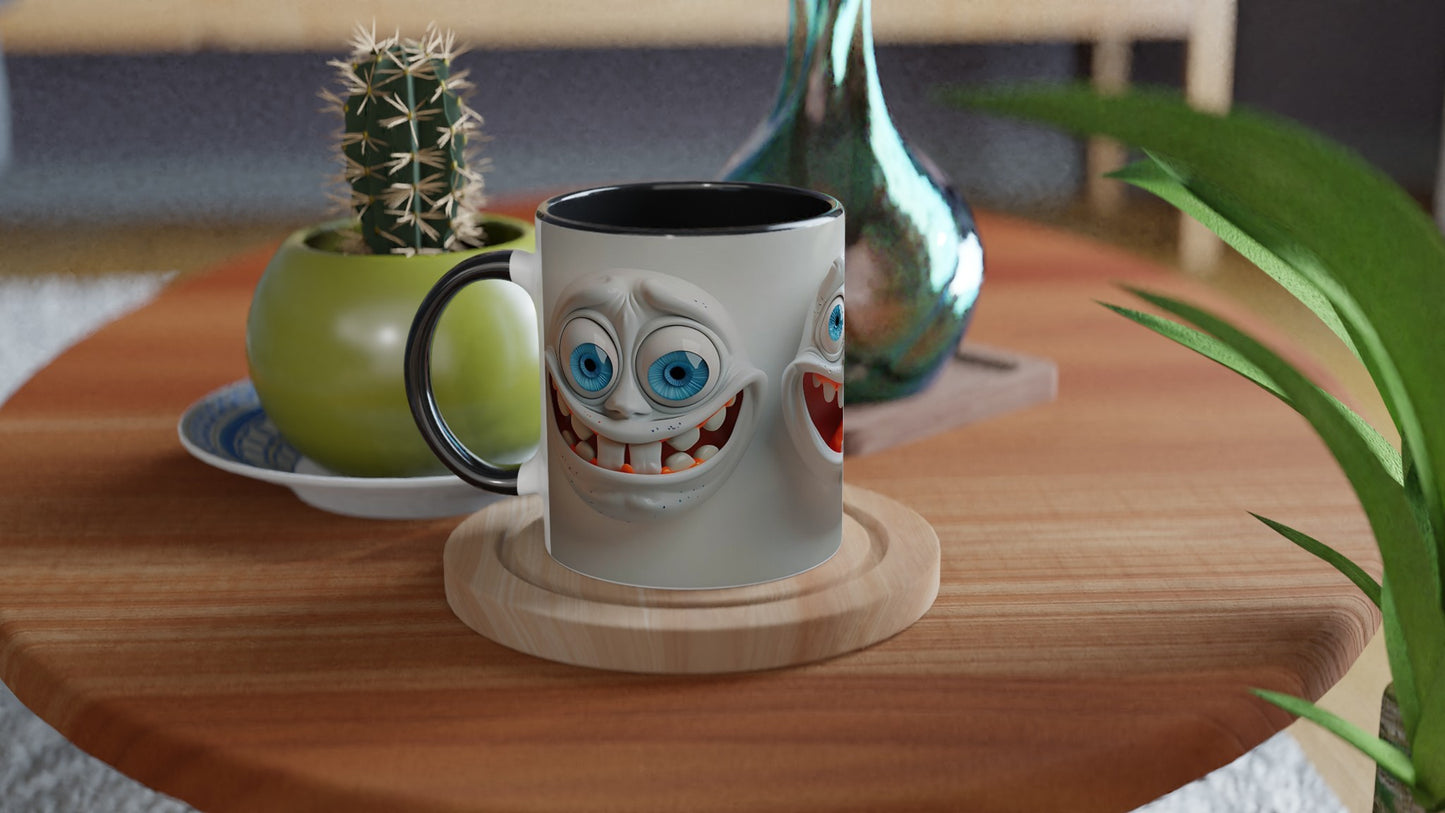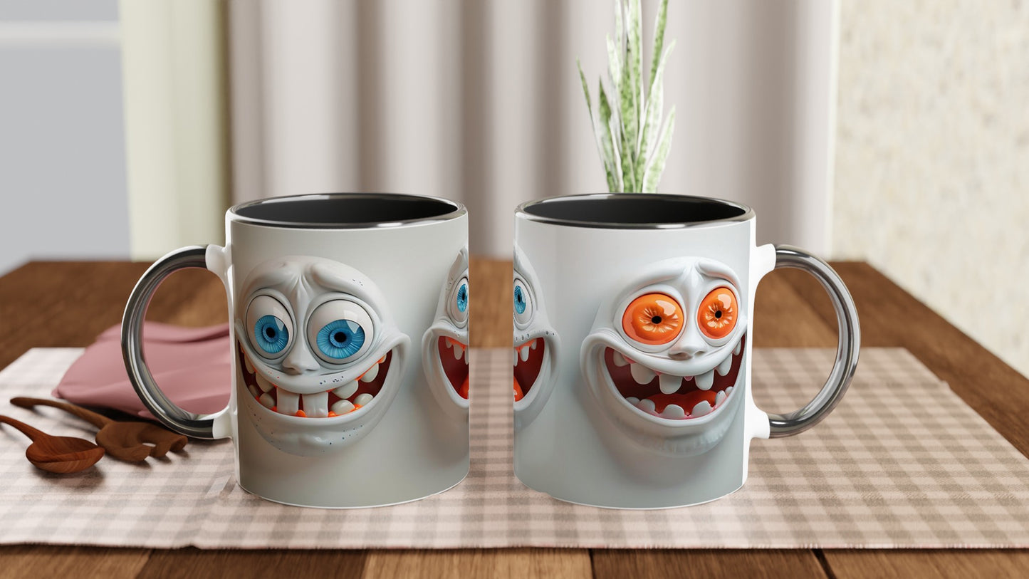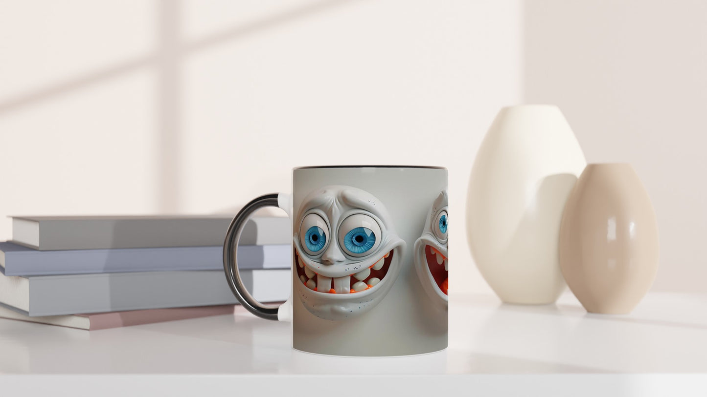 Funny Face Happy Monster Mug - Whimsical White Grinning Characters Coffee Cup