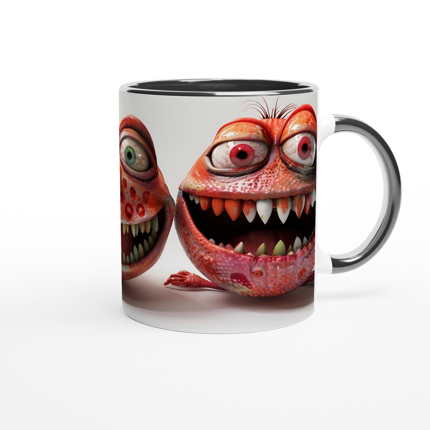 Quirky and humorous ceramic mug featuring three adorably creepy monster faces with exaggerated eyes, toothy grins, and distinctive red coloring. Each character has a unique personality with detailed textures, spots, and wild expressions that make this design both fun and slightly unsettling - perfect for those who love weird and whimsical art. ,