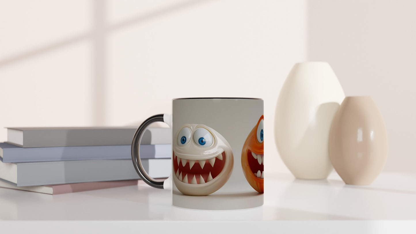 Quirky and playful mug design featuring three adorable monster faces with exaggerated expressions. Each character sports big googly eyes and comical toothy grins in white, orange, and red. Perfect for adding a dose of humor and personality to your daily coffee or tea routine