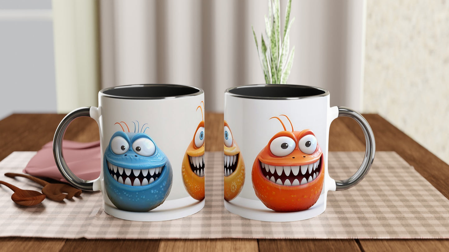 Quirky cartoon monster faces with big toothy grins and expressive googly eyes bring personality to this fun design. Features three adorable creatures in vibrant blue, yellow, and orange colors, each with unique expressions and whimsical details that are sure to bring smiles to your morning coffee routine