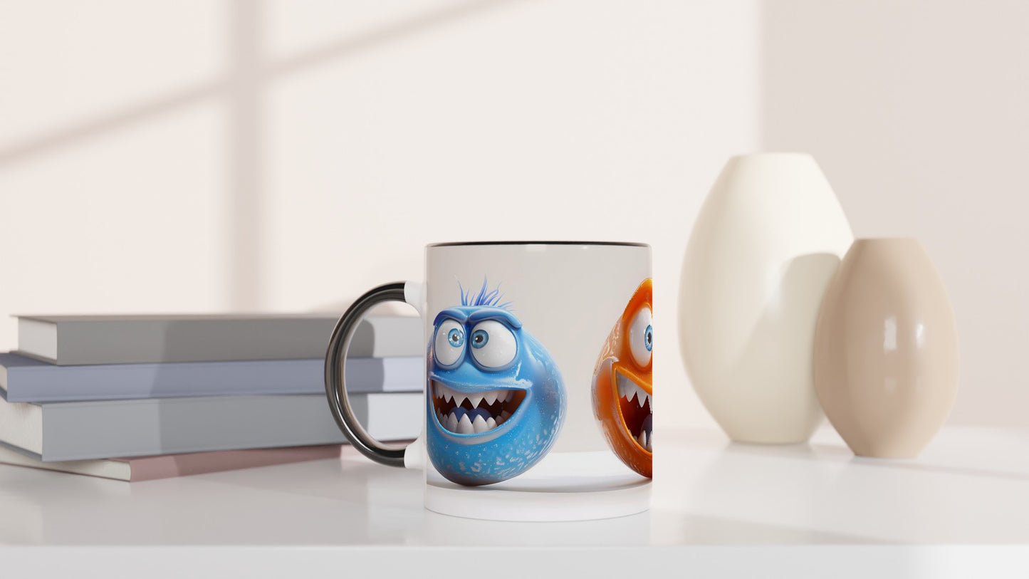 Quirky and playful monster faces in vibrant blue and orange bring personality to your morning coffee. Features three adorable cartoon creatures with exaggerated expressions, big googly eyes, and toothy grins. Perfect for anyone who loves whimsical, character-driven designs and wants to start their day with a smile.