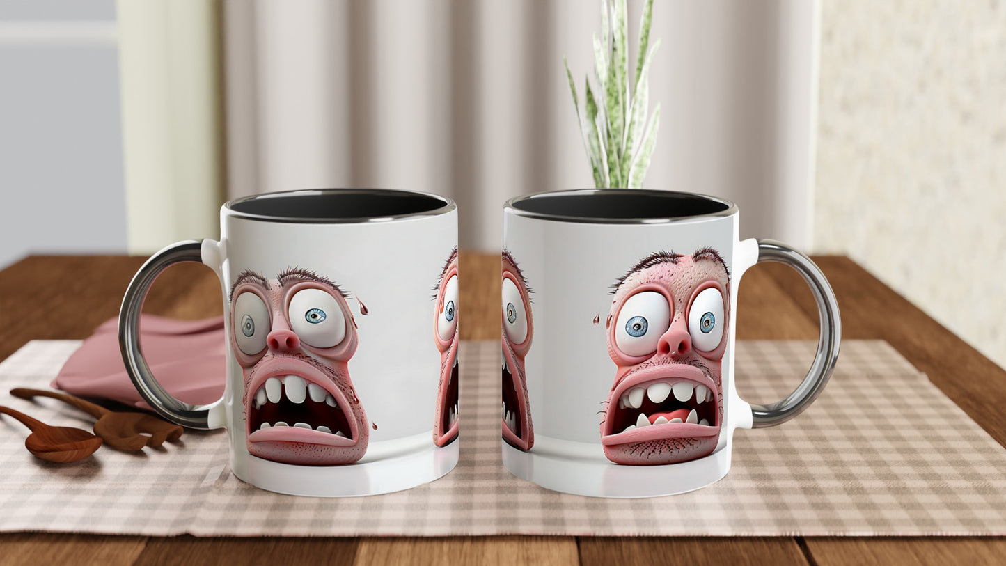 This beautiful ceramic mug is perfect for any event of the day. Your morning coffee, a hot chocolate, or any other hot beverage you enjoy. The mug is glossy white with a colored rim, inside, and handle. The prints come out beautifully and vividly on it. The print retains its quality and luster when used in both microwaves and the dishwasher.