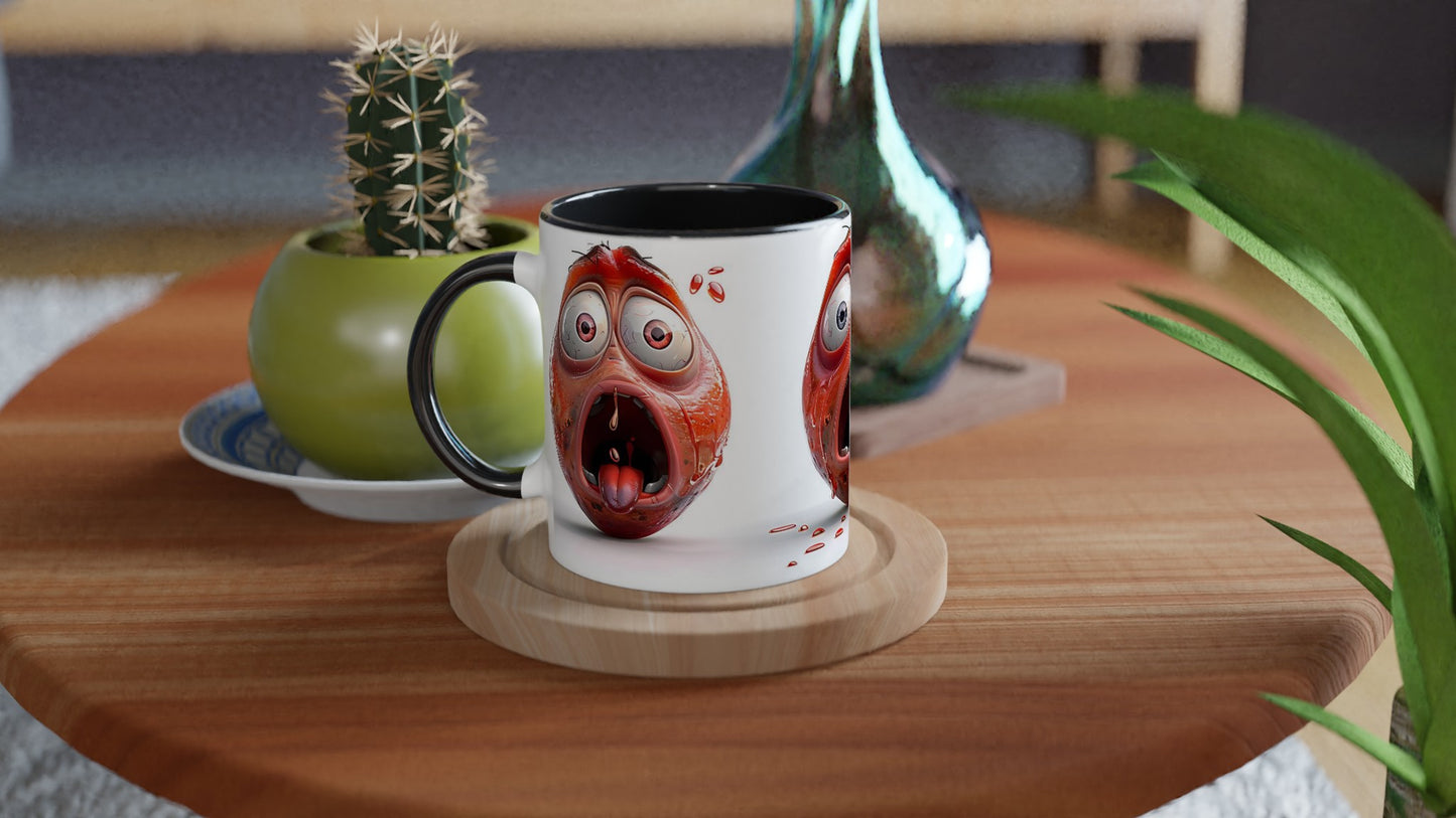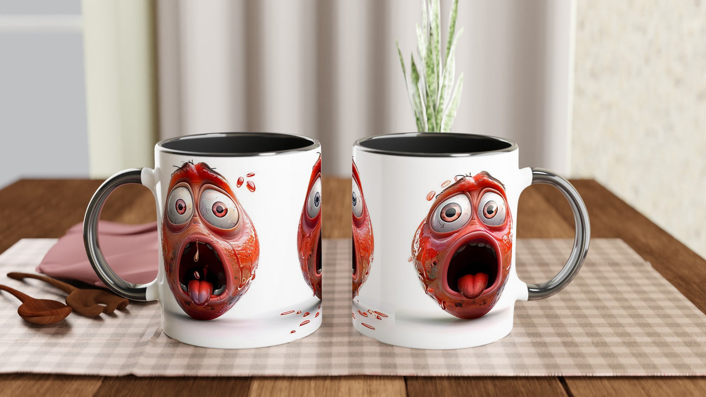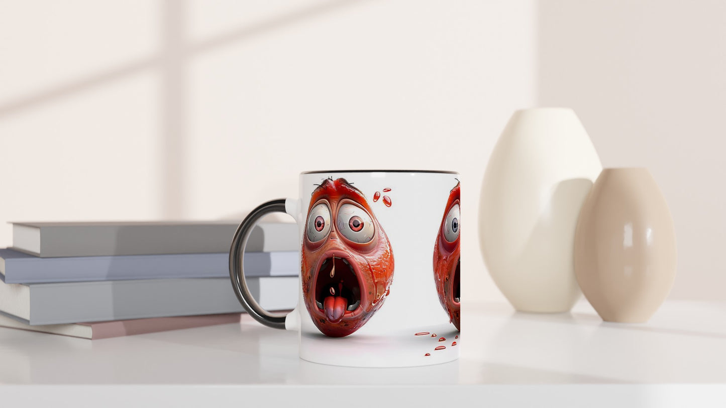 This beautiful ceramic mug is perfect for any event of the day. Your morning coffee, a hot chocolate, or any other hot beverage you enjoy. The mug is glossy white with a colored rim, inside, and handle. The prints come out beautifully and vividly on it. The print retains its quality and luster when used in both microwaves and the dishwasher.
