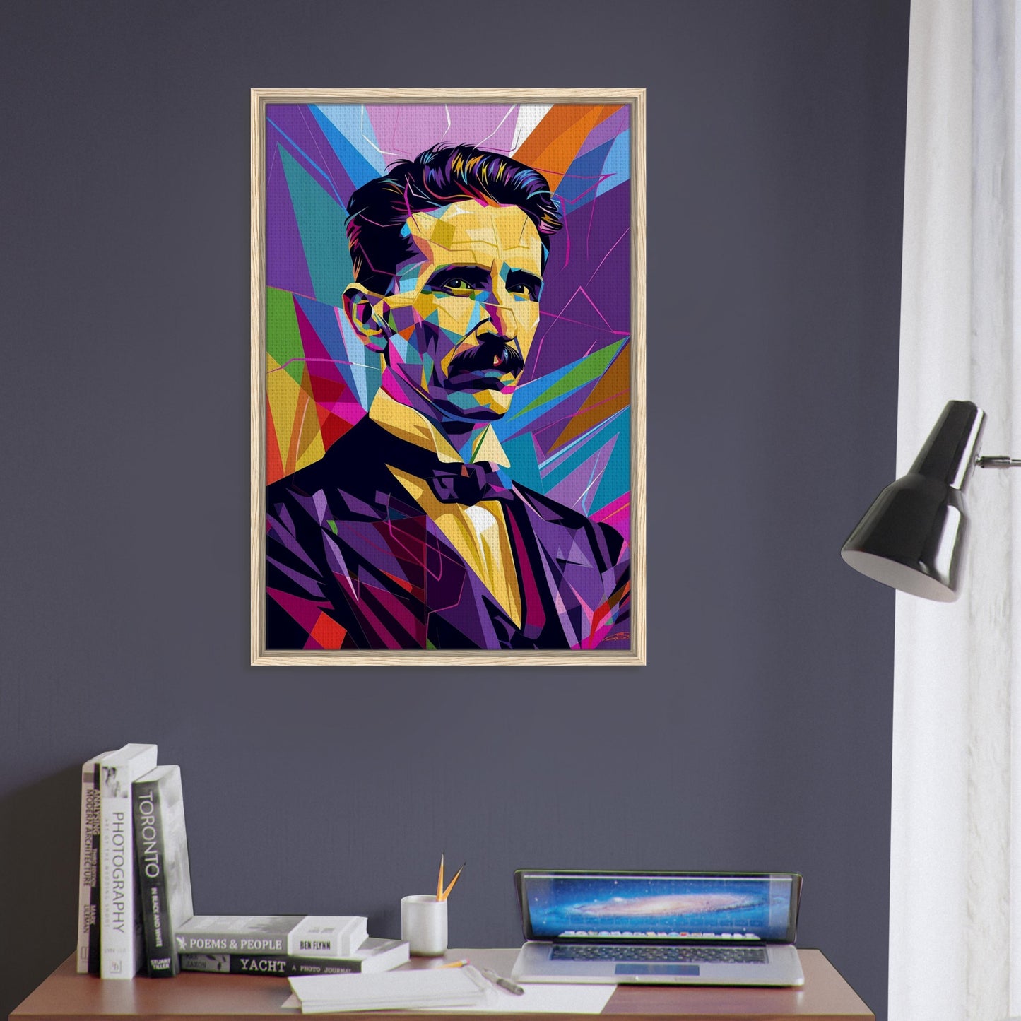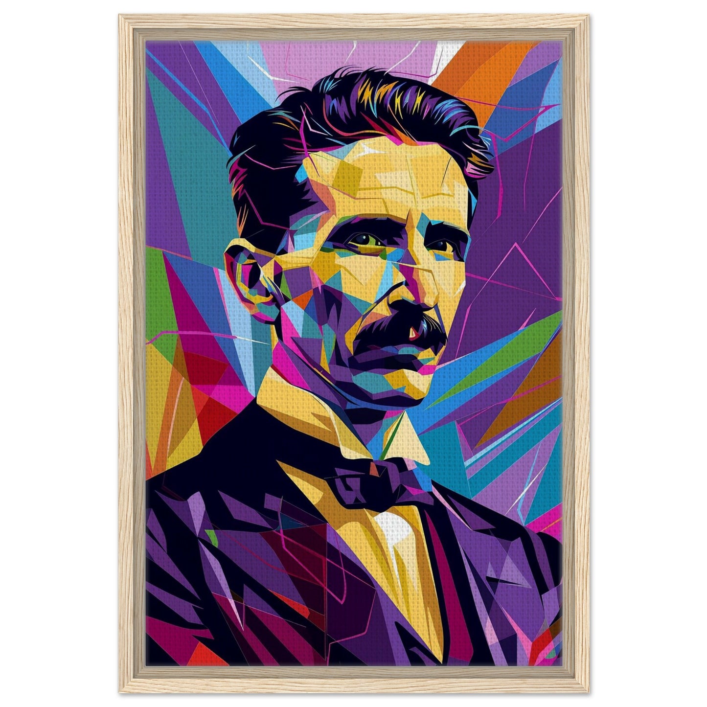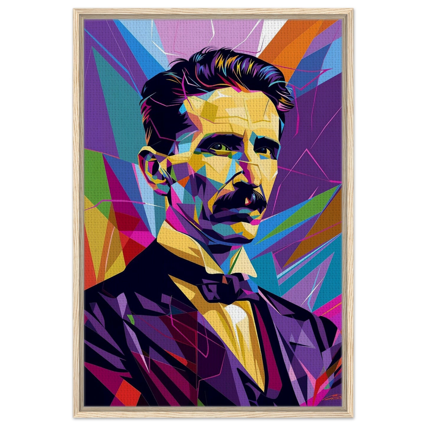 Bold geometric portrait rendered in vibrant WPAP style, featuring striking angular shapes and a dynamic color palette. Deep purples and blues contrast with bright yellows and oranges, creating a modern, polygonal interpretation. The composition showcases sharp lines and colorful facets against a kaleidoscopic background of intersecting shapes