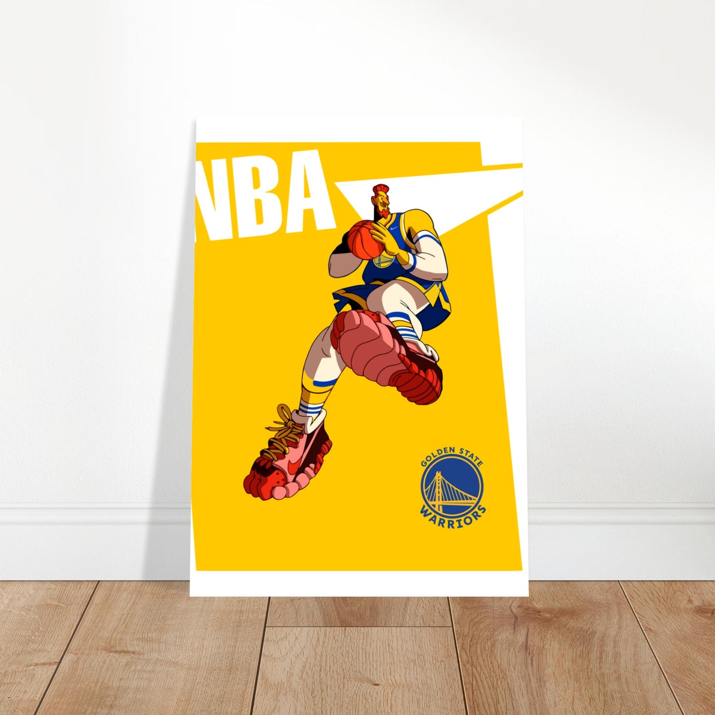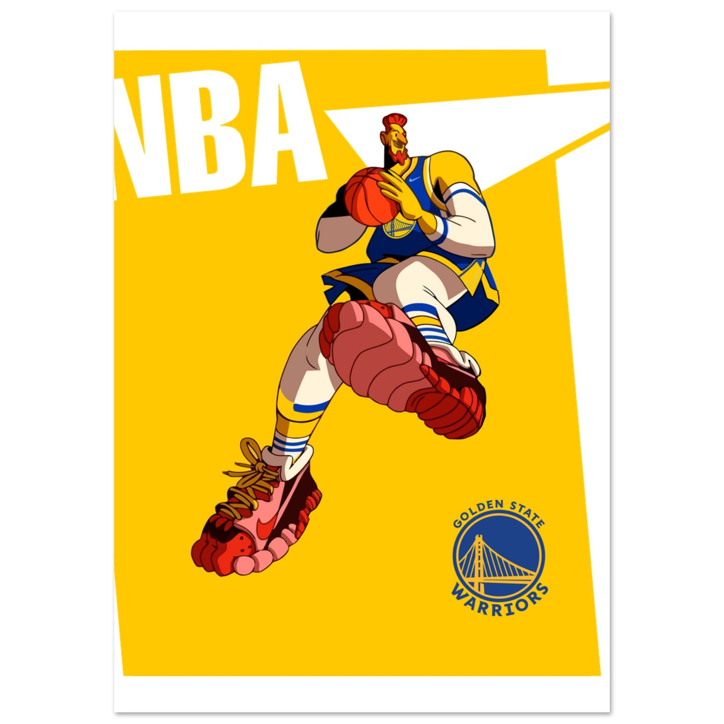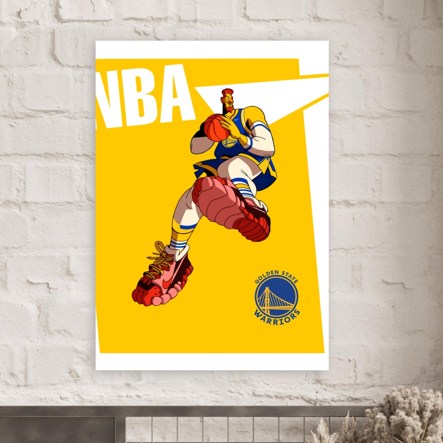 Dynamic illustration featuring a basketball player in motion, showcasing the Golden State Warriors team colors. Set against a vibrant yellow background with bold NBA branding, this stylized artwork captures the energy and movement of professional basketball with a modern, artistic flair. Perfect for fans of the Warriors and basketball enthusiasts