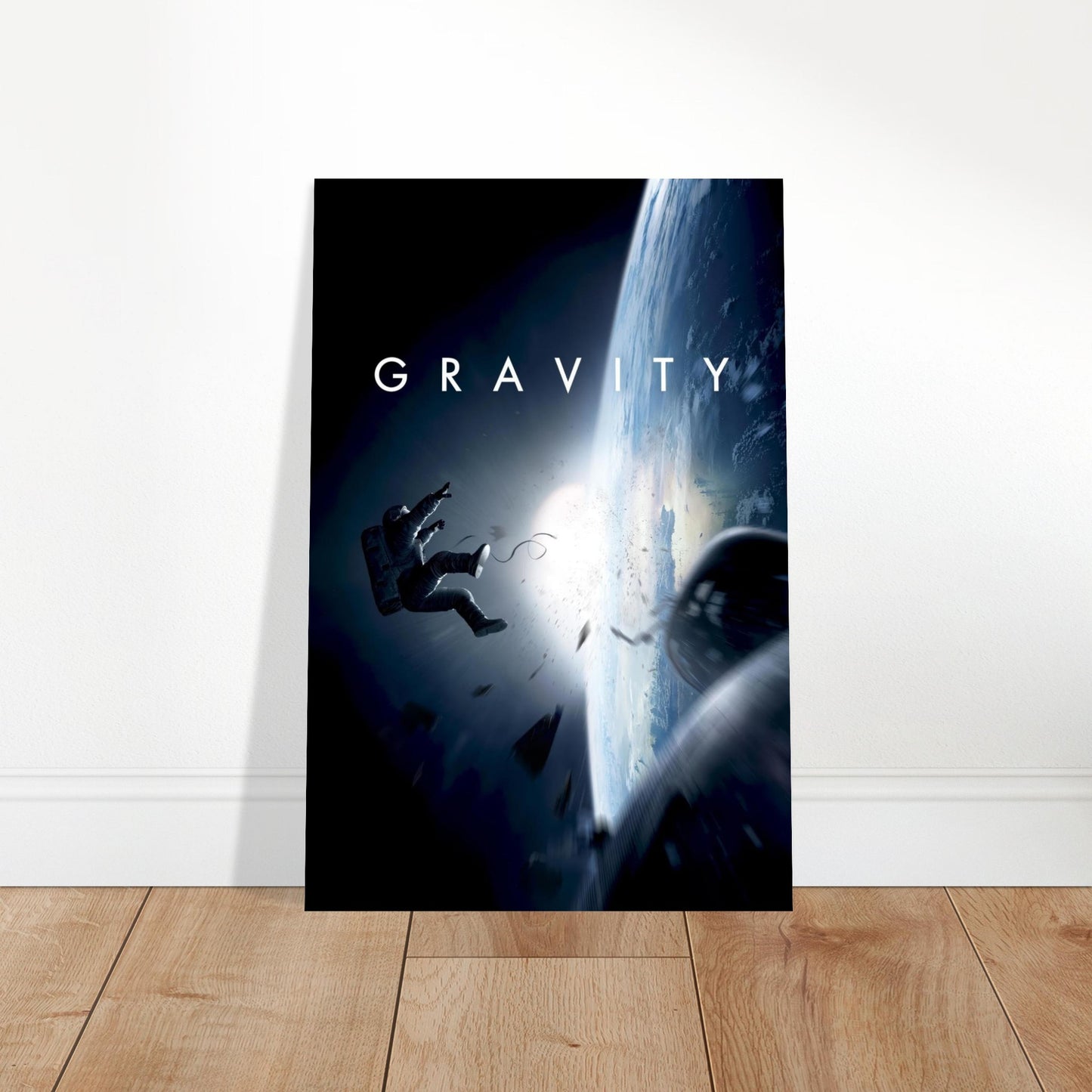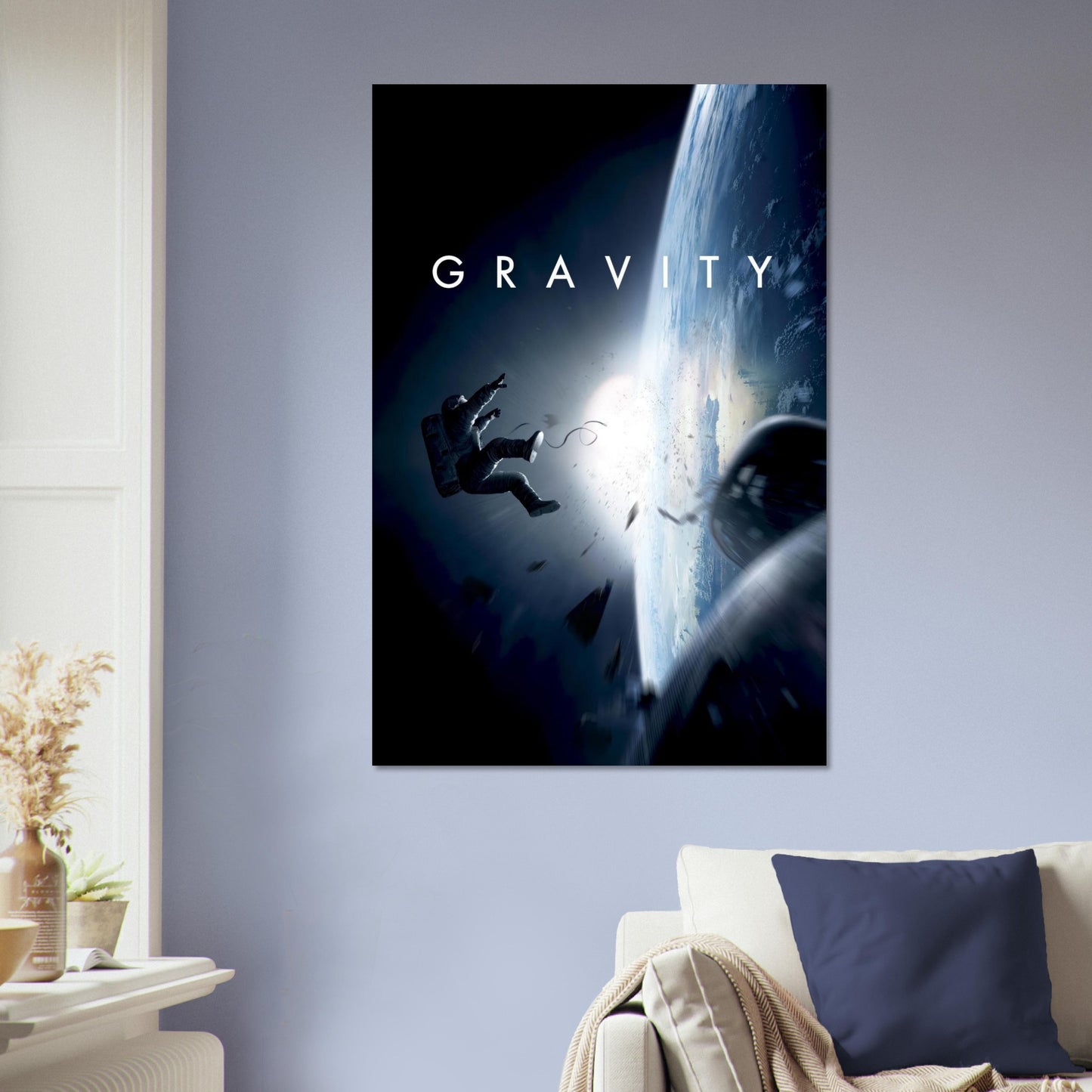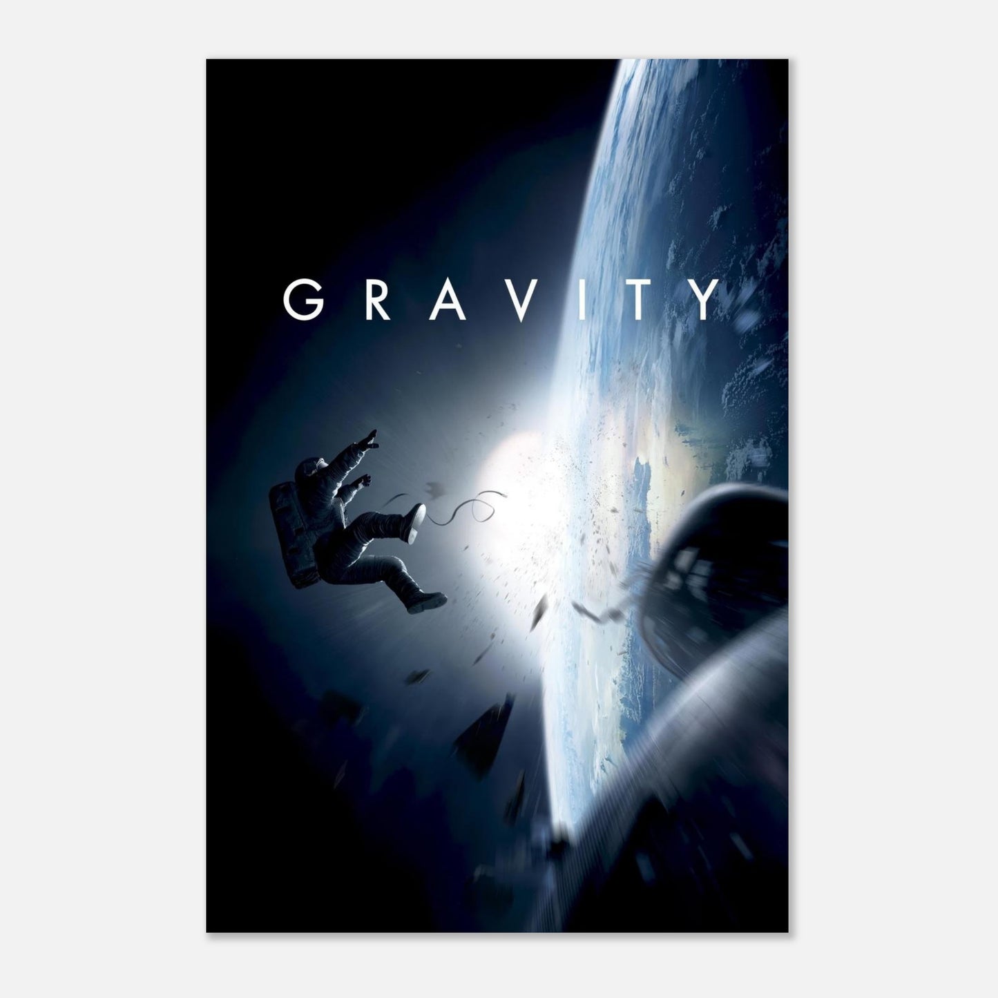 A stunning sci-fi movie poster featuring a lone astronaut drifting in the vast darkness of space. The Earth curves dramatically in the background, its brilliant blue atmosphere contrasting with the infinite black void. Debris floats ominously in zero gravity, creating a tense and atmospheric scene