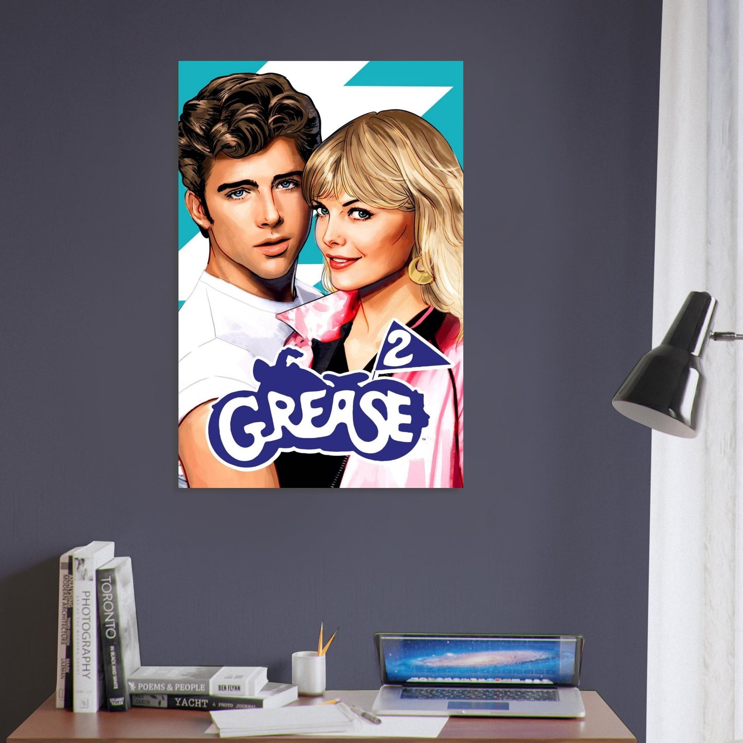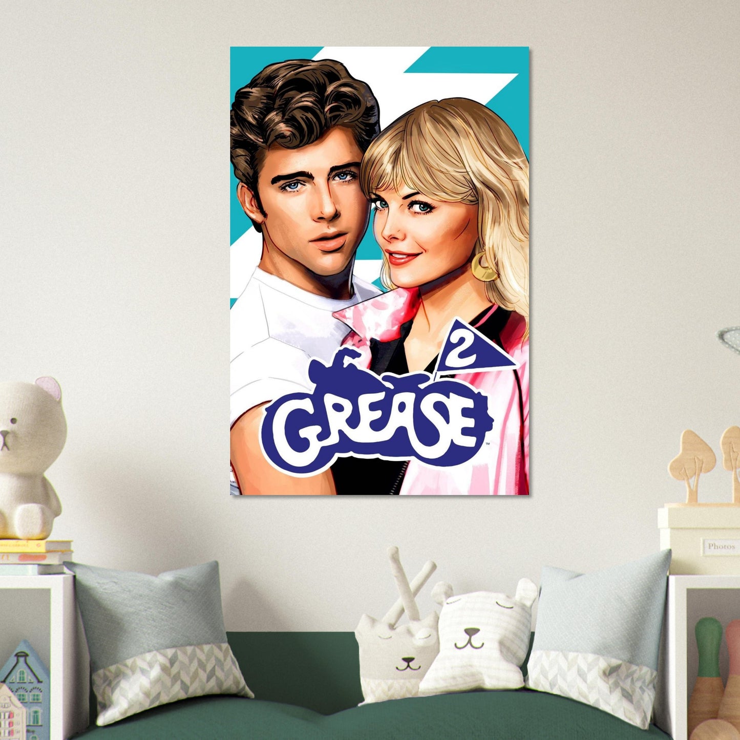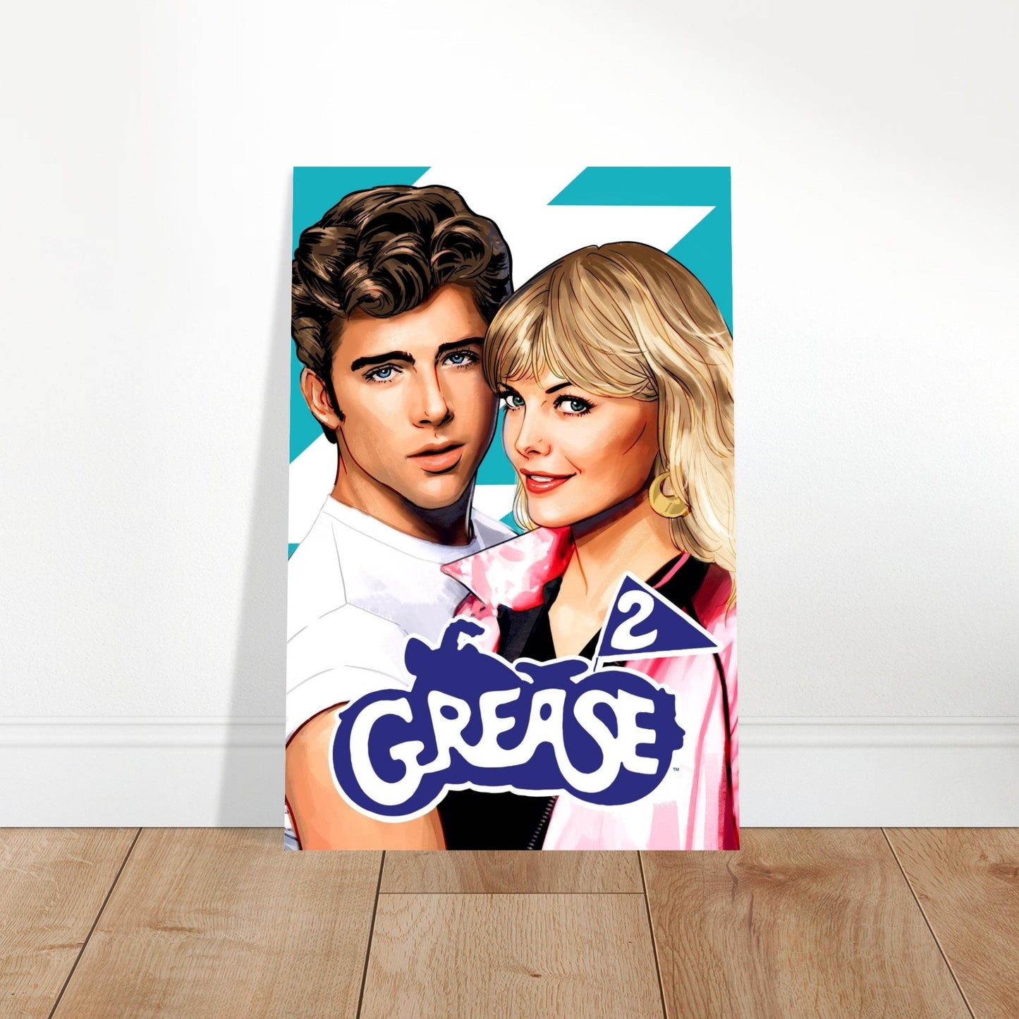 A vibrant, retro-style illustration capturing the romantic leads from the iconic musical sequel against a turquoise background with white lightning bolts. The artwork features bold colors with a pink and white color scheme, complemented by the classic blue Grease 2 logo. The illustration style is clean and polished with a distinctly 80s aesthetic.