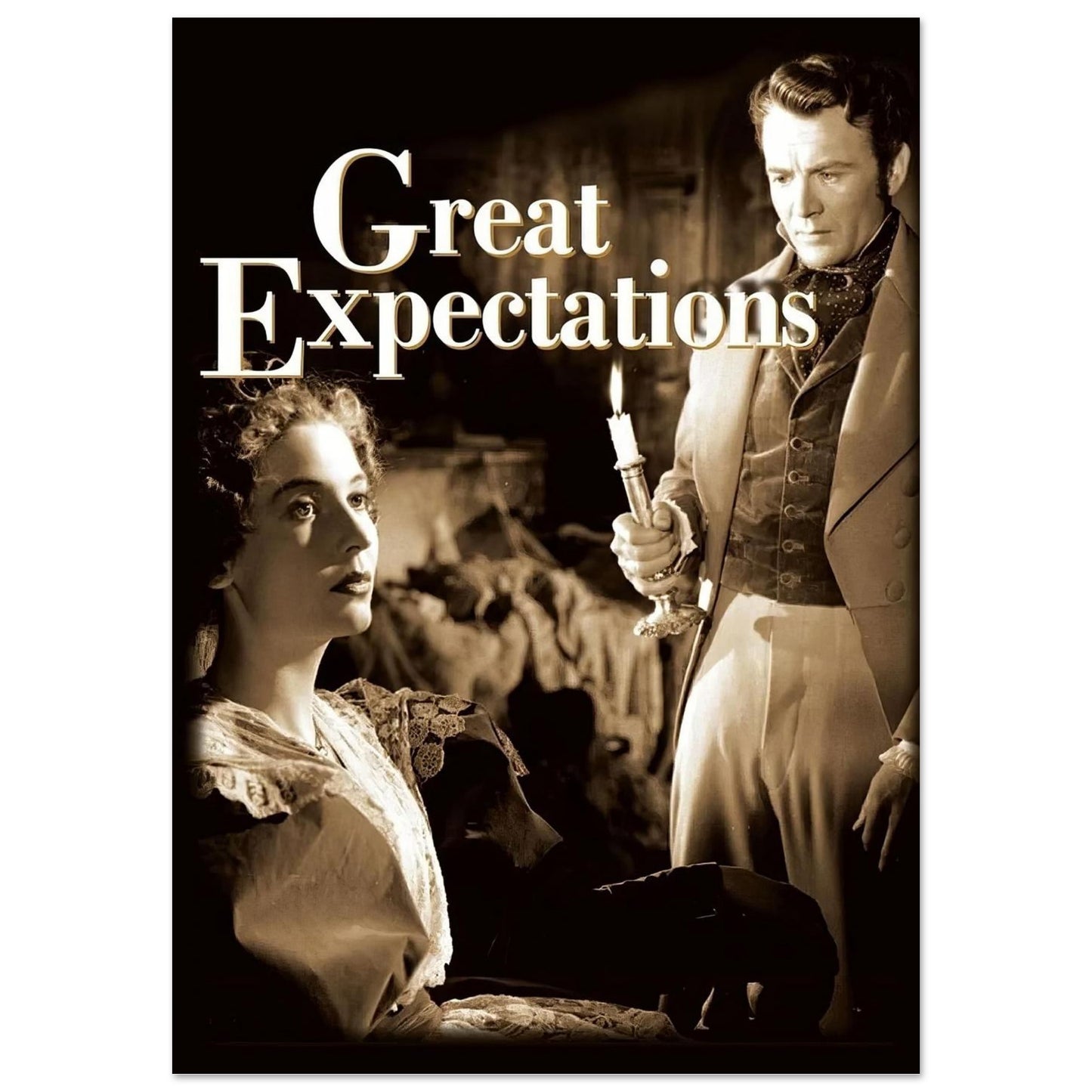 A dramatic black and white movie poster featuring a striking scene from the 1946 film adaptation of Charles Dickens' Great Expectations. The composition captures a gothic atmosphere with candlelight illuminating dramatic shadows and period costumes, embodying the classic film noir aesthetic of 1940s cinema