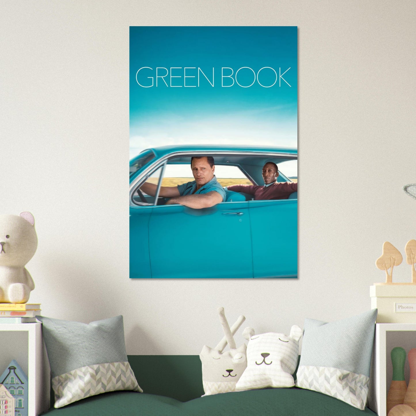 A striking movie poster design featuring a teal vintage car against a gradient turquoise background. The minimalist typography of 'GREEN BOOK' creates a powerful contrast with the nostalgic 1960s imagery. The composition captures the essence of a classic road trip film with its retro aesthetic and atmospheric color palette