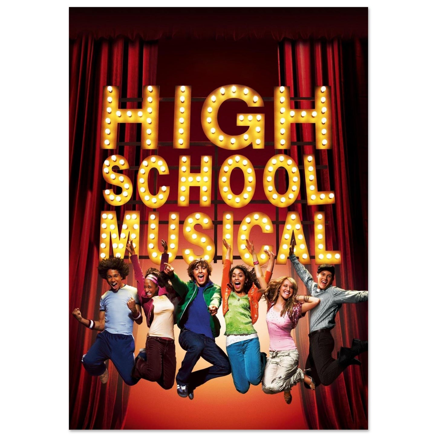 A vibrant theatrical poster featuring illuminated marquee letters spelling 'HIGH SCHOOL MUSICAL' against rich red stage curtains. The classic Broadway-style lighting design showcases yellow bulb letters that pop dramatically against the deep red background, creating an authentic vintage theater atmosphere